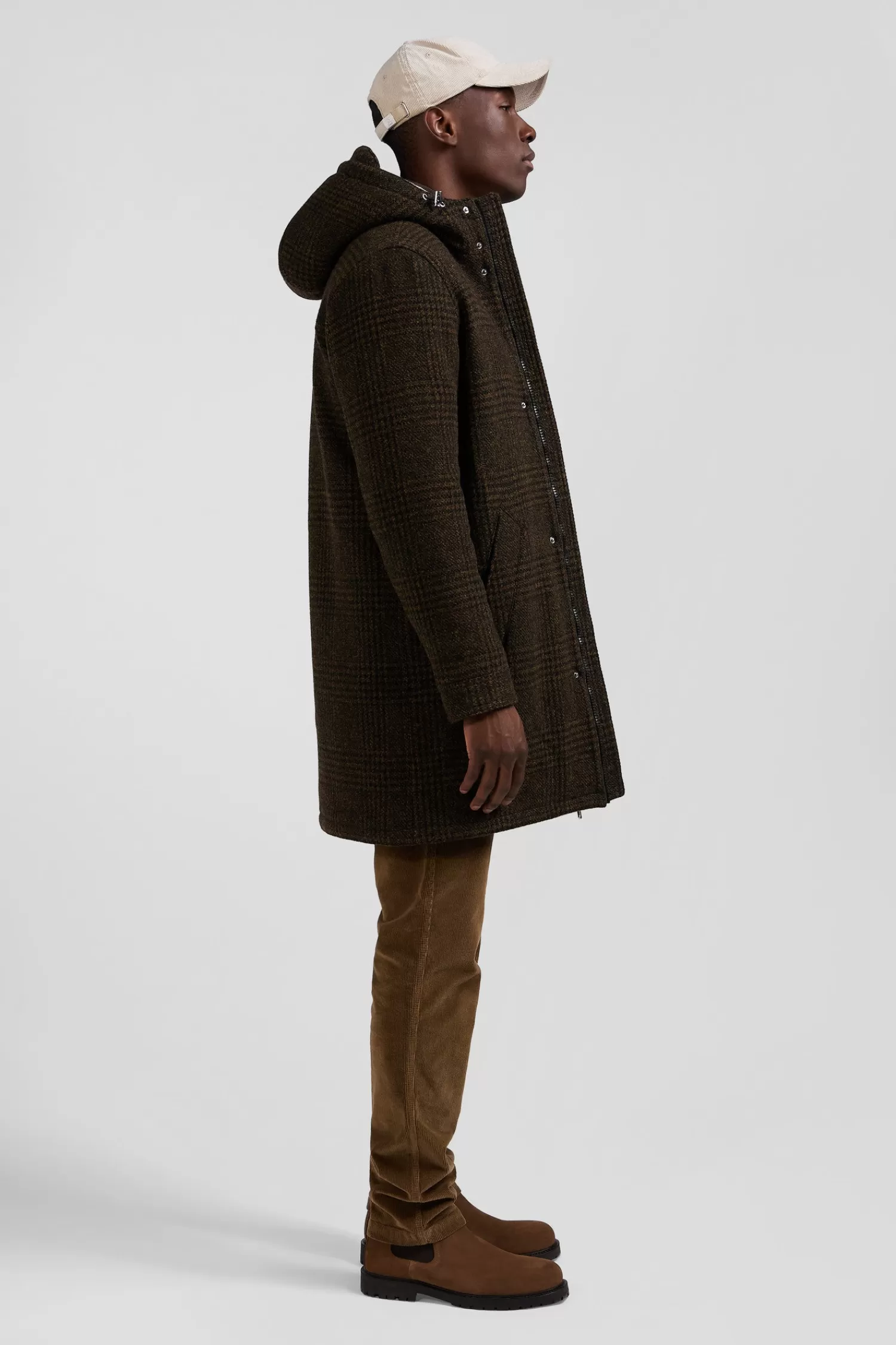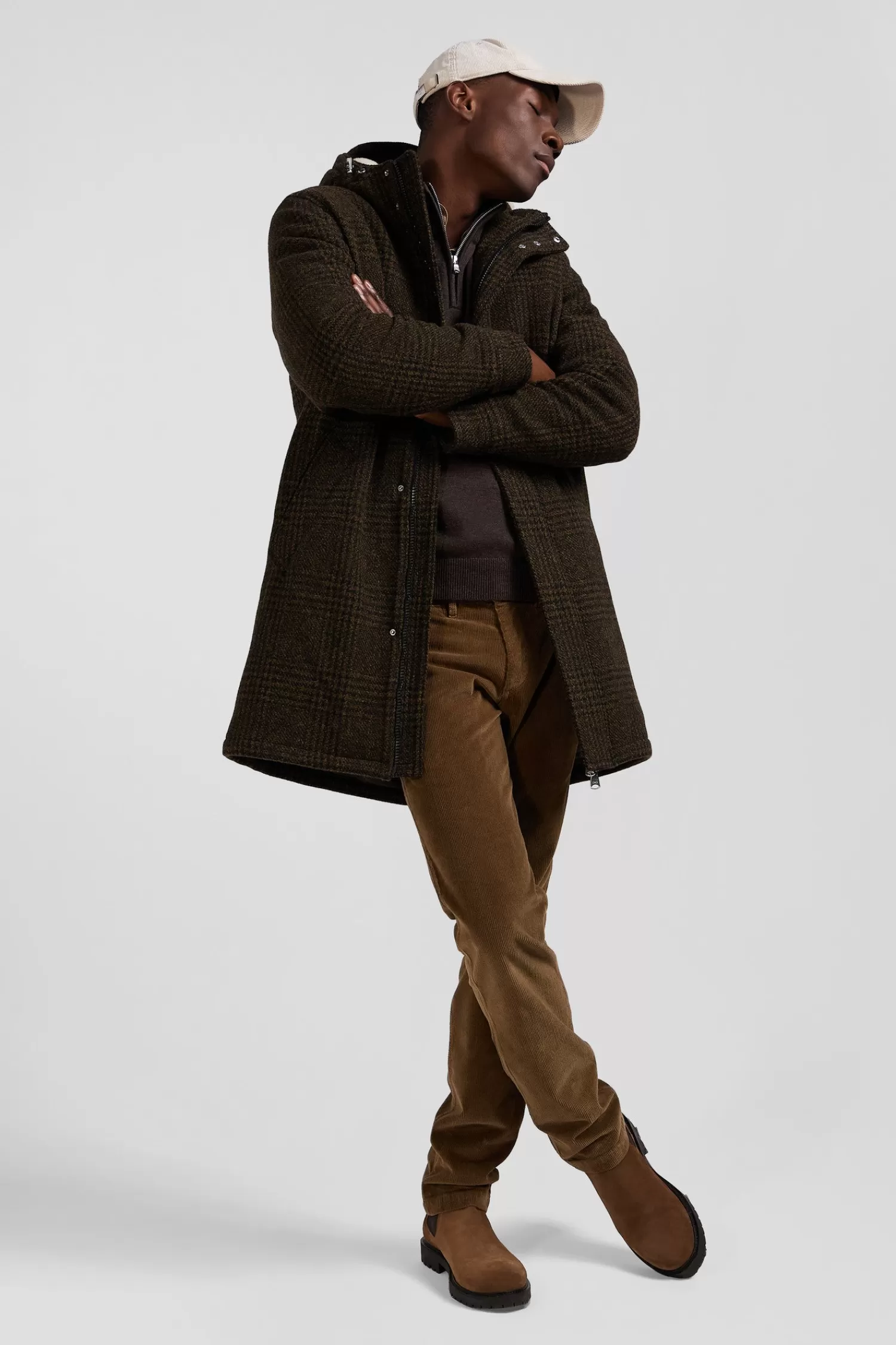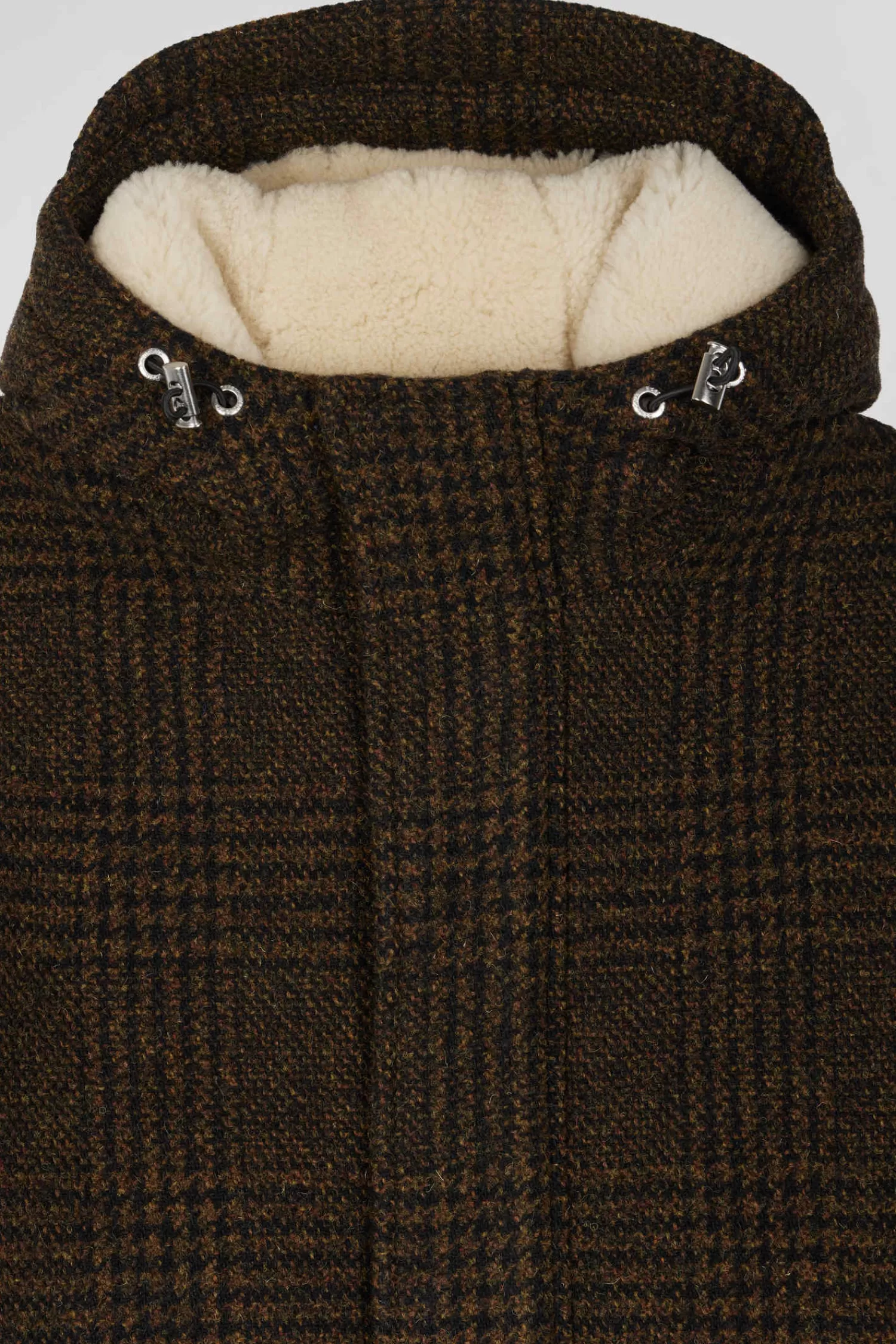 This masculine parka is made of pure brown wool and features a Prince of Wales check pattern. This classic piece is equipped with an integrated, adjustable hood, perfect for taking on the elements in style. The cuffs have branded button fasteners, while a silicone rubber badge featuring our pink bow tie logo on the sleeve adds a touch of distinction. The tricolor ribbon, another signature of the Maison, discreetly decorates this wool parka. Ideal for cold days in the city, this parka combines functionality and elegance.