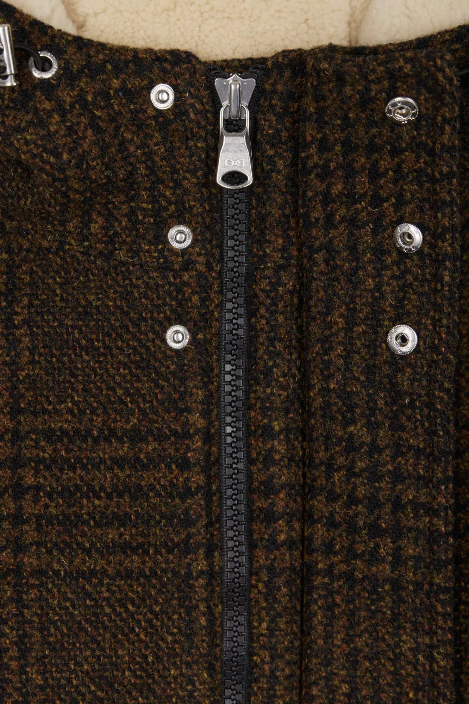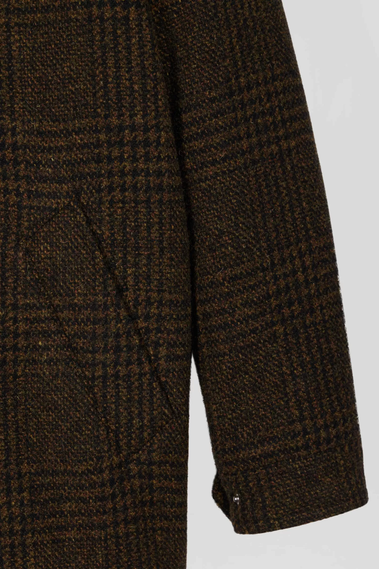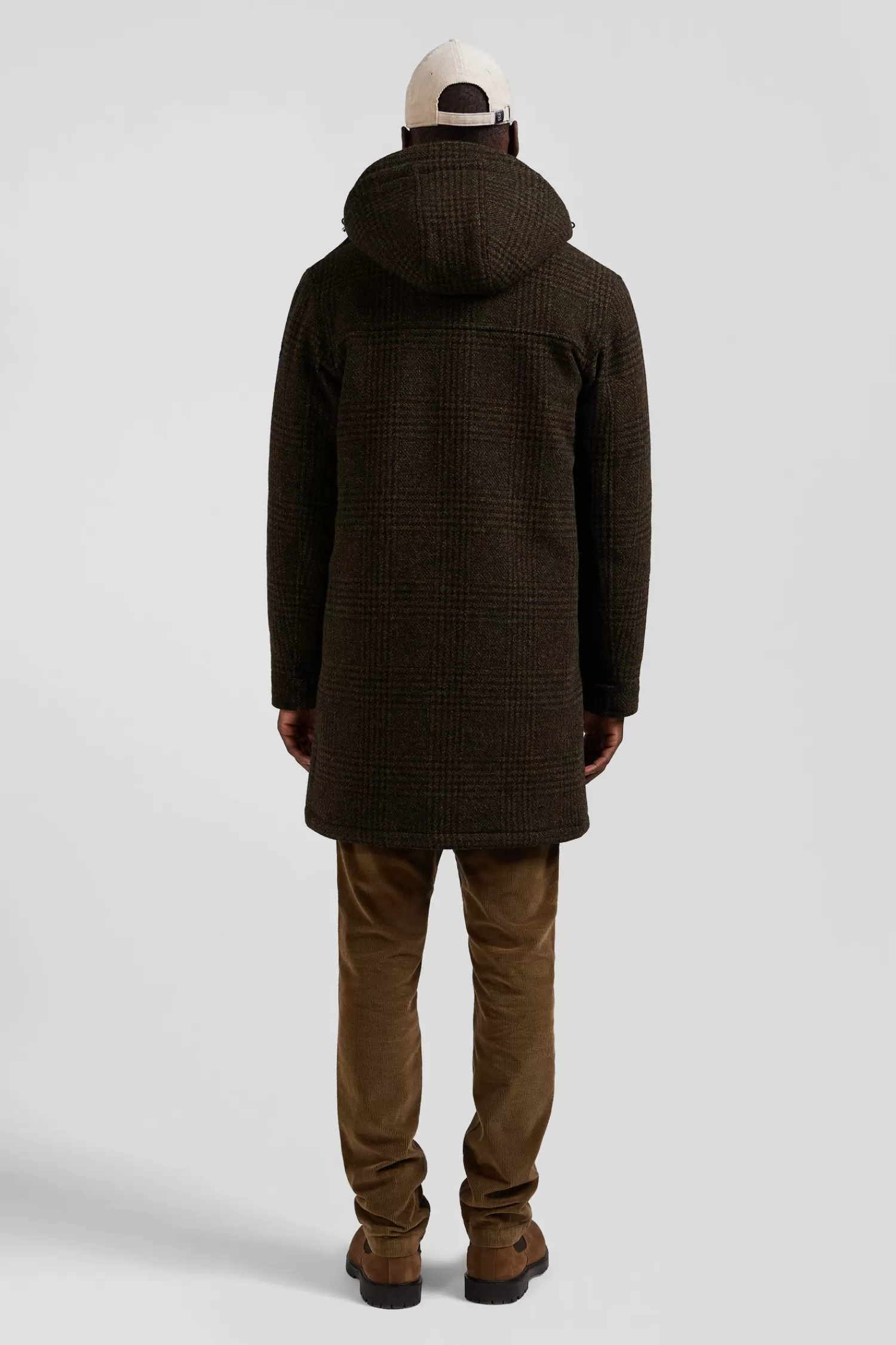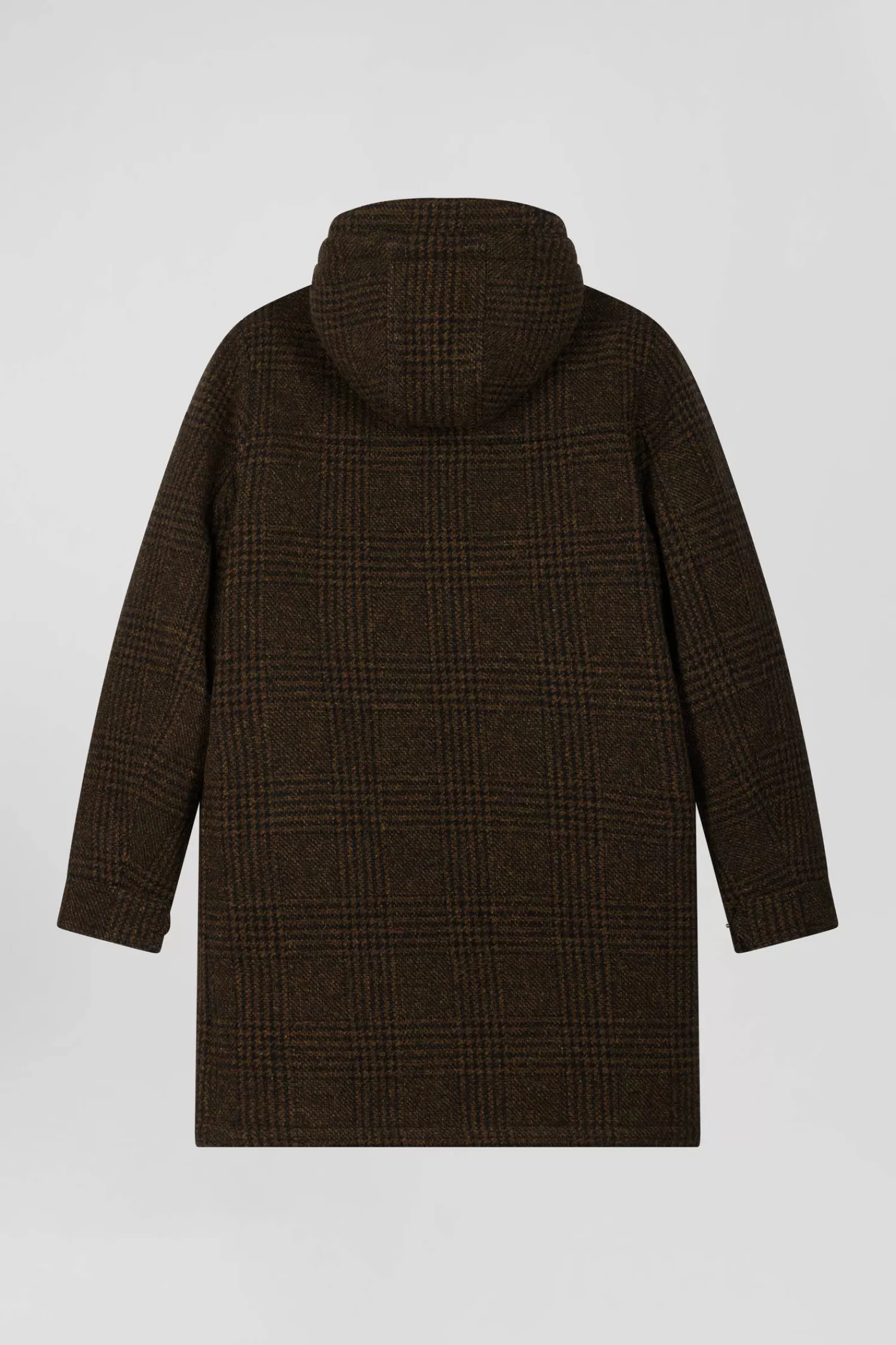 This masculine parka is made of pure brown wool and features a Prince of Wales check pattern. This classic piece is equipped with an integrated, adjustable hood, perfect for taking on the elements in style. The cuffs have branded button fasteners, while a silicone rubber badge featuring our pink bow tie logo on the sleeve adds a touch of distinction. The tricolor ribbon, another signature of the Maison, discreetly decorates this wool parka. Ideal for cold days in the city, this parka combines functionality and elegance.