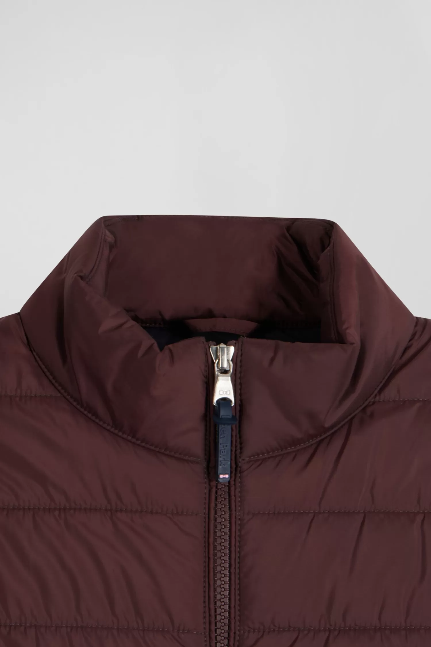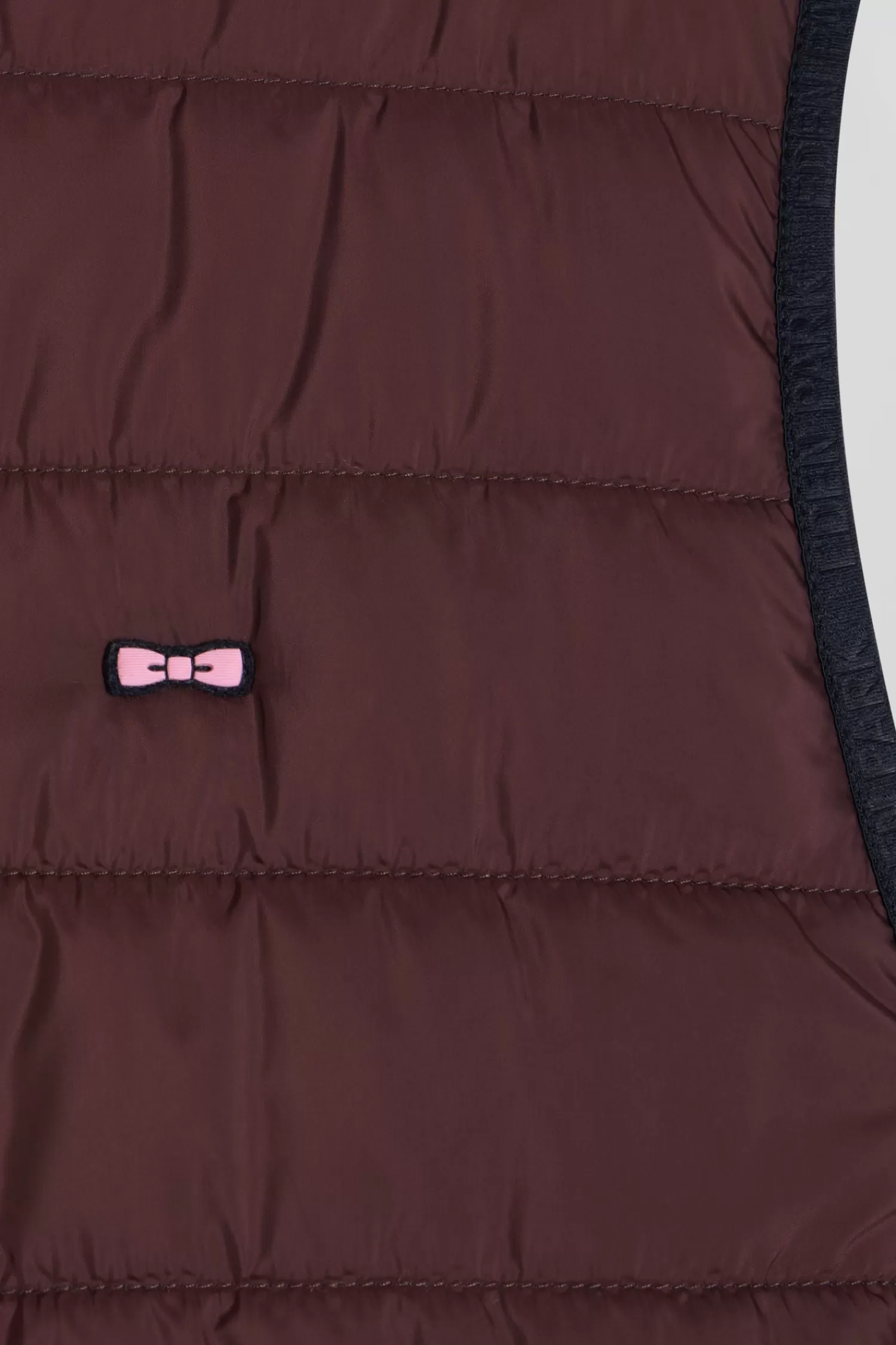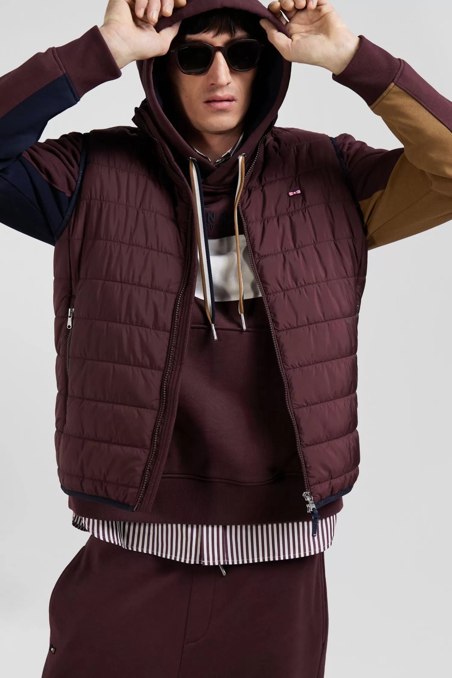 Our sleeveless down vest is ideal for layering. Made from sturdy nylon, it features a branded zipper closure, secure pockets, and refined details like bow tie embroidery and contrast piping around the armholes. Perfect for seasonal transitions, this men’s vest complements any outfit.