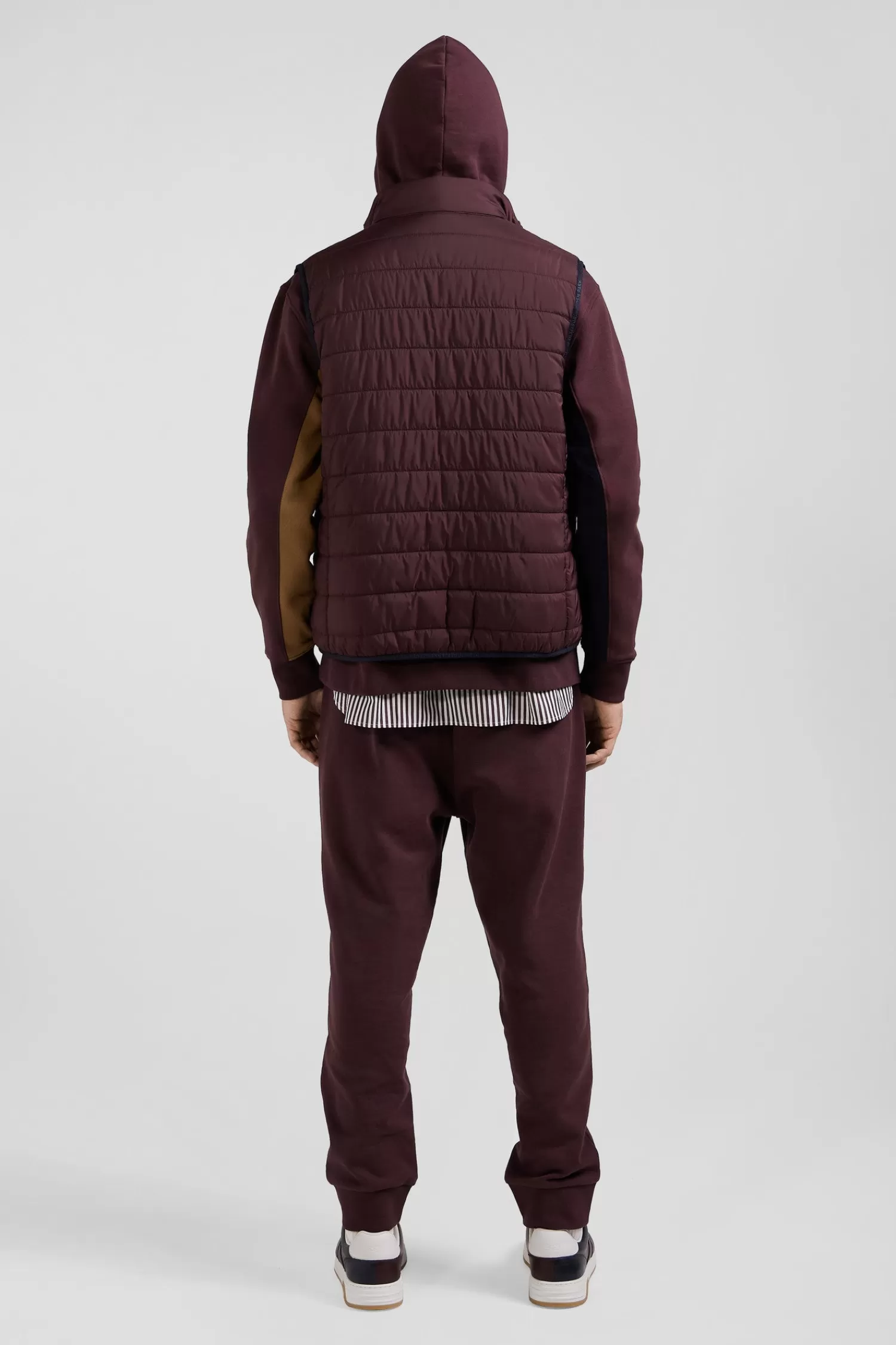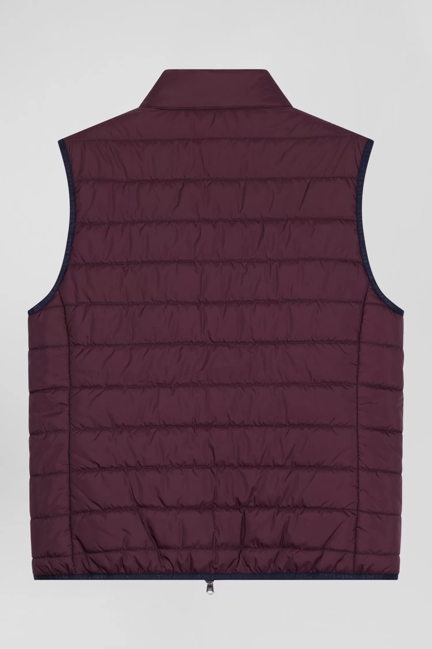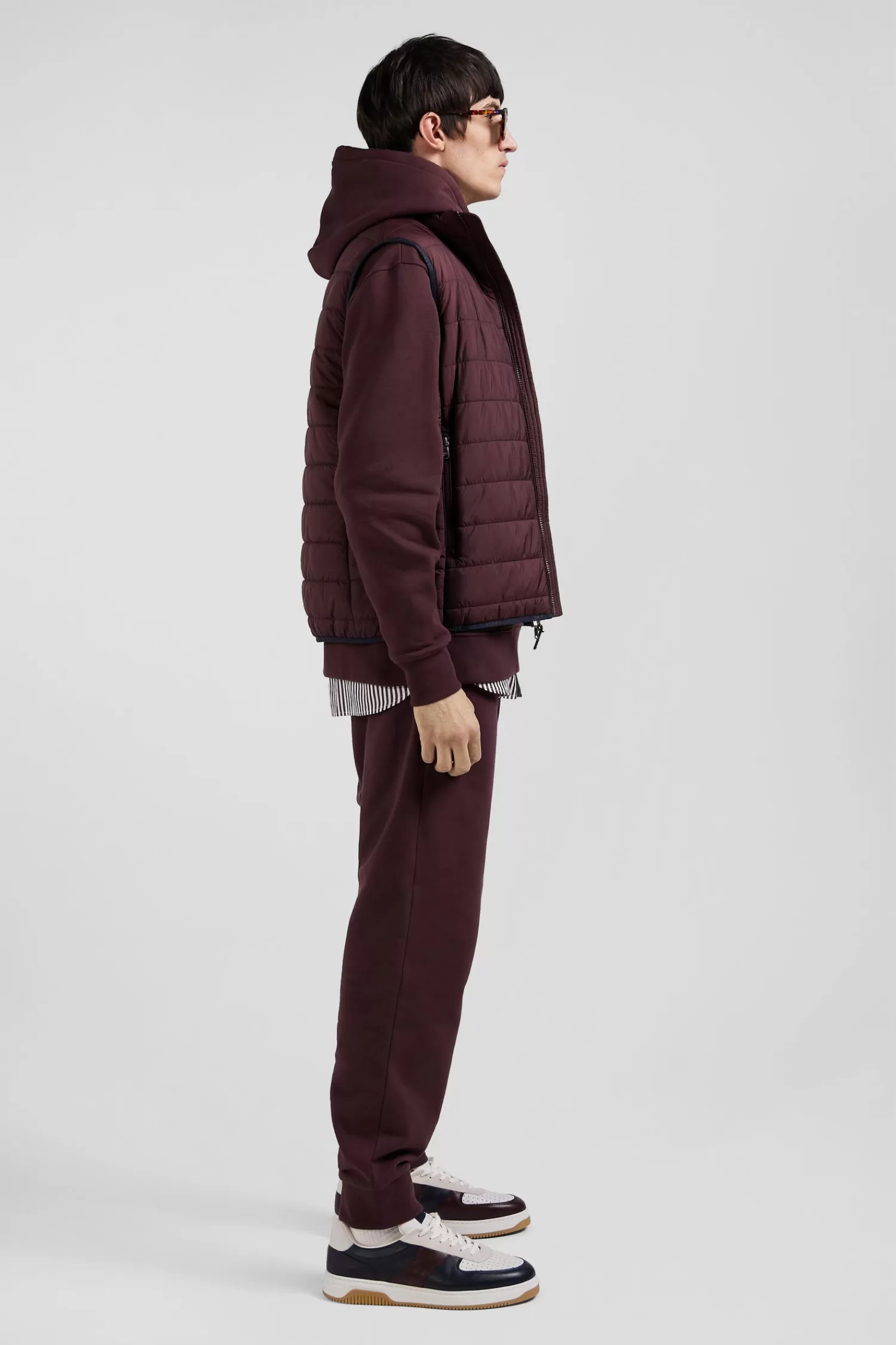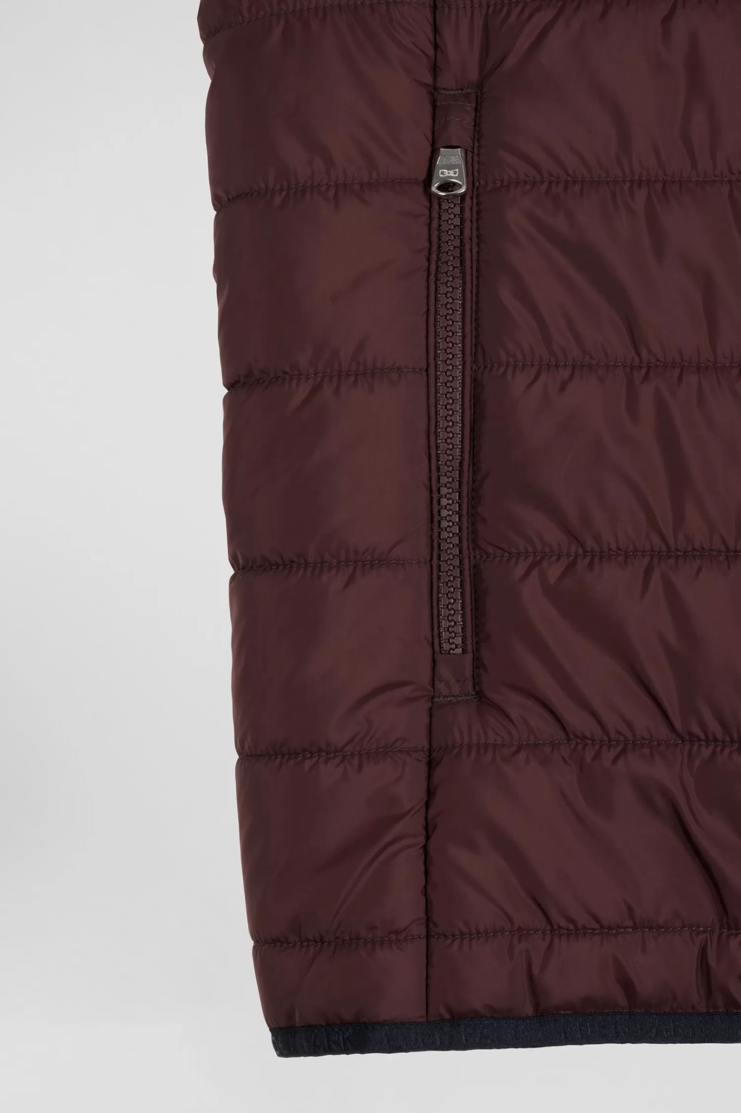 Our sleeveless down vest is ideal for layering. Made from sturdy nylon, it features a branded zipper closure, secure pockets, and refined details like bow tie embroidery and contrast piping around the armholes. Perfect for seasonal transitions, this men’s vest complements any outfit.