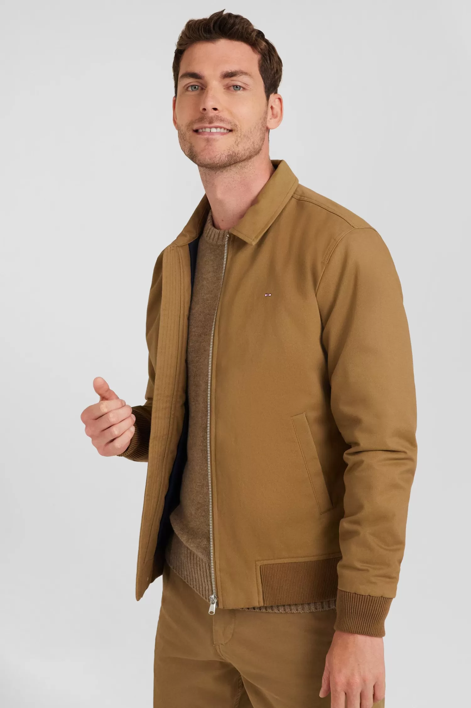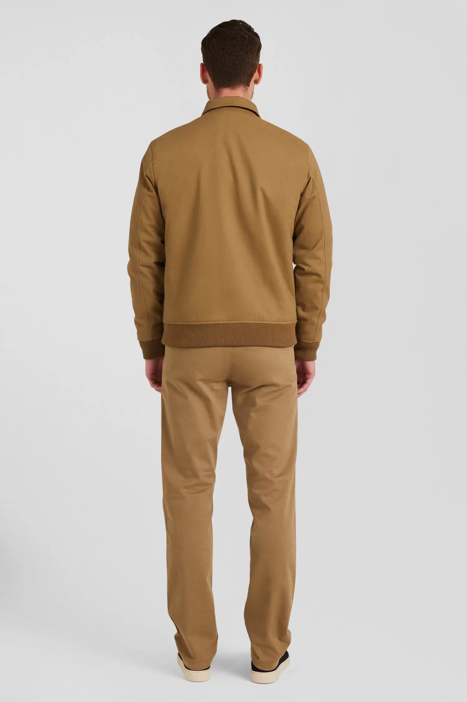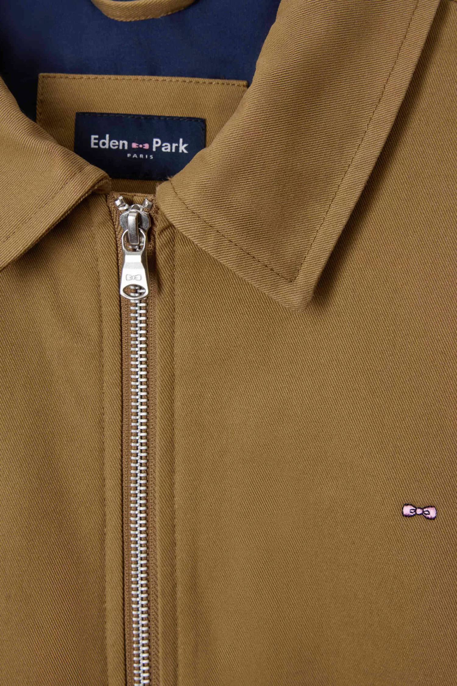 This masculine jacket in 100% cotton gabardine, available in navy or camel, is a revisited classic. With its shirt collar and a striped lining, this mid-season jacket combines elegance and comfort. Ribbed cuffs at the sleeves and waistband ensure a snug fit, while the zipper with a logo slider adds a touch of refinement. Equipped with two exterior pockets with single welt and two interior zipped pockets, this practical jacket available in camel or navy will stand by your sides in all seasons.
