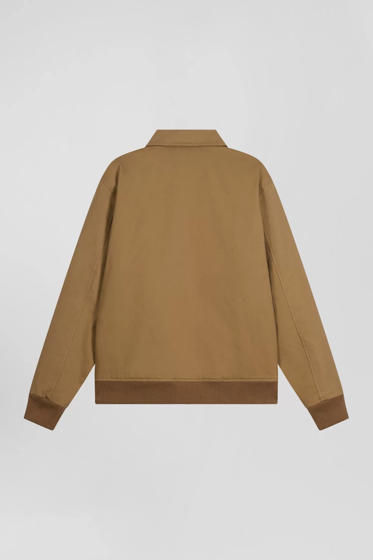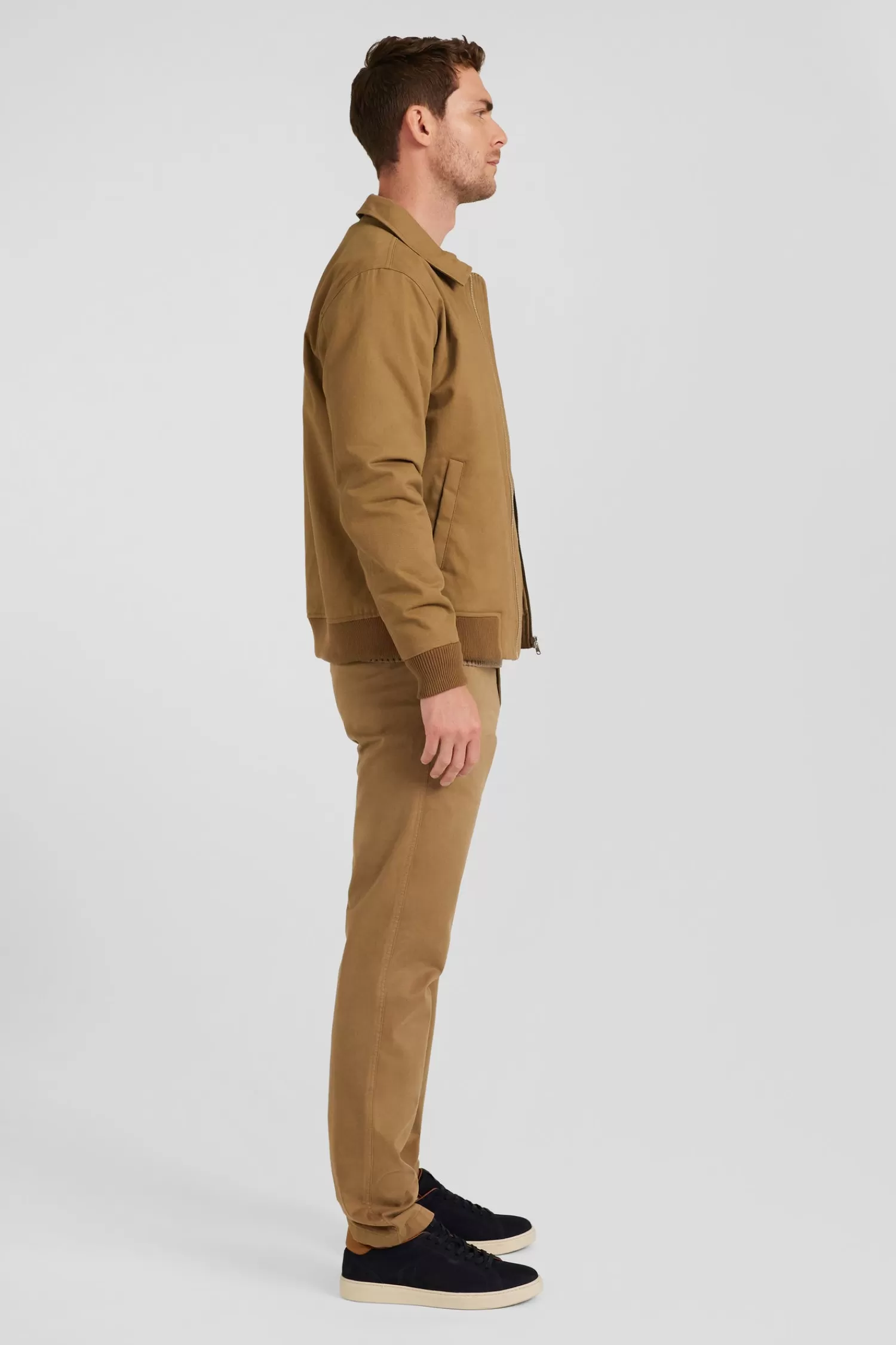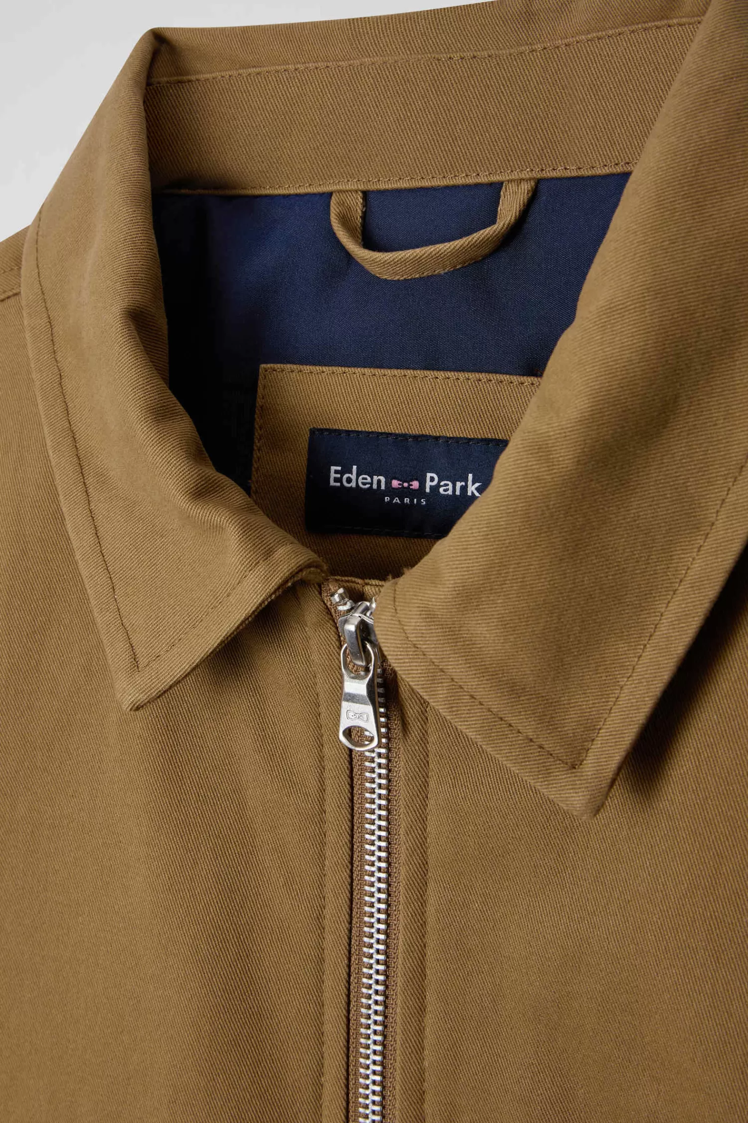 This masculine jacket in 100% cotton gabardine, available in navy or camel, is a revisited classic. With its shirt collar and a striped lining, this mid-season jacket combines elegance and comfort. Ribbed cuffs at the sleeves and waistband ensure a snug fit, while the zipper with a logo slider adds a touch of refinement. Equipped with two exterior pockets with single welt and two interior zipped pockets, this practical jacket available in camel or navy will stand by your sides in all seasons.