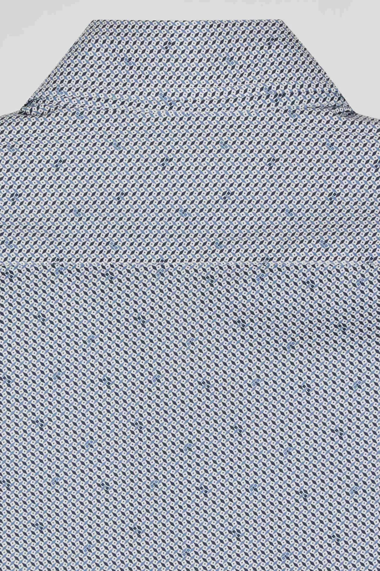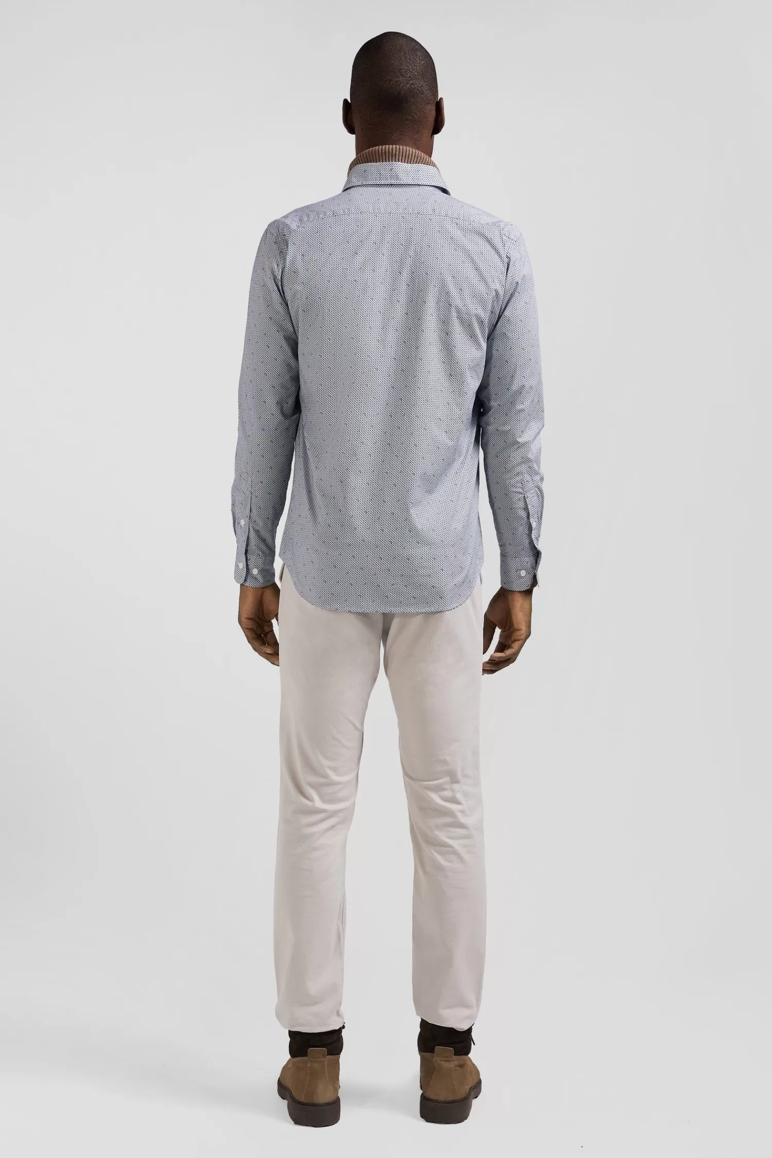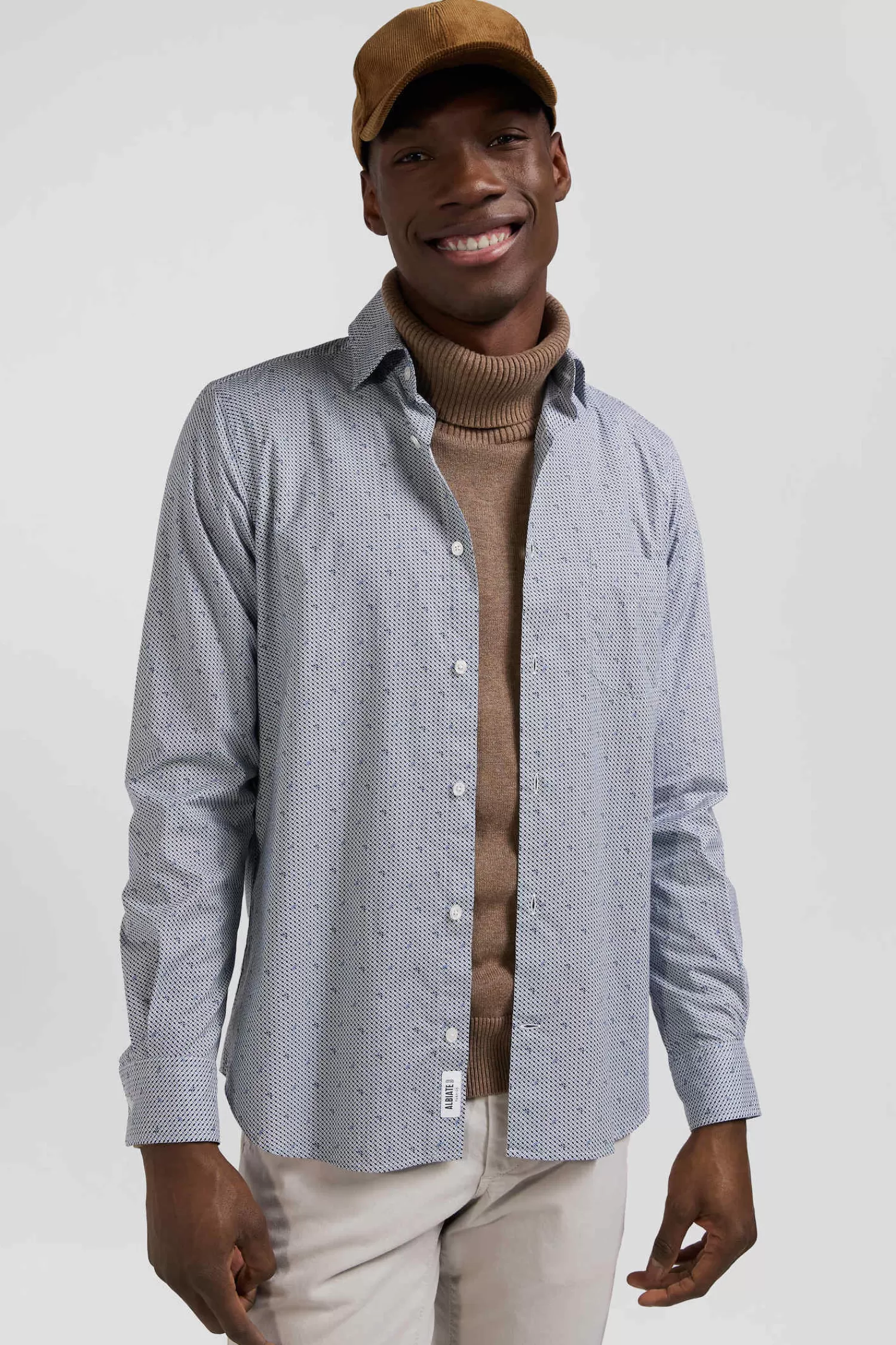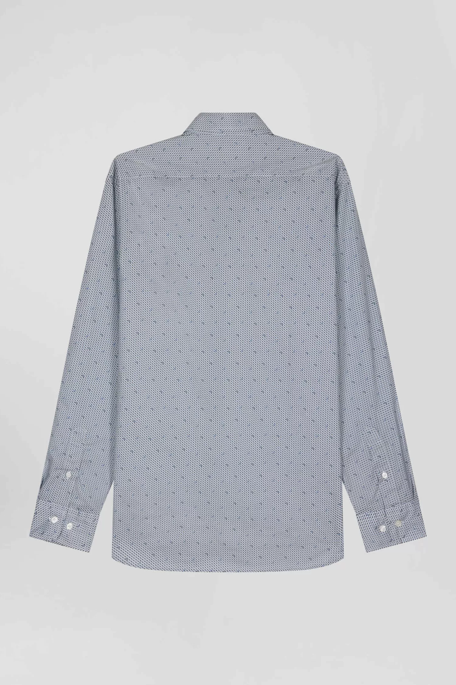 This navy cotton slim-fit shirt is enhanced with subtle graphic micro-motifs for a modern touch. Featuring a chest pocket and a tailored fit, this masculine shirt offers both sophistication and trendiness for everyday wear or special occasions.