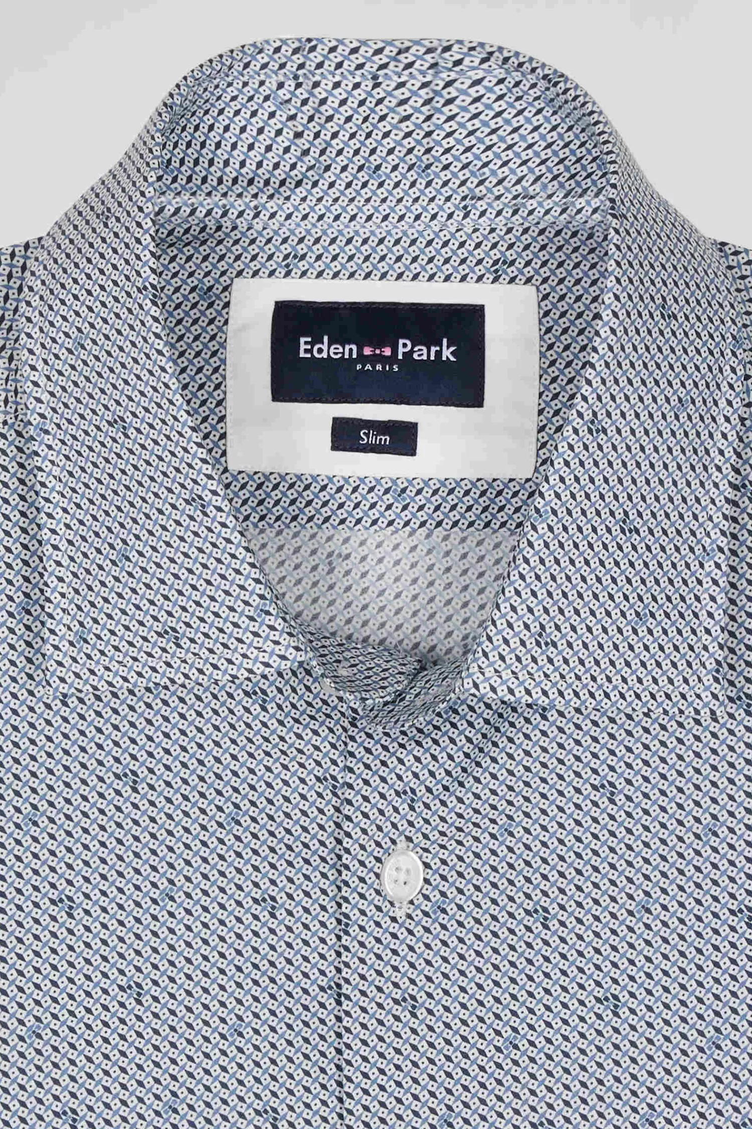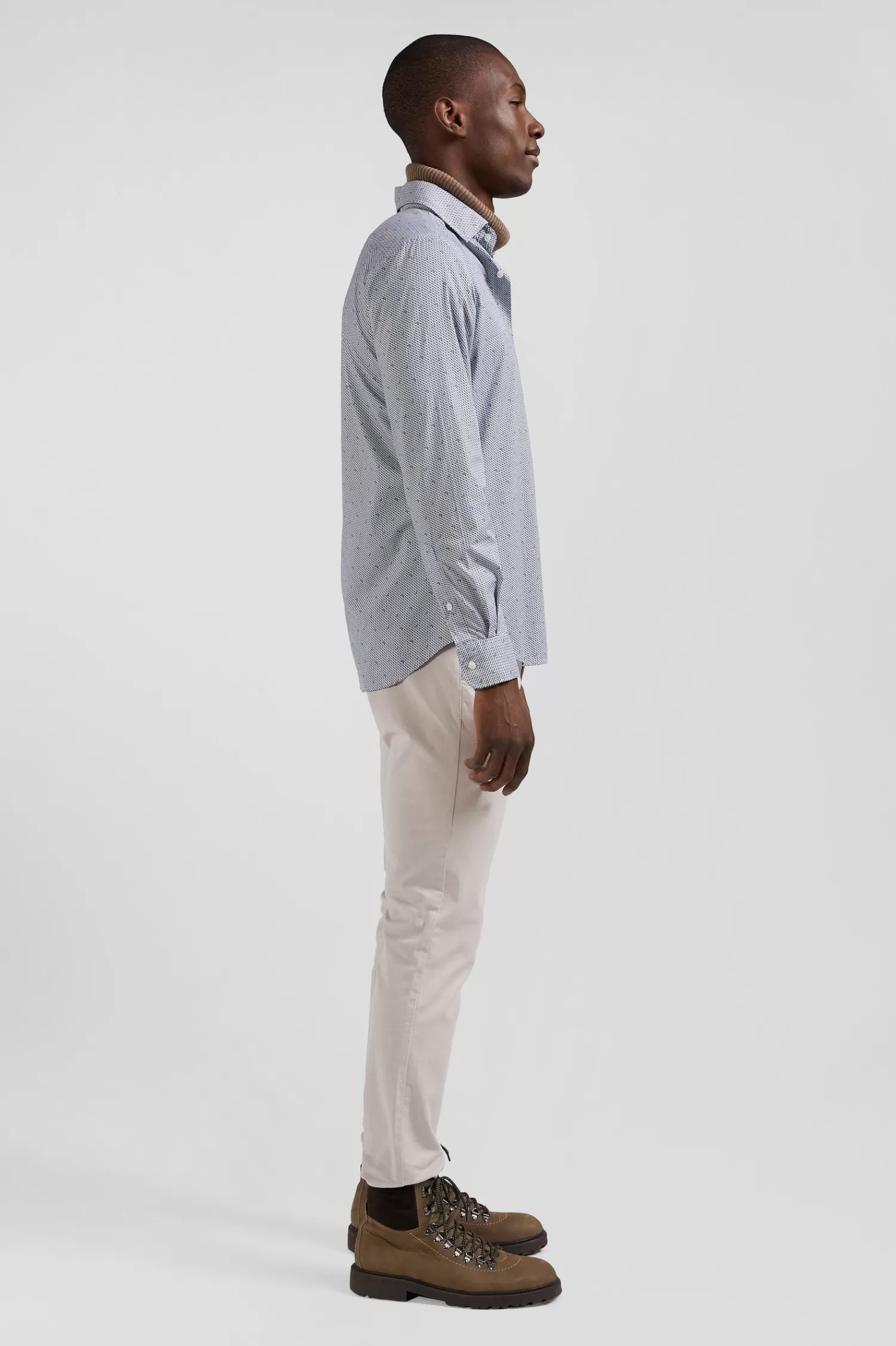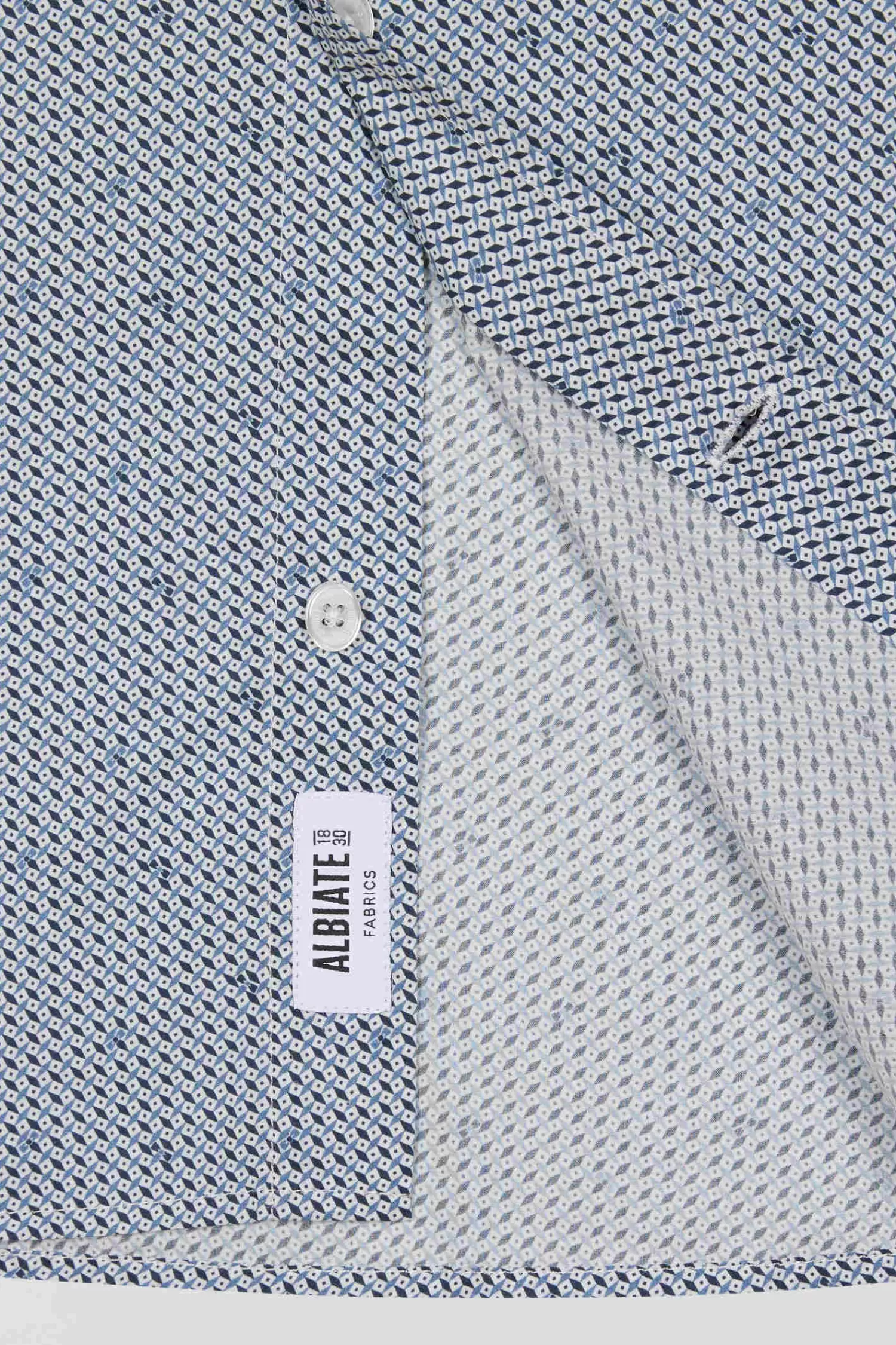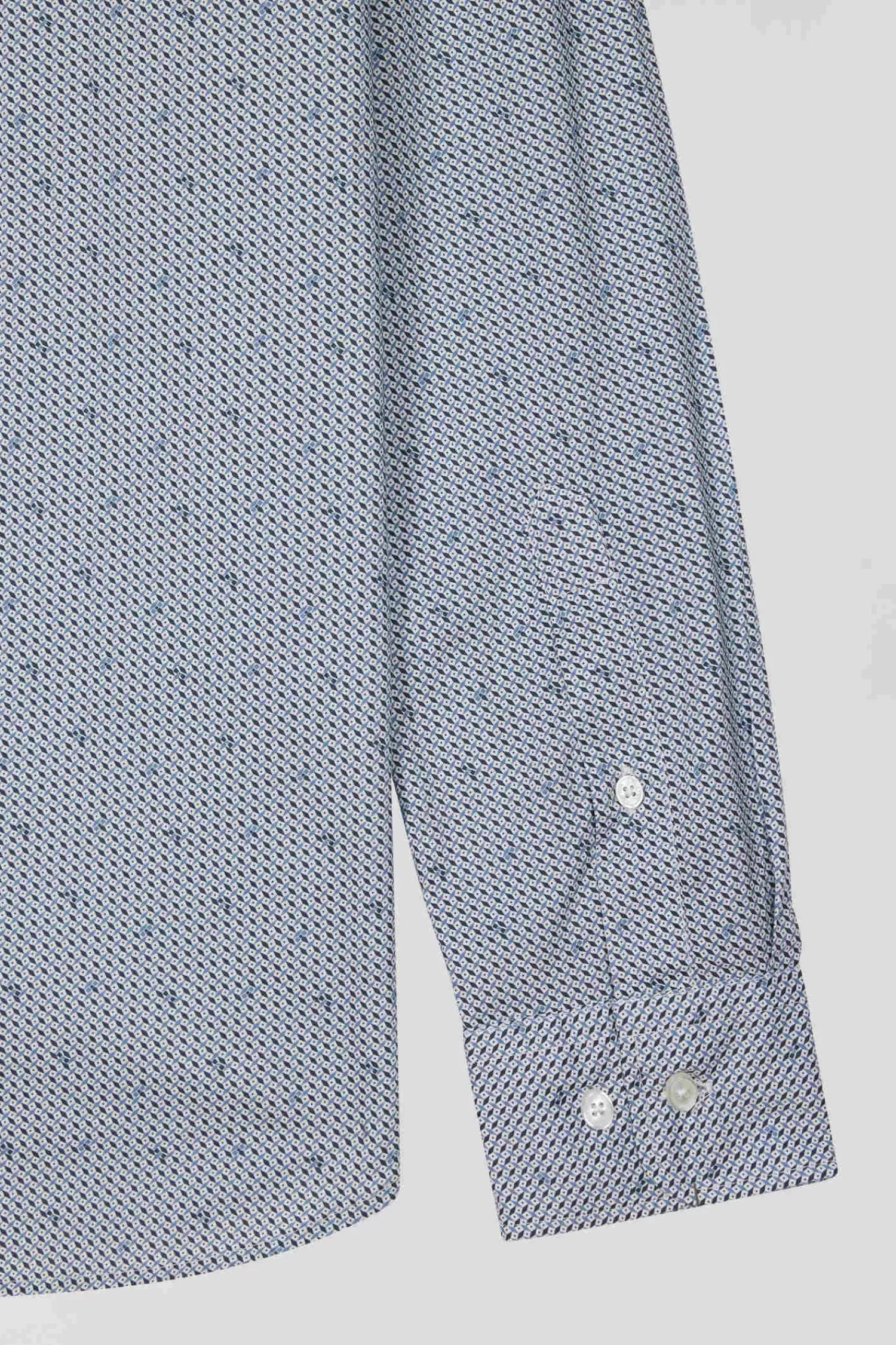 This navy cotton slim-fit shirt is enhanced with subtle graphic micro-motifs for a modern touch. Featuring a chest pocket and a tailored fit, this masculine shirt offers both sophistication and trendiness for everyday wear or special occasions.