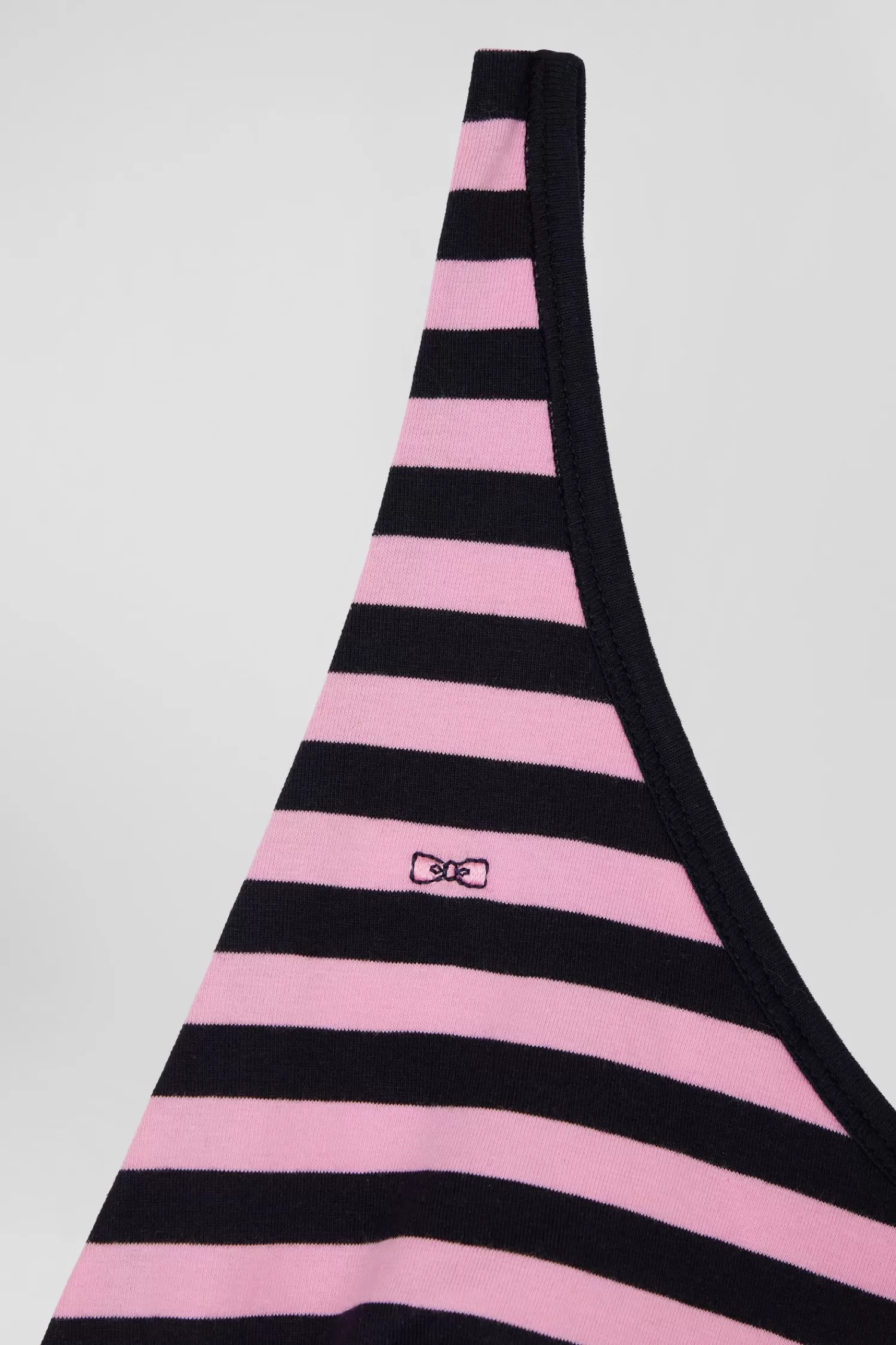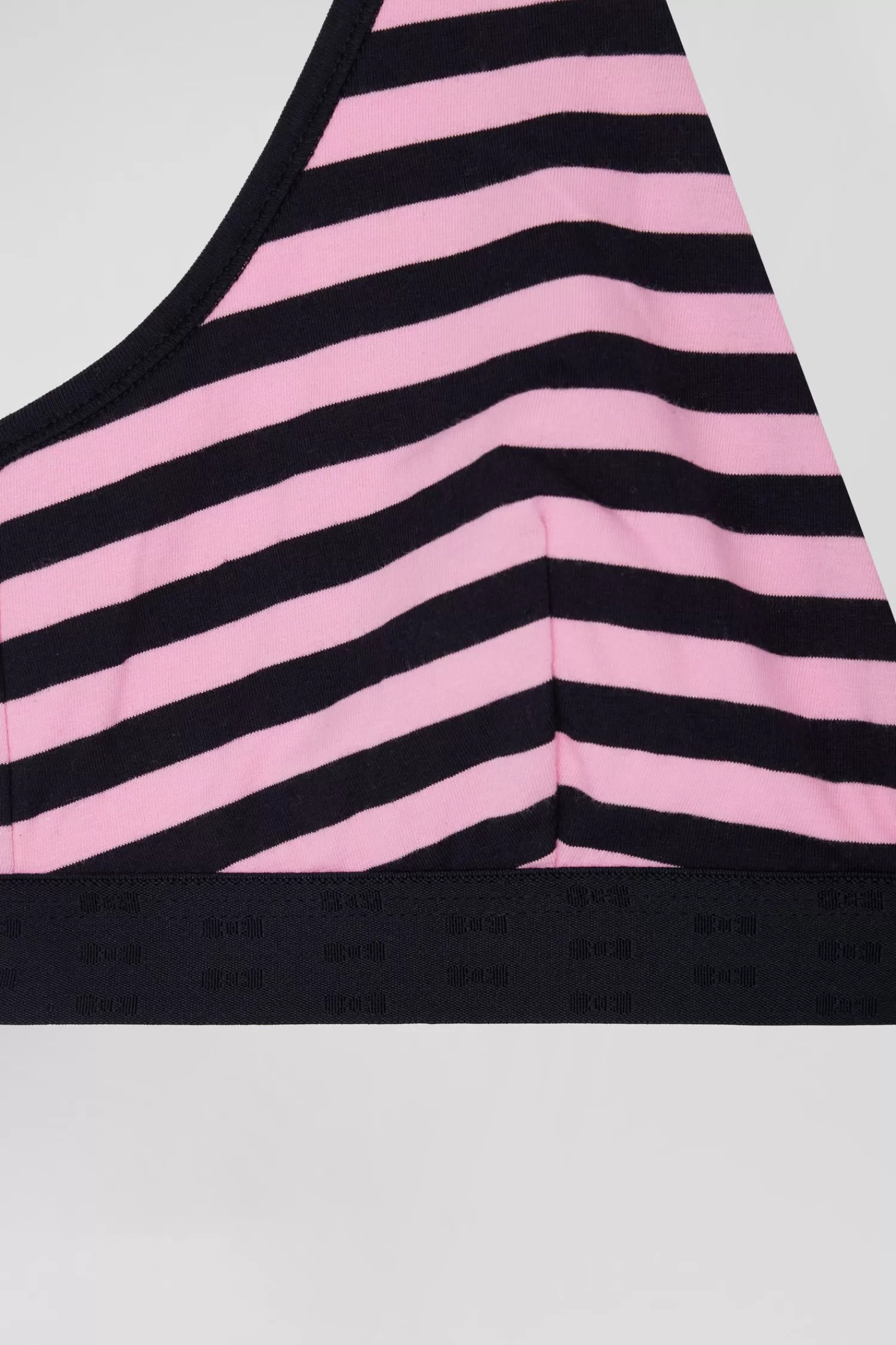 This triangle bra in stretch cotton jersey is hooped with pink and navy stripes, a reminder of our rugby DNA. This style combines ease and style with its comfortable fit and contrasting colours. This bra offers soft support without underwire.