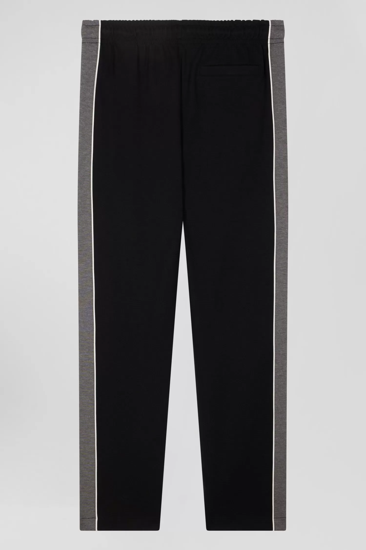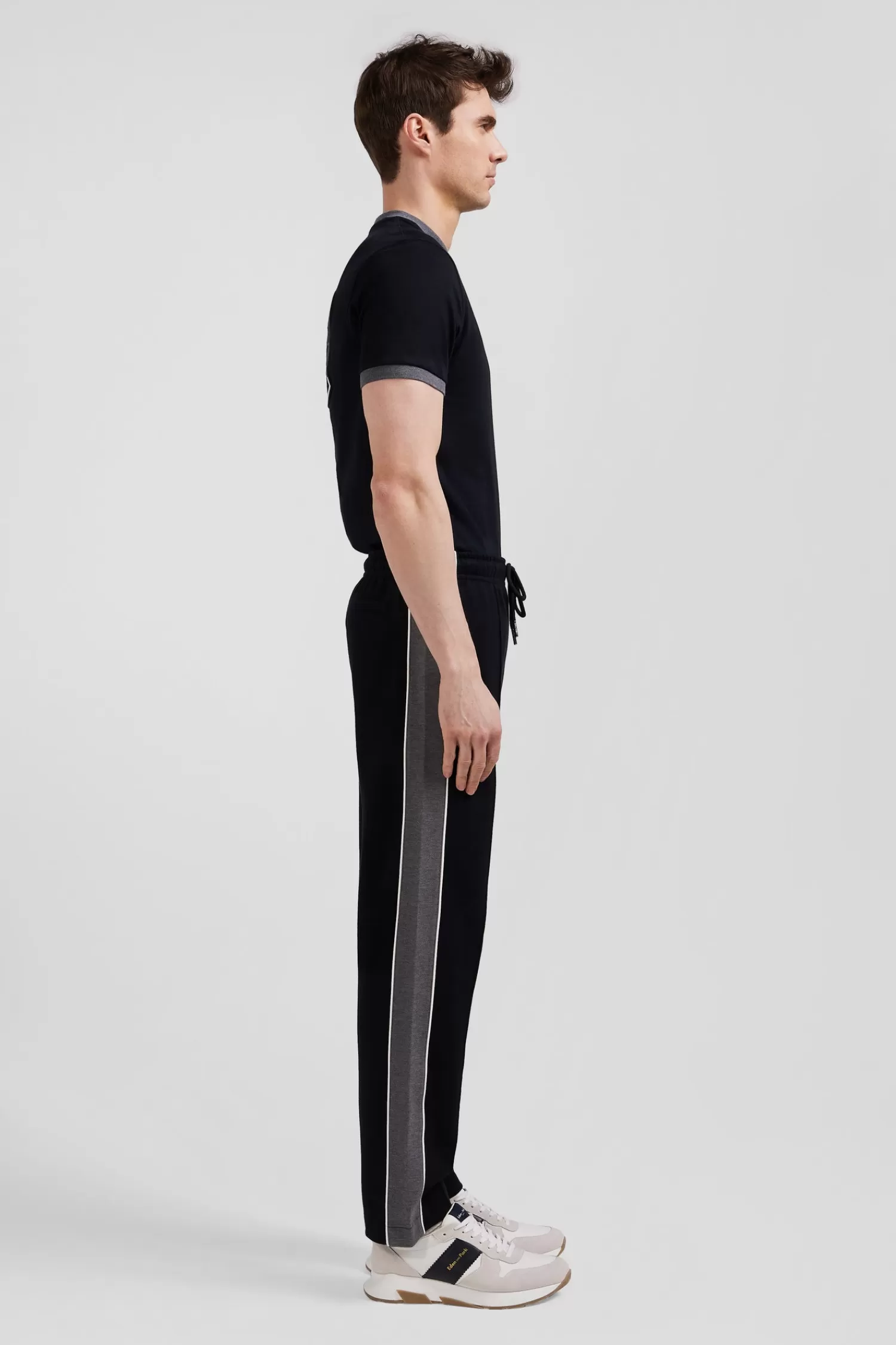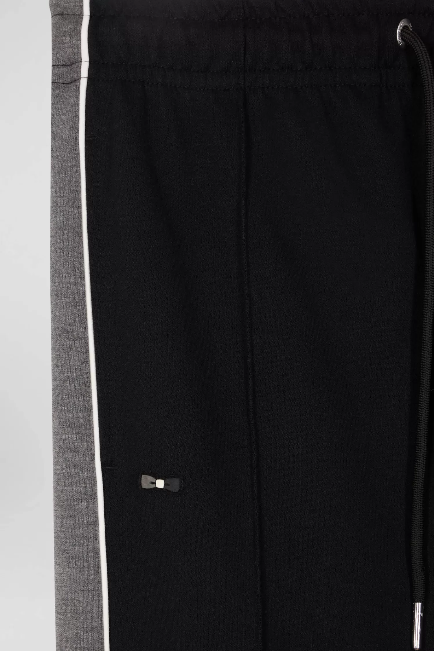 Our men’s cotton blend joggers are designed to combine comfort and style. These jogging bottoms are distinguished by a colorblock style in shades of gray and black, enhanced by an elegant piping detail along the leg. With an elasticated waistband, these soft joggers ensure a perfect fit and optimal comfort. The silver metallic finishes with the logo and the embroidery of our tricolor bow tie logo add a distinctive touch of elegance, reflecting the attention to detail and identity of our French brand.