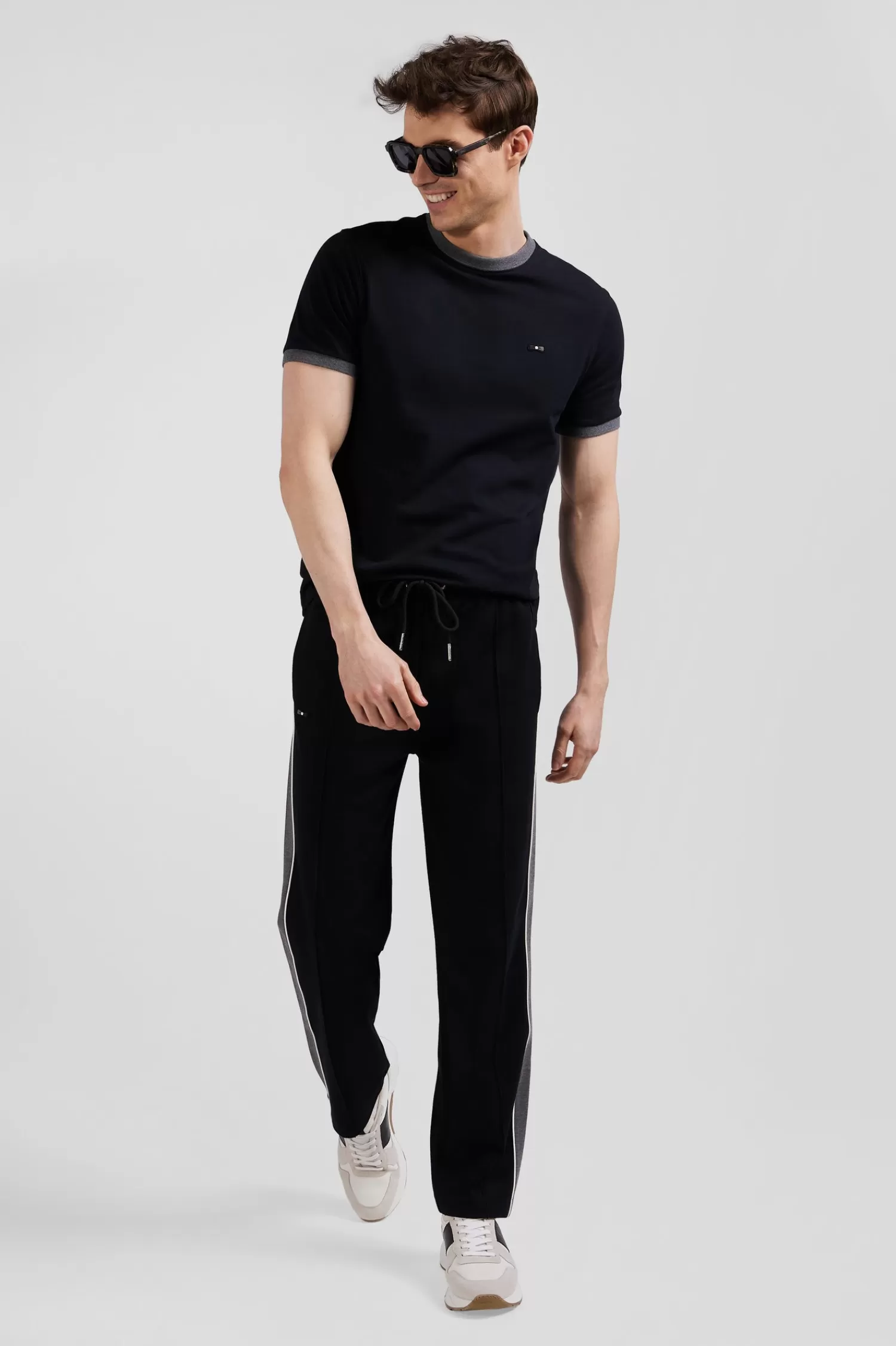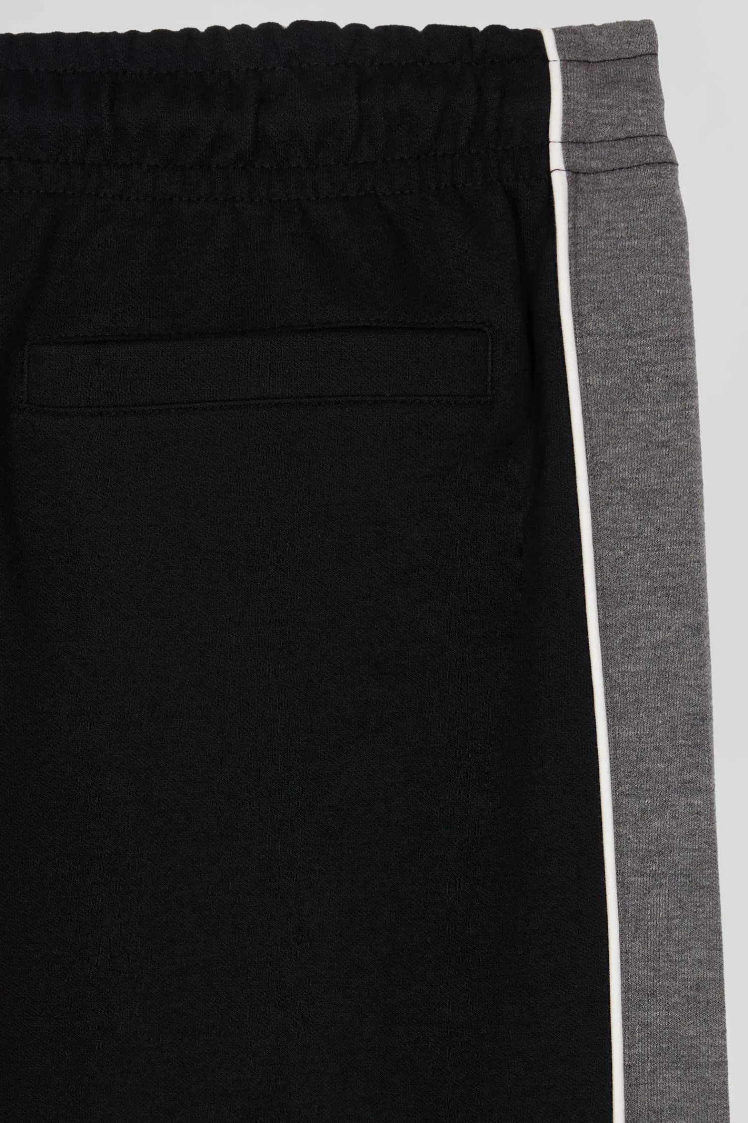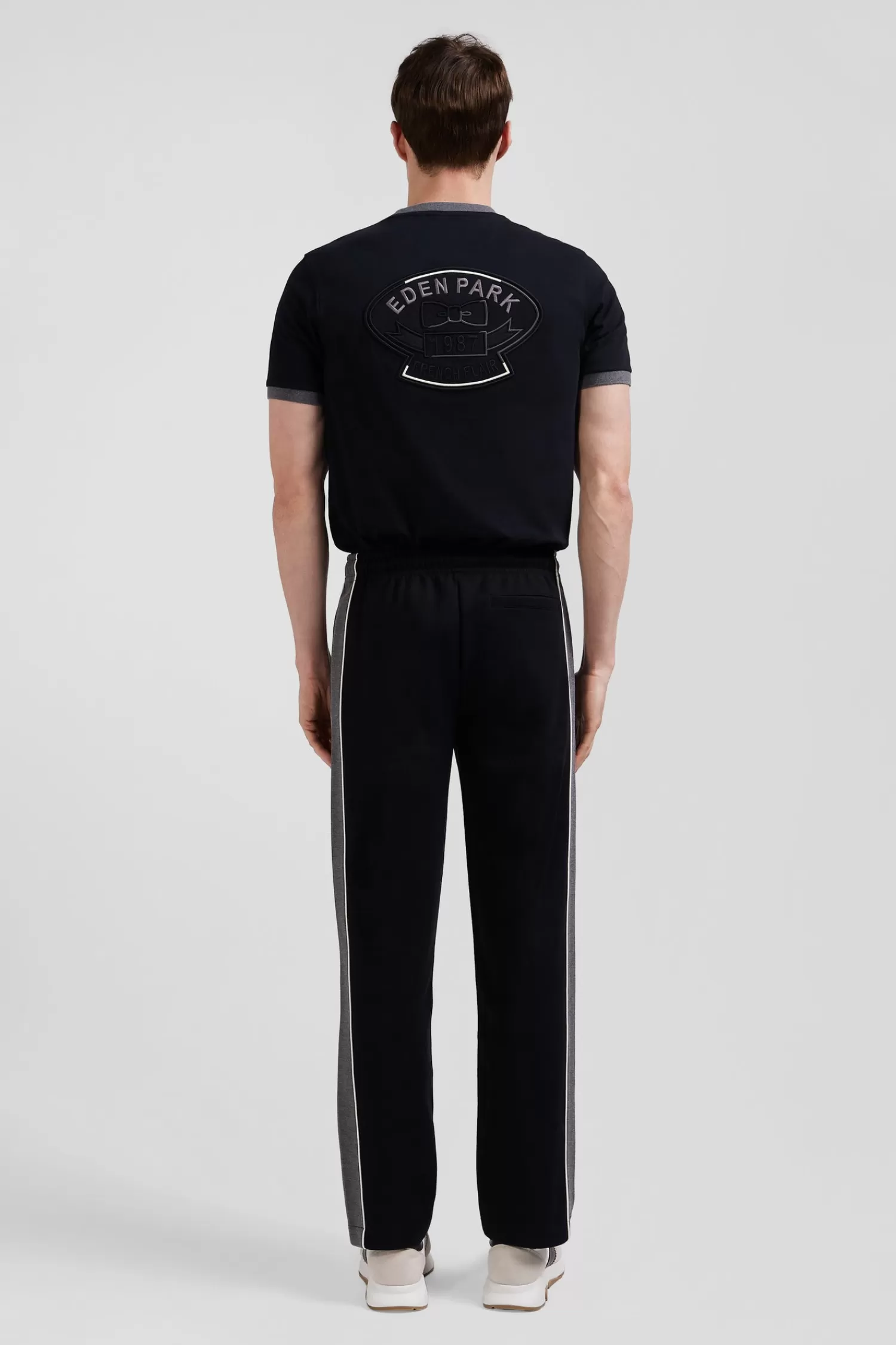 Our men’s cotton blend joggers are designed to combine comfort and style. These jogging bottoms are distinguished by a colorblock style in shades of gray and black, enhanced by an elegant piping detail along the leg. With an elasticated waistband, these soft joggers ensure a perfect fit and optimal comfort. The silver metallic finishes with the logo and the embroidery of our tricolor bow tie logo add a distinctive touch of elegance, reflecting the attention to detail and identity of our French brand.