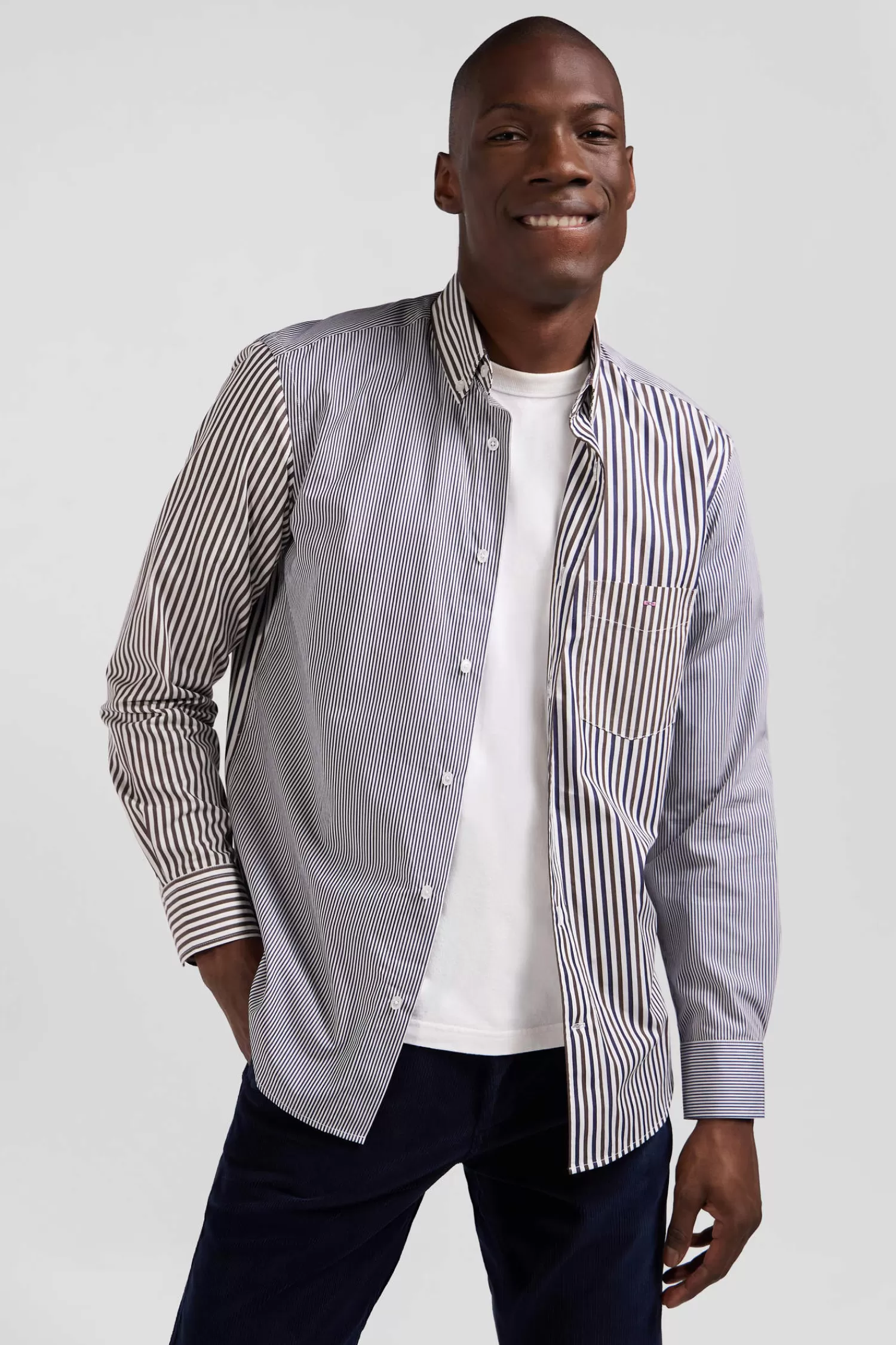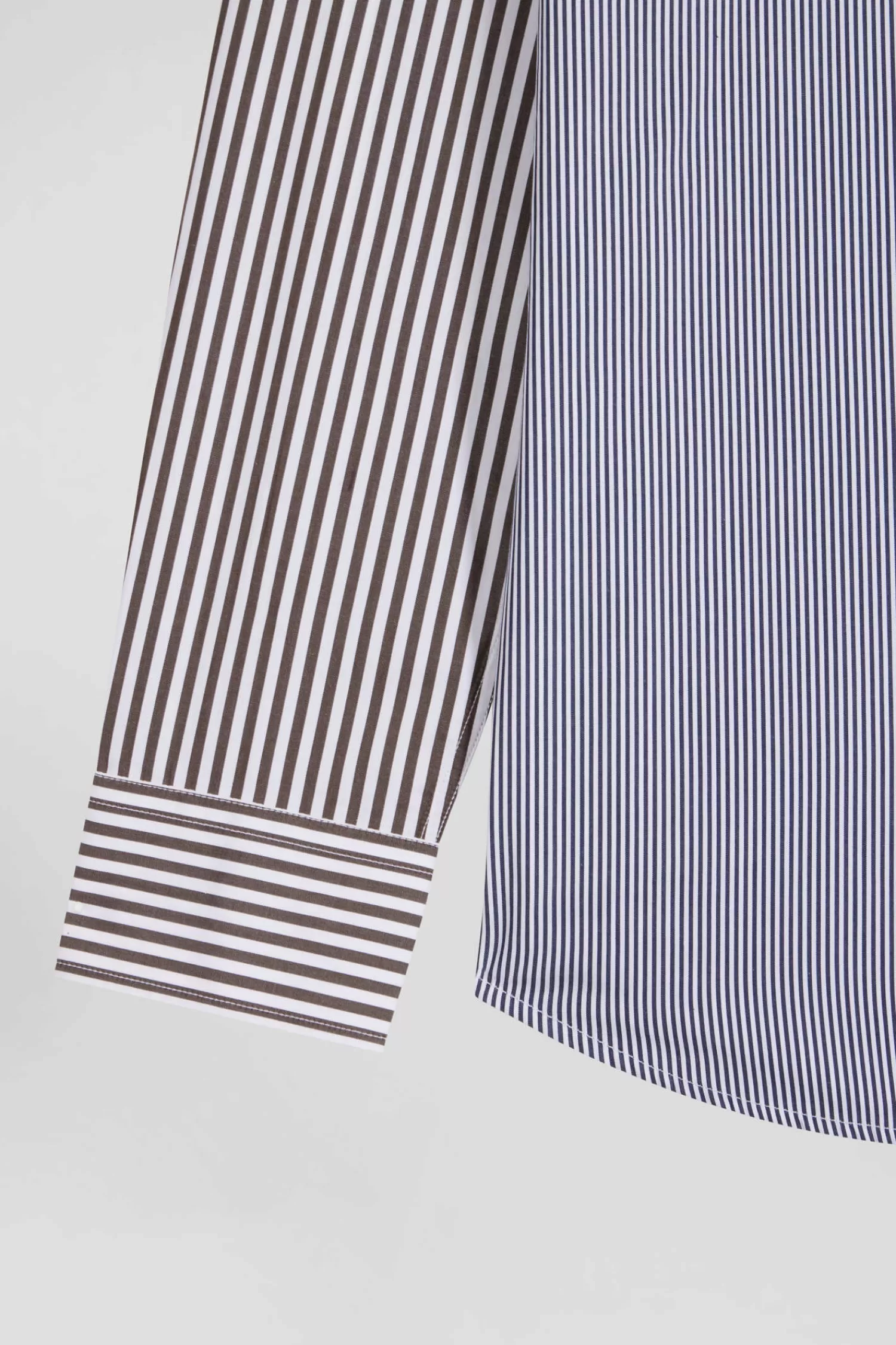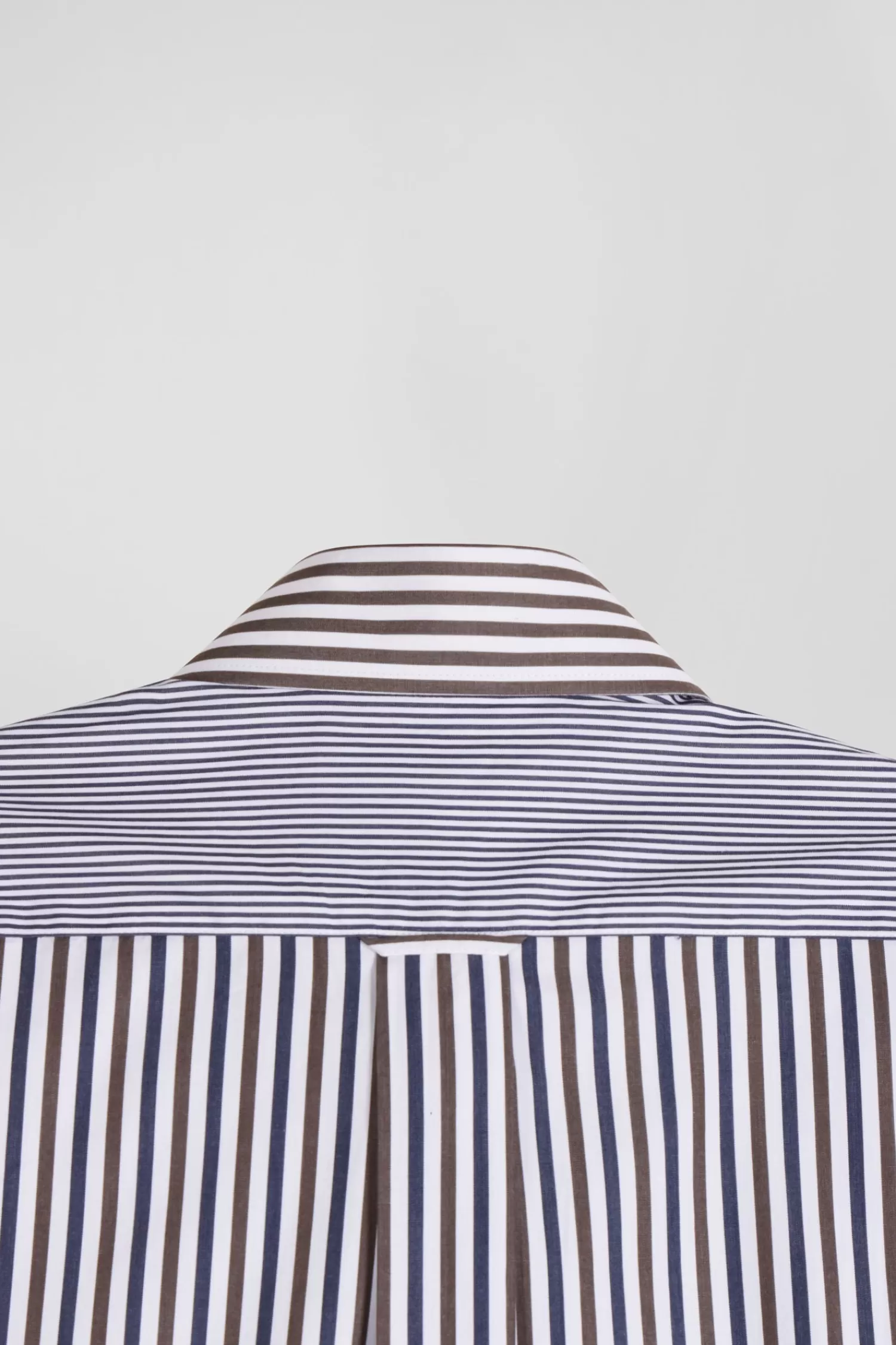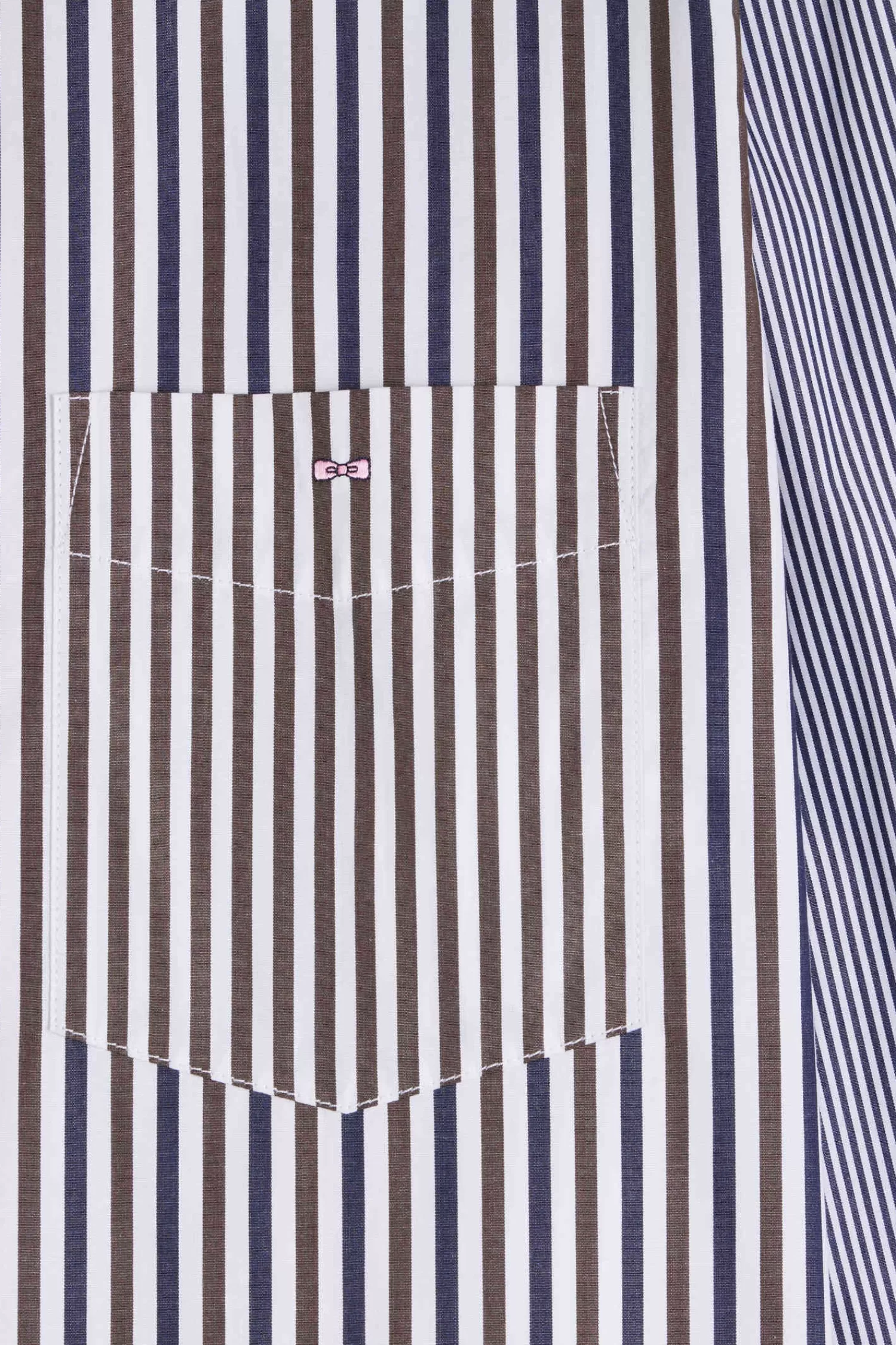 Our cotton poplin shirt is boldly designed with a mix and match of three types of stripes for a dynamic and modern look. This style features a button-down collar and a pleat at the back that accentuates its straight cut, offering an elegant silhouette. A discreet bow tie embroidery adorns the chest pocket, adding a touch of sophistication to this men’s shirt. Perfect for the office or special occasions, this shirt combines creativity and comfort.