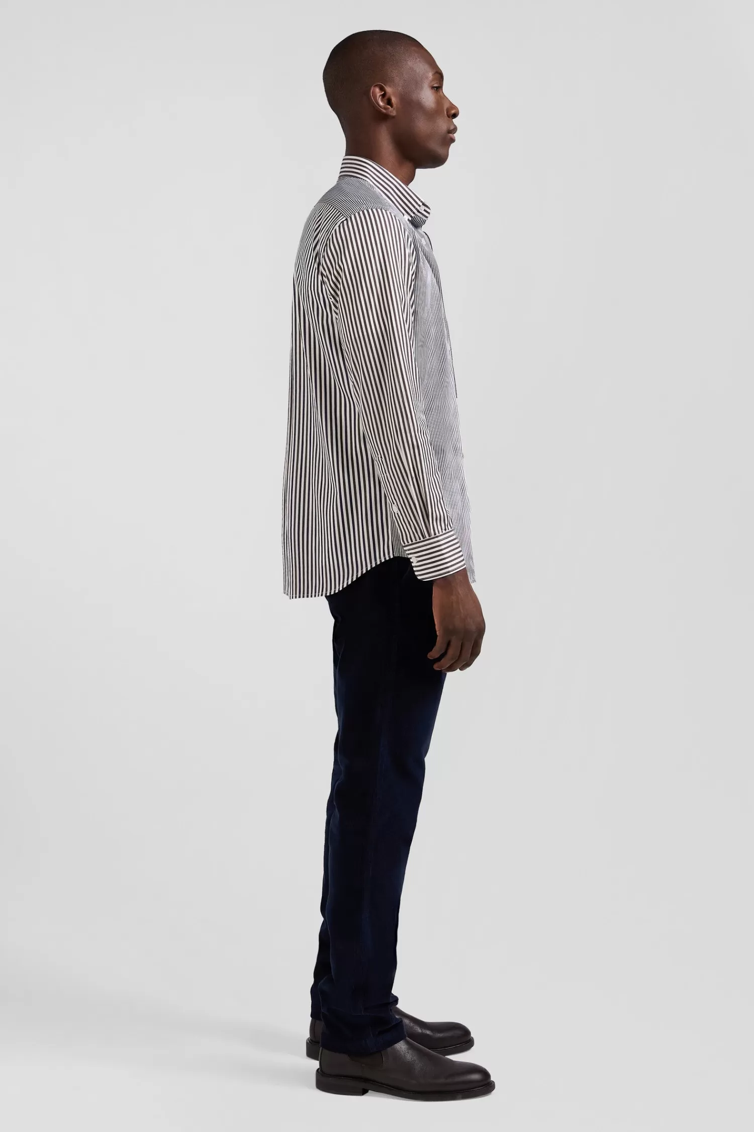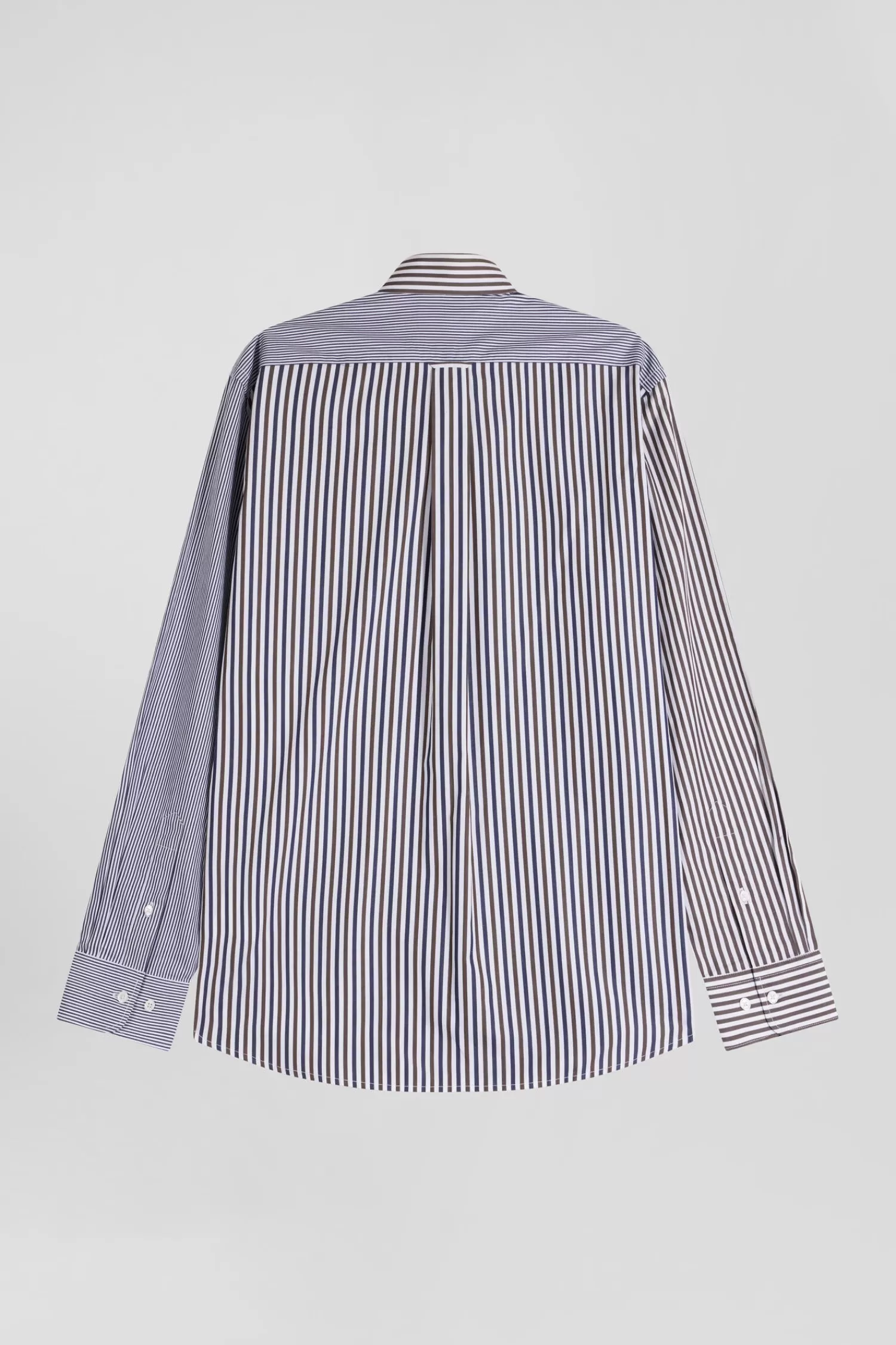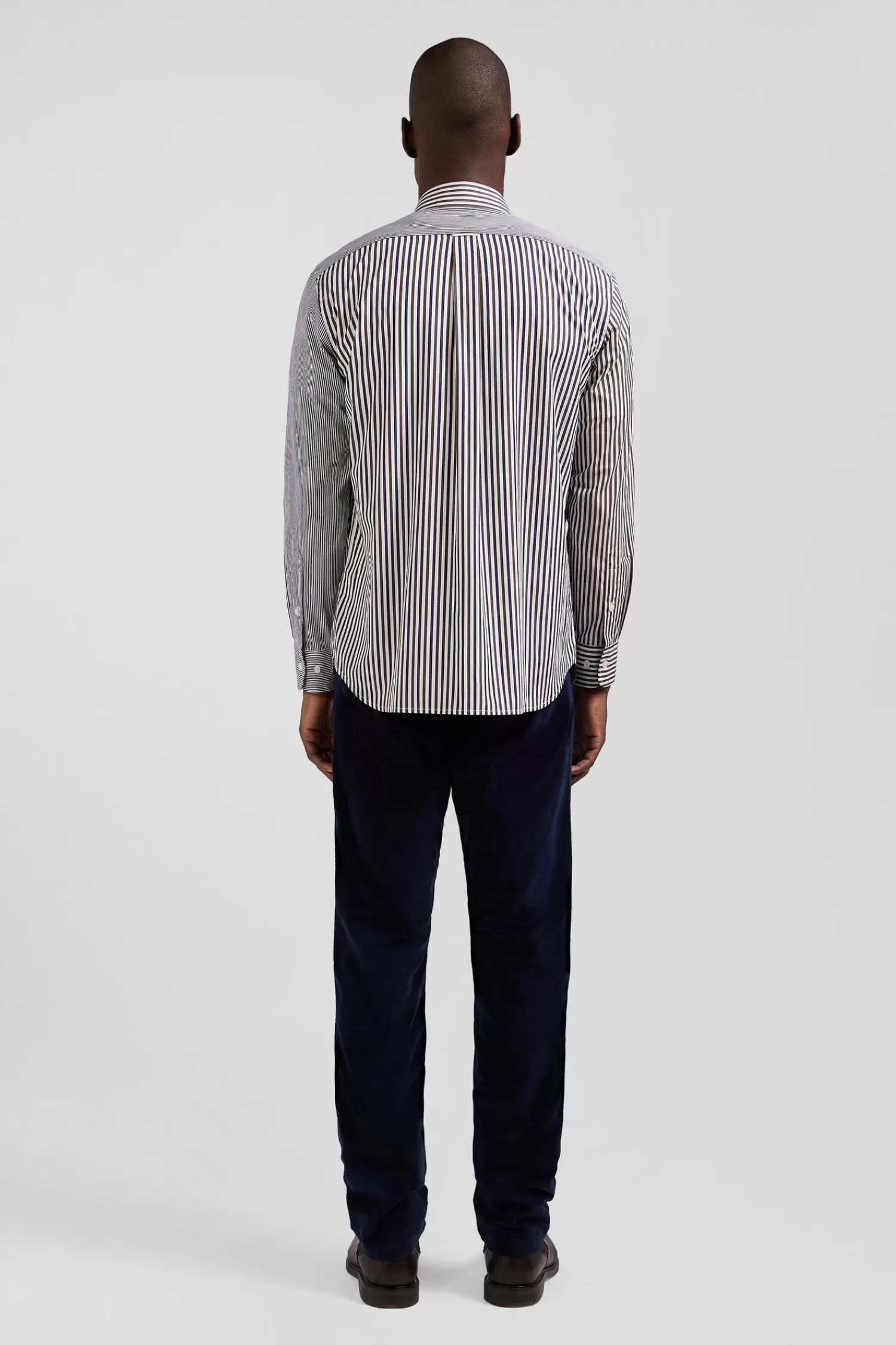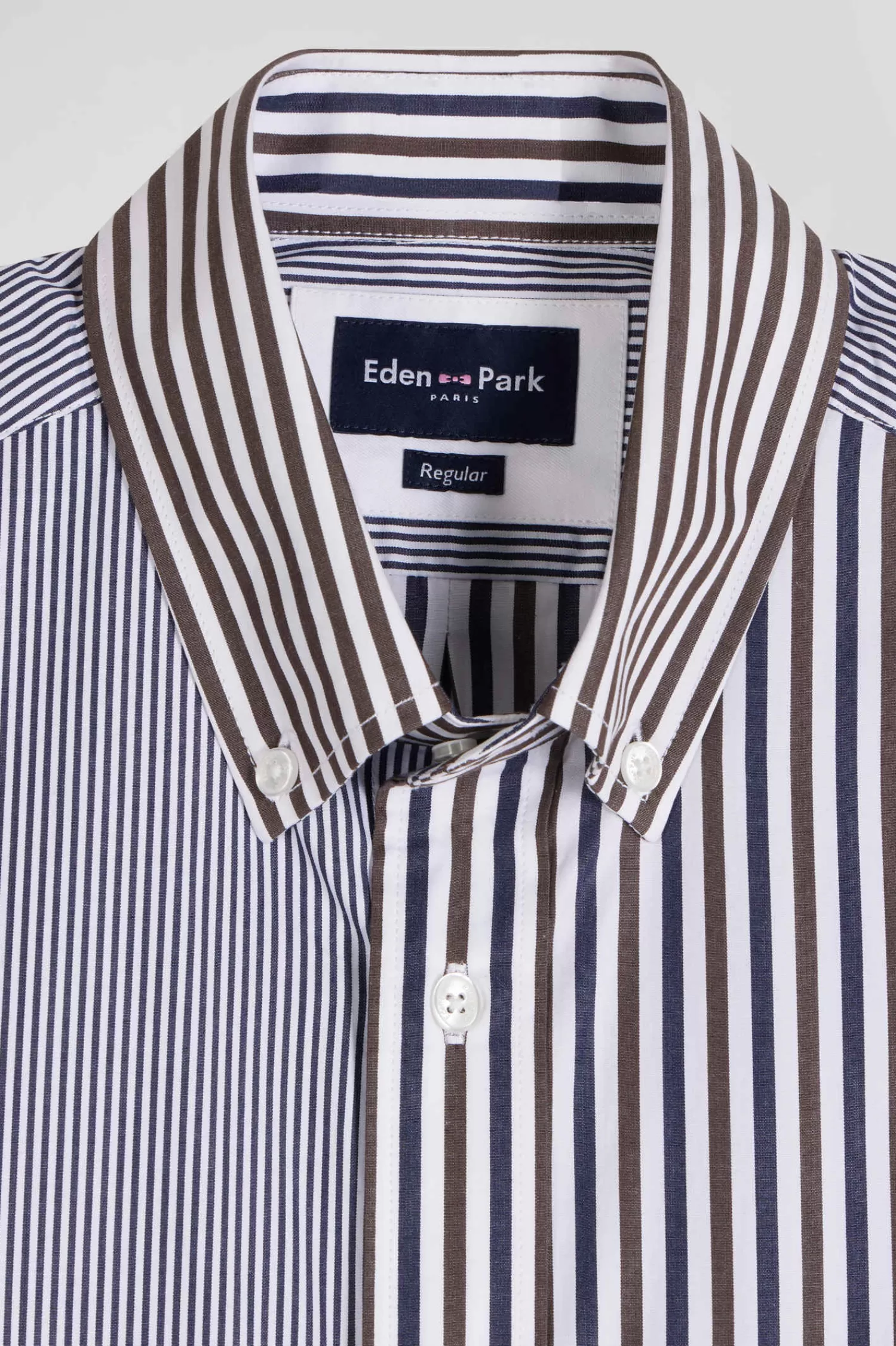 Our cotton poplin shirt is boldly designed with a mix and match of three types of stripes for a dynamic and modern look. This style features a button-down collar and a pleat at the back that accentuates its straight cut, offering an elegant silhouette. A discreet bow tie embroidery adorns the chest pocket, adding a touch of sophistication to this men’s shirt. Perfect for the office or special occasions, this shirt combines creativity and comfort.