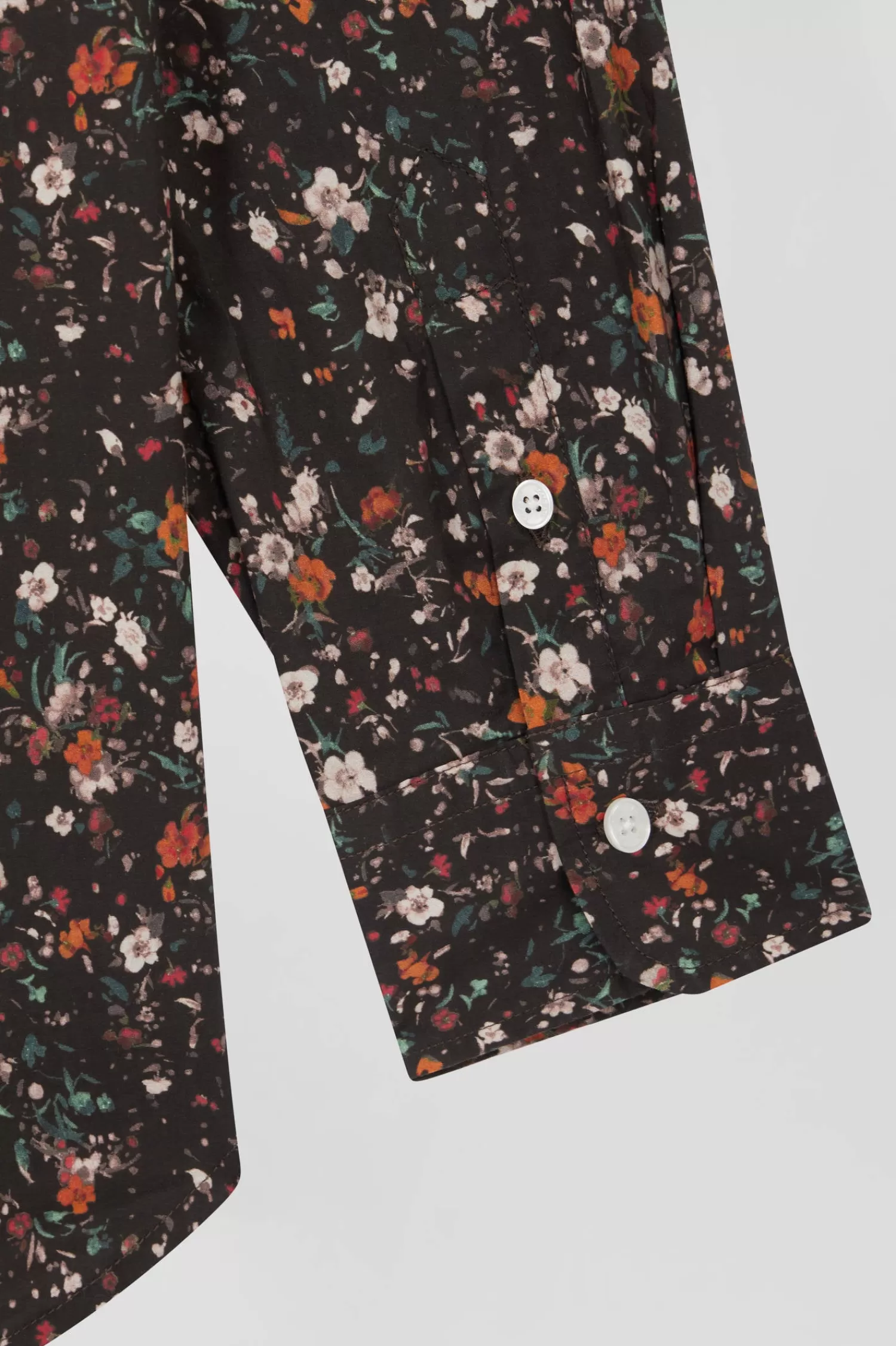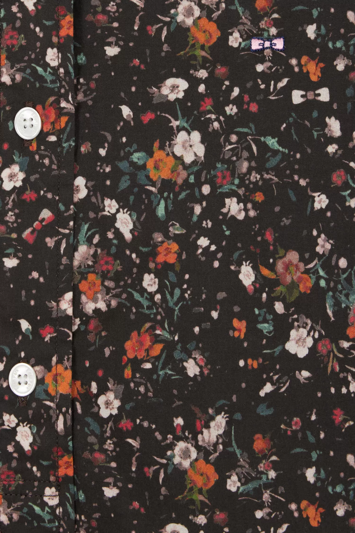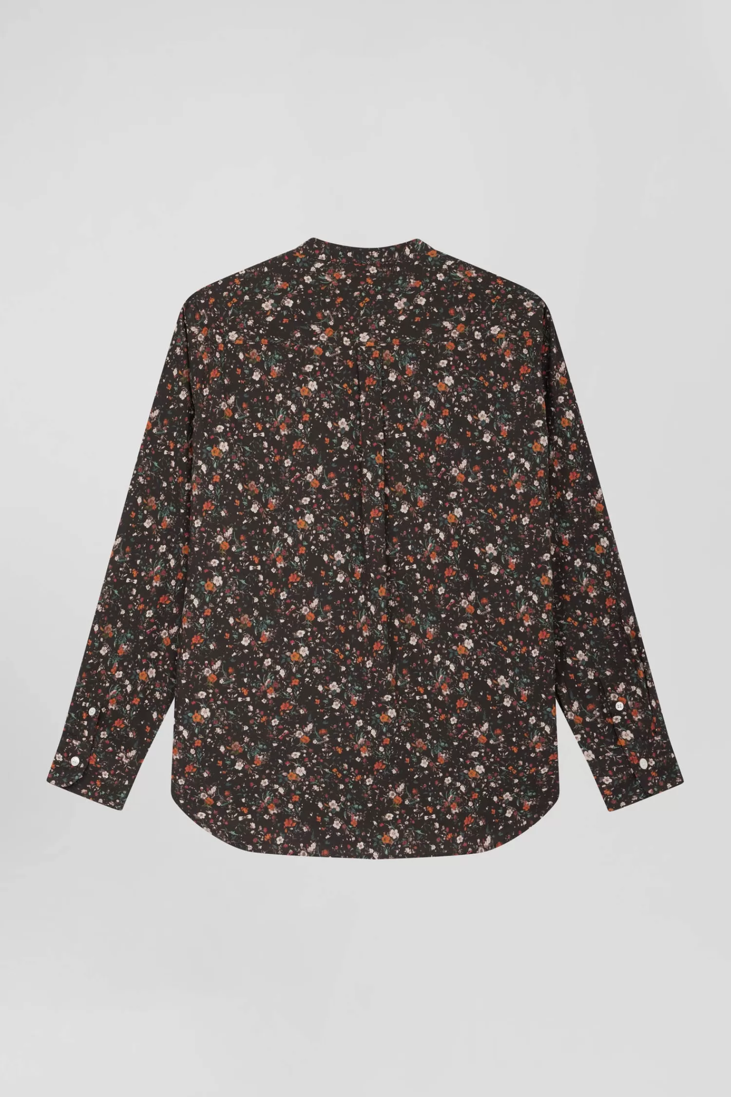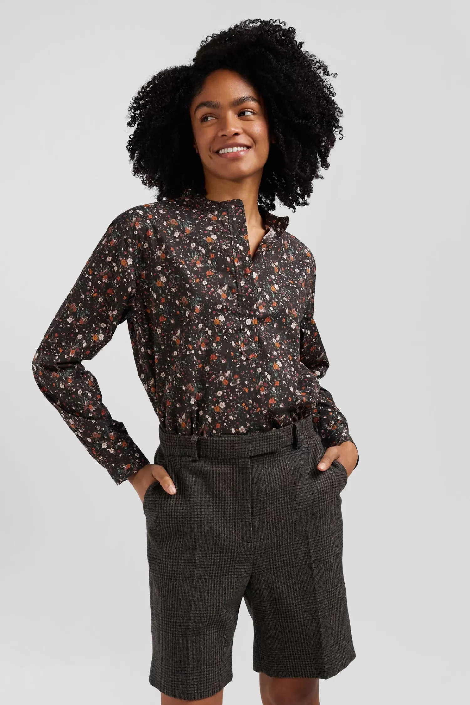 This feminine and poetic shirt is made from a lightweight cotton poplin that is soft to wear. Its floral micropattern exclusively designed for our Maison gives it a romantic and modern touch thanks to its play of contrasts. Its straight cut and its absence of collar elevate the allure. For a feminine autumn-winter outfit, why not pair this shirt with our beige corduroy suit?