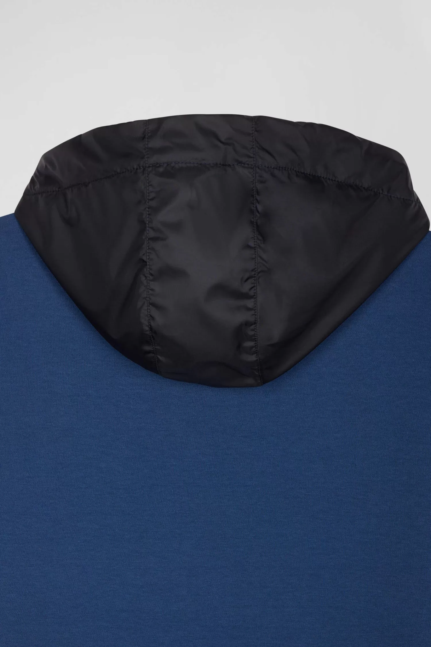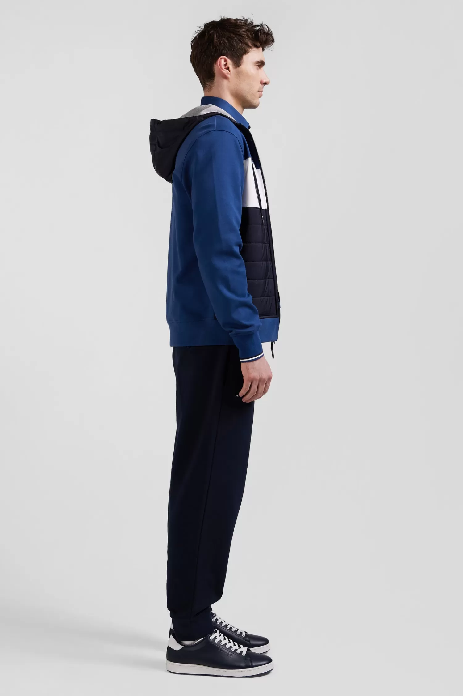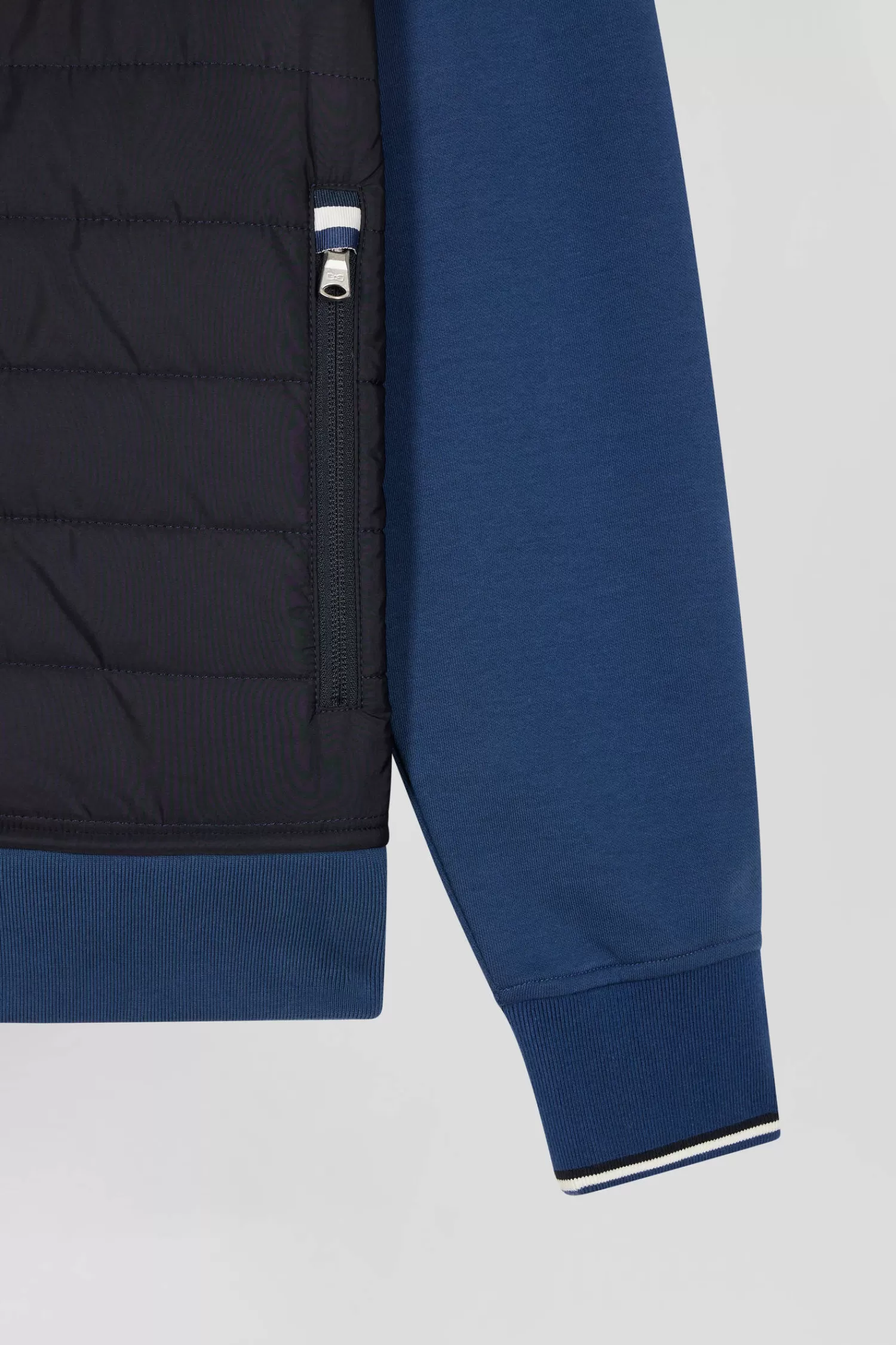 Our interlock zip-up sweatshirt offers exceptional comfort and softness thanks to its double mesh. Its design is enhanced by a dynamic colorblock effect and an integrated nylon hood. The quilted nylon panel on the front evokes the look of a down jacket, adding a unique touch. Striped ribbed cuffs give it a sporty finish, while silver details add a touch of elegance to this sweatshirt, which can easily be worn as your next mid-season jacket.
