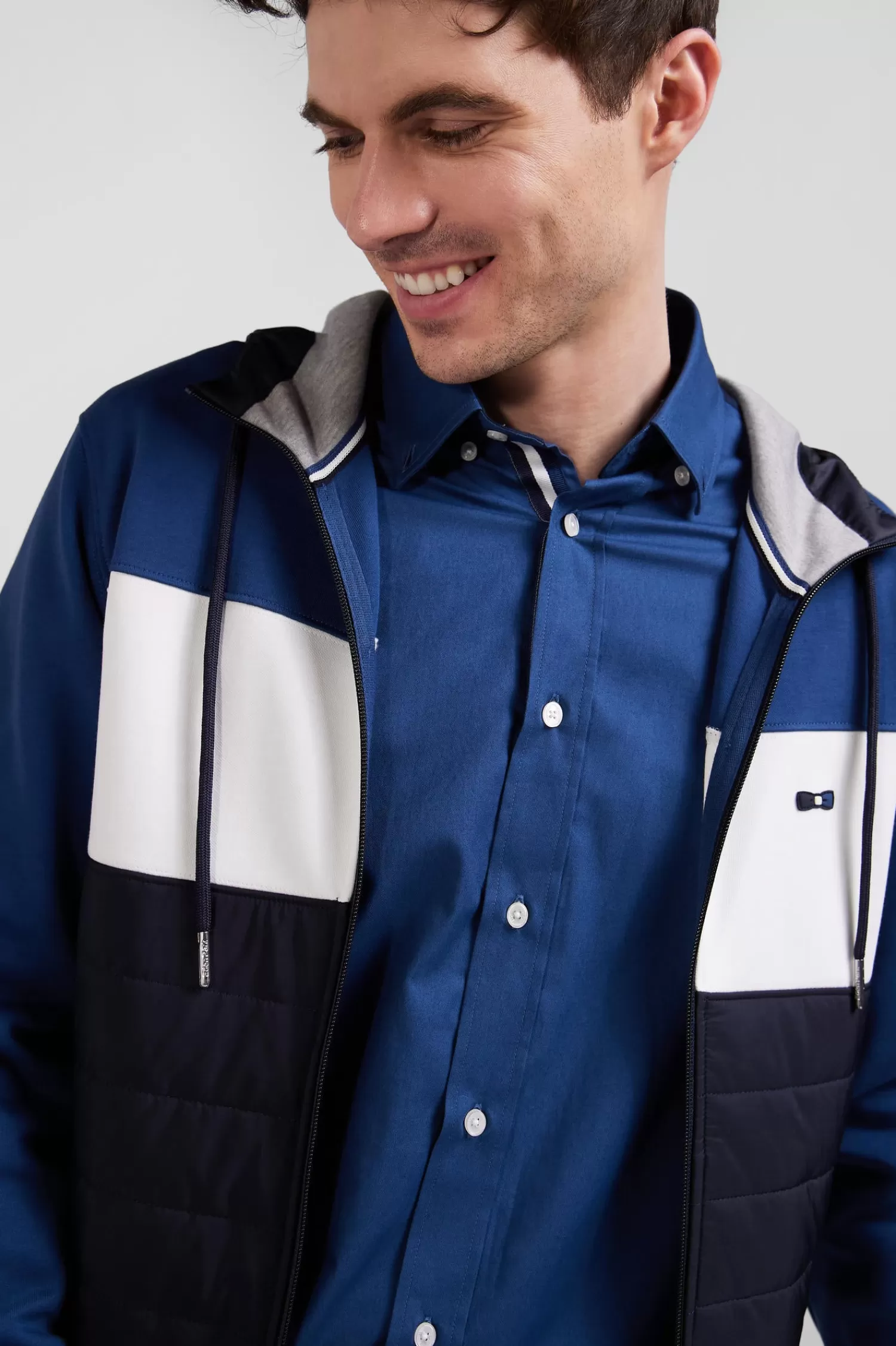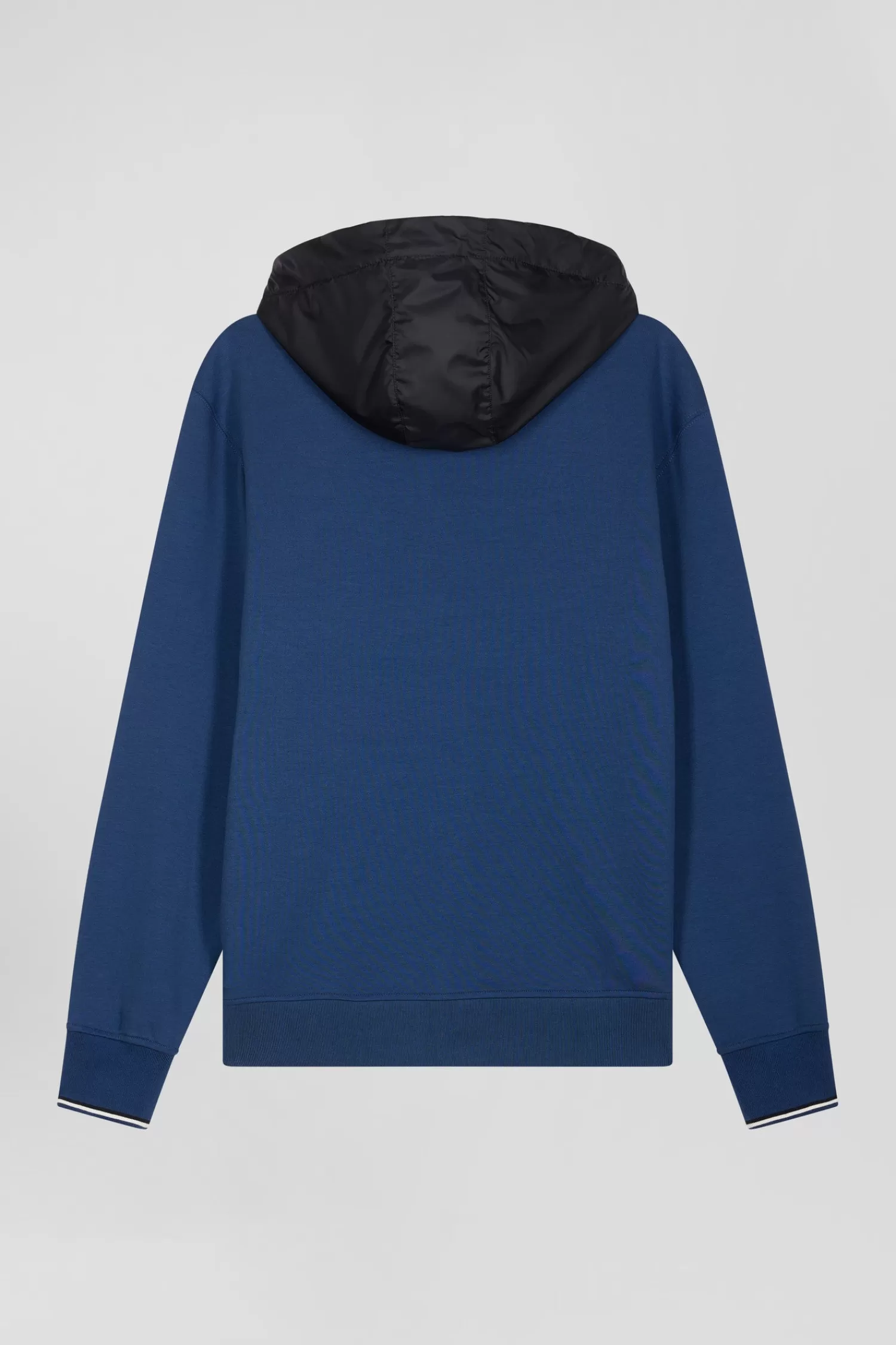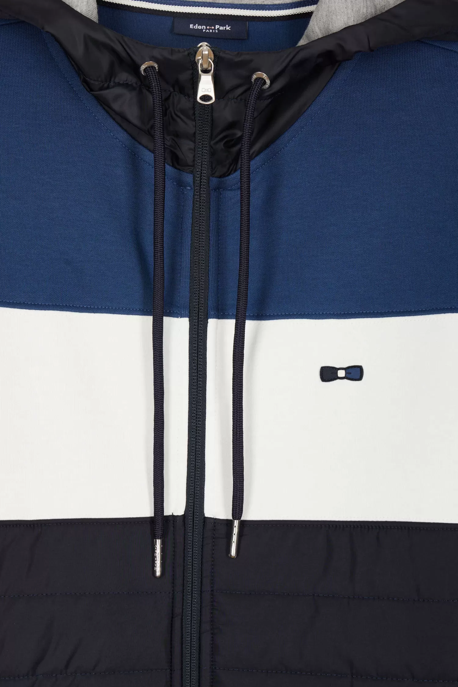 Our interlock zip-up sweatshirt offers exceptional comfort and softness thanks to its double mesh. Its design is enhanced by a dynamic colorblock effect and an integrated nylon hood. The quilted nylon panel on the front evokes the look of a down jacket, adding a unique touch. Striped ribbed cuffs give it a sporty finish, while silver details add a touch of elegance to this sweatshirt, which can easily be worn as your next mid-season jacket.