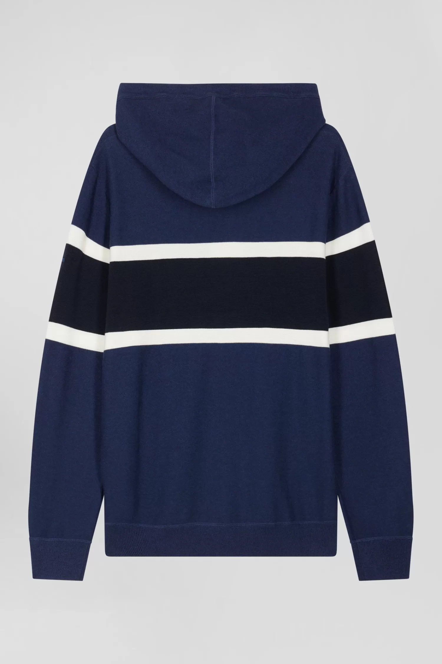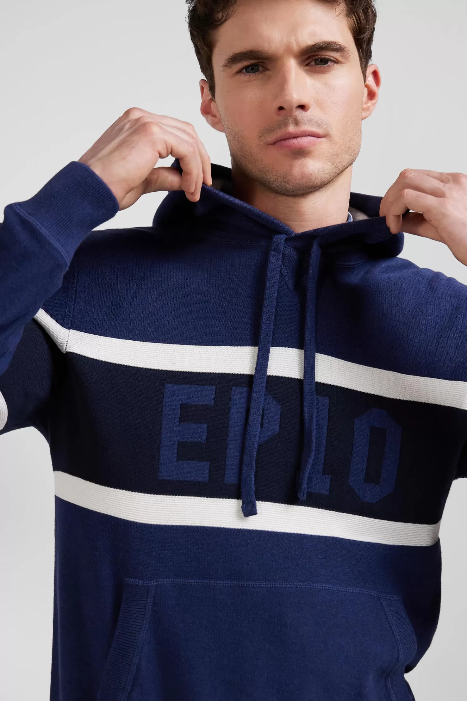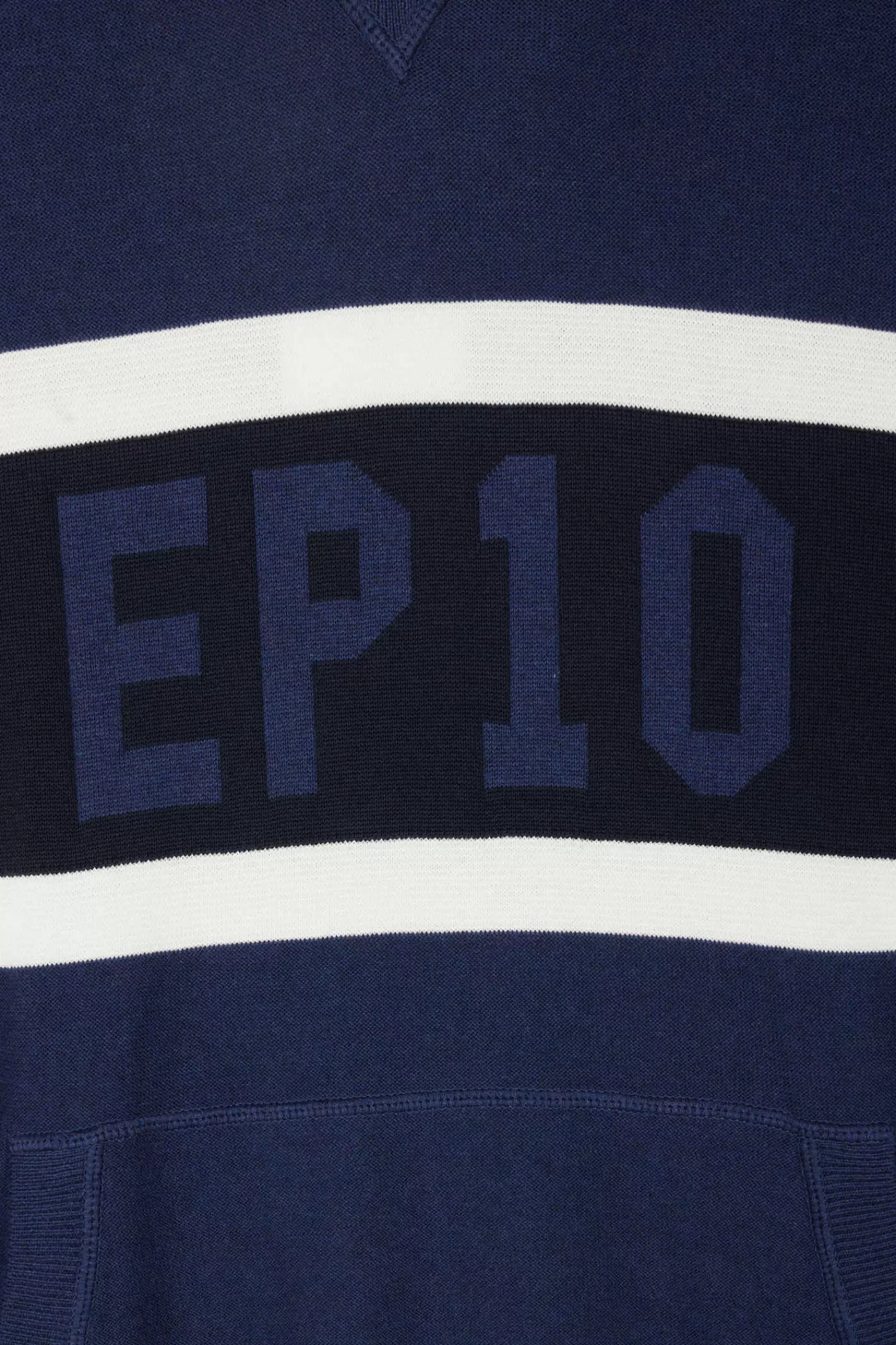 Elevate your casual outfits with this hooded jumper, which skillfully blends contrasting knit patterns for a dynamic visual effect. A jacquard band on the chest highlights the EP 10 logo. Inspired by sweatshirts, it features ribbed finishes, an integrated hood, jersey body, and reverse rugby shirt half-moon, merging style and comfort perfectly.