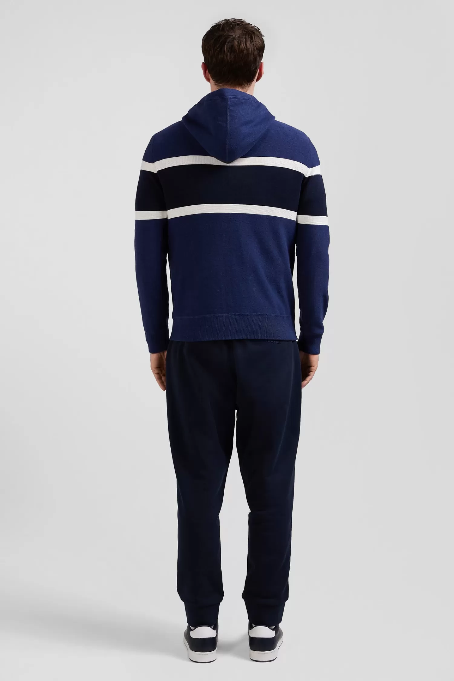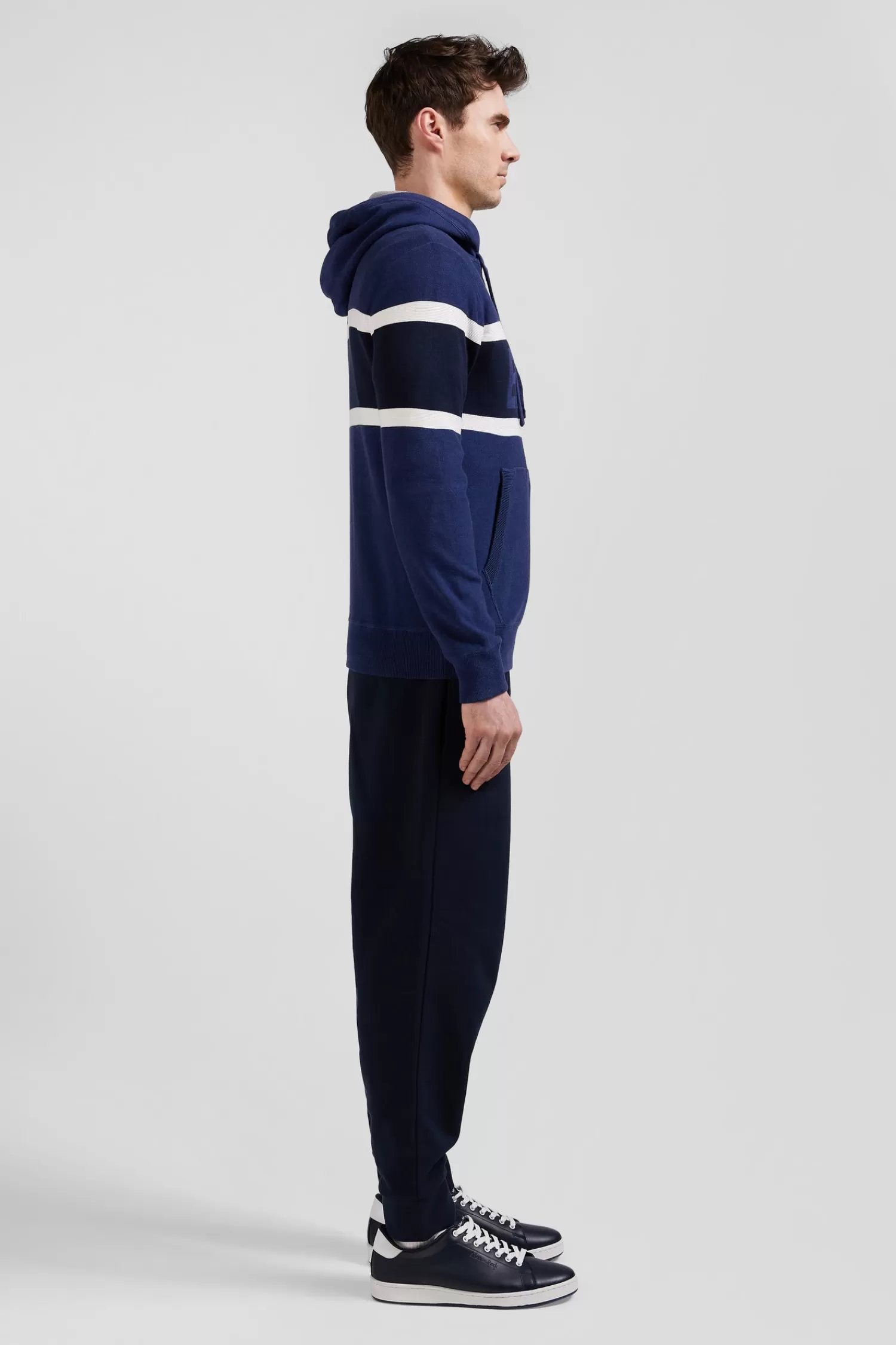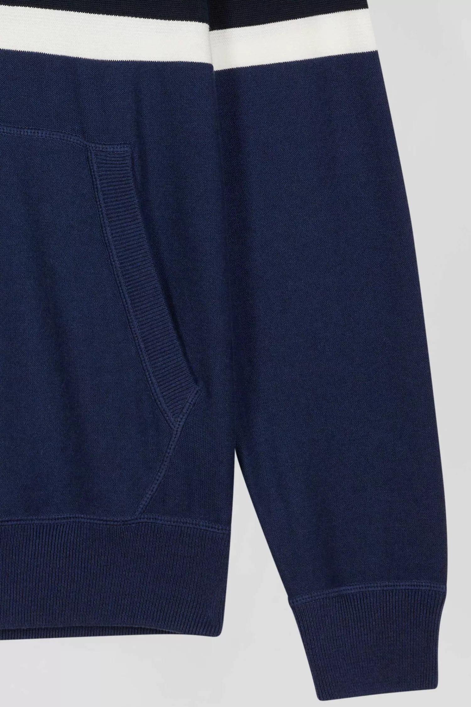 Elevate your casual outfits with this hooded jumper, which skillfully blends contrasting knit patterns for a dynamic visual effect. A jacquard band on the chest highlights the EP 10 logo. Inspired by sweatshirts, it features ribbed finishes, an integrated hood, jersey body, and reverse rugby shirt half-moon, merging style and comfort perfectly.