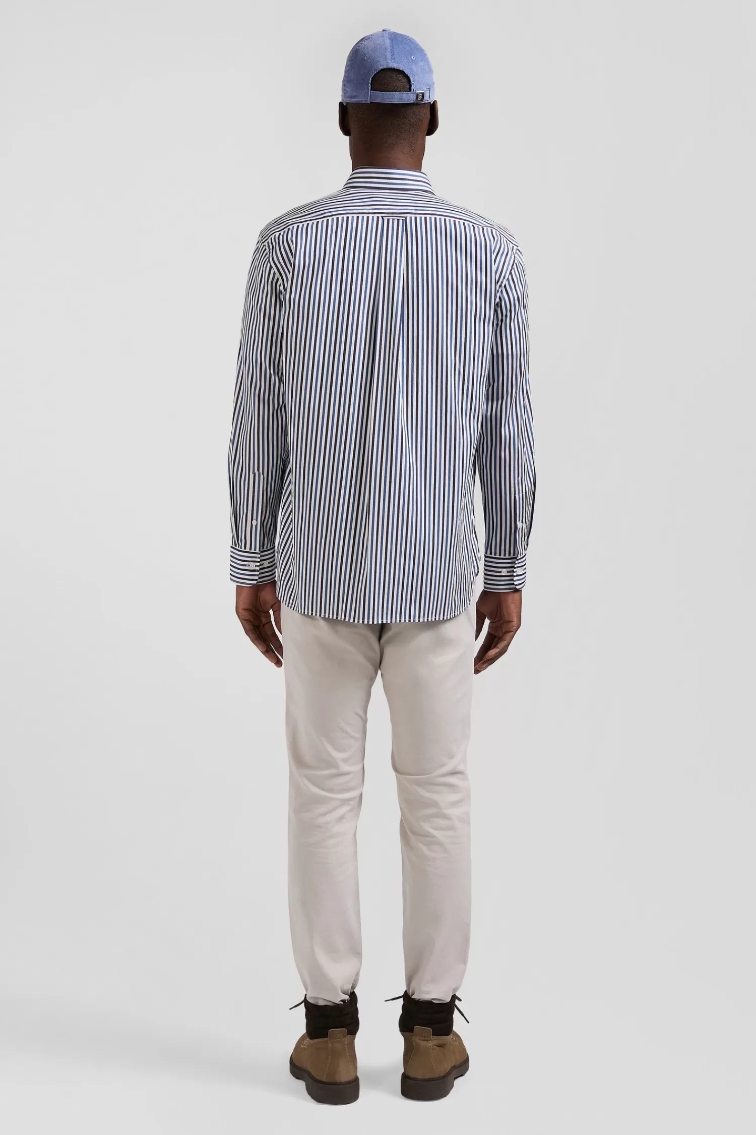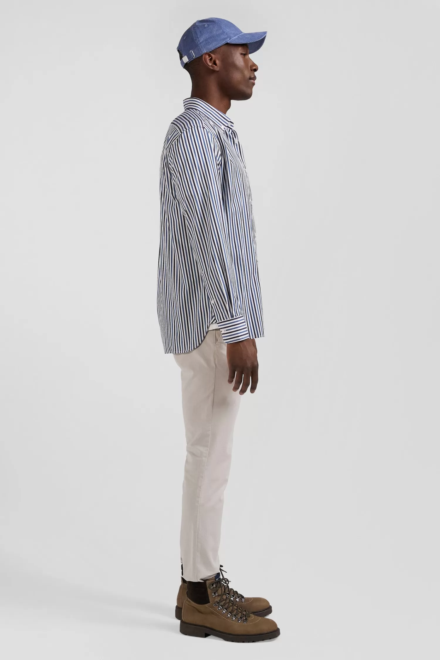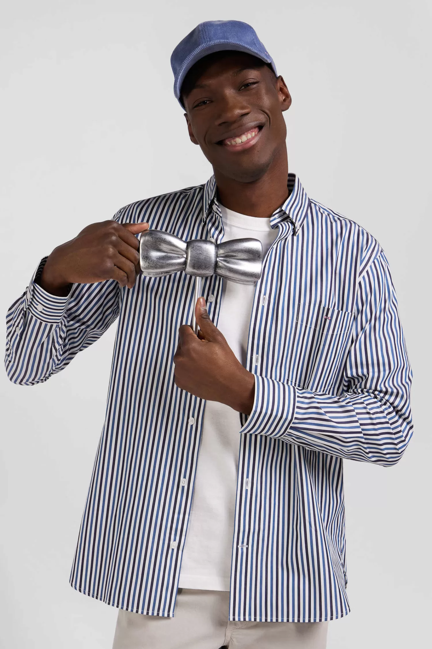 Our striped cotton poplin shirt is designed to fit all silhouettes thanks to its straight Regular fit. Its two-tone stick stripes will add a touch of dynamism to your outfit. The button-down collar ensures a snug fit, while the back pleat allows you to enjoy extra ease. Its bow tie embroidery on the chest pocket gives this men’s shirt a subtle touch of elegance. This modern classic is available for the season in a wide range of colours and can be paired with our chinos as well as straight jeans.