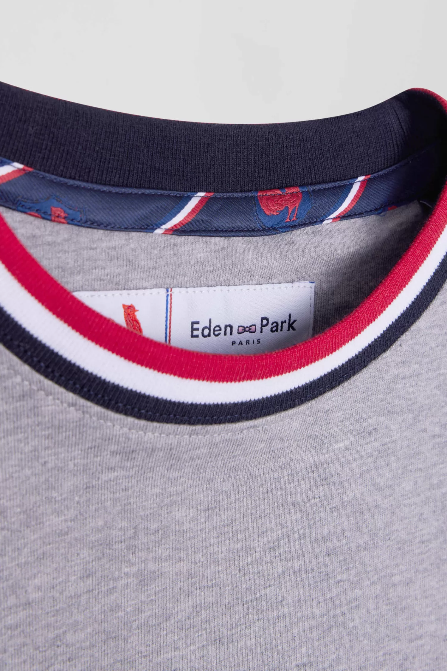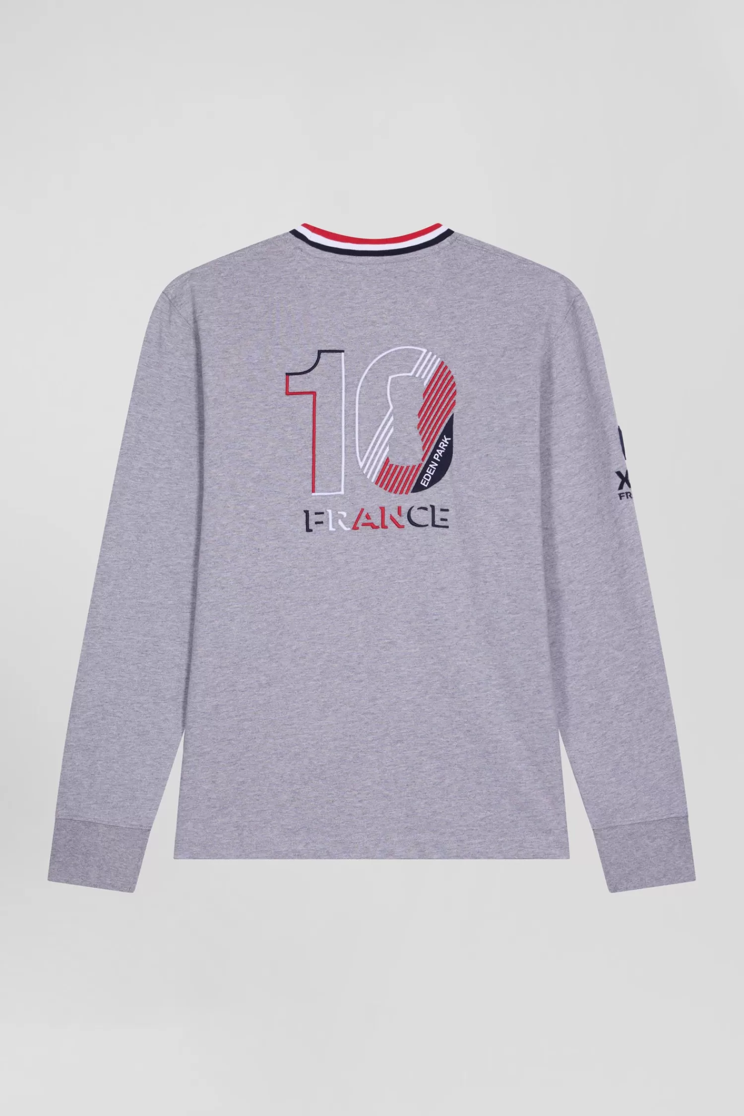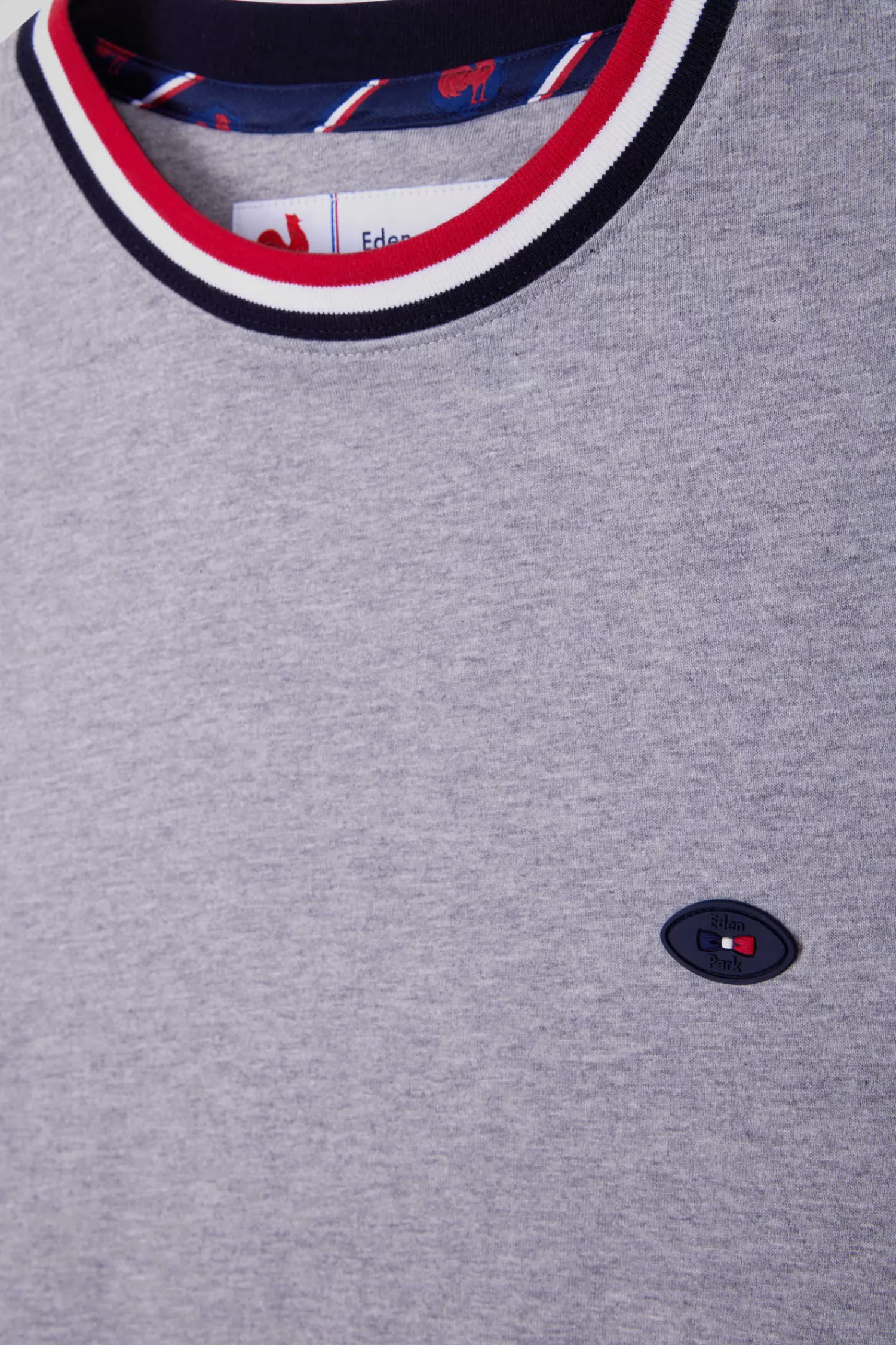 In symbiosis with the XV de France team, Eden Park creates clothing that reflects the spirit of rugby, combining elegance and functionality for everyday wear. This grey cotton jersey T-shirt with a collar highlighted with tricolour ribbing proudly features an embroidery featuring the French rooster on the back.