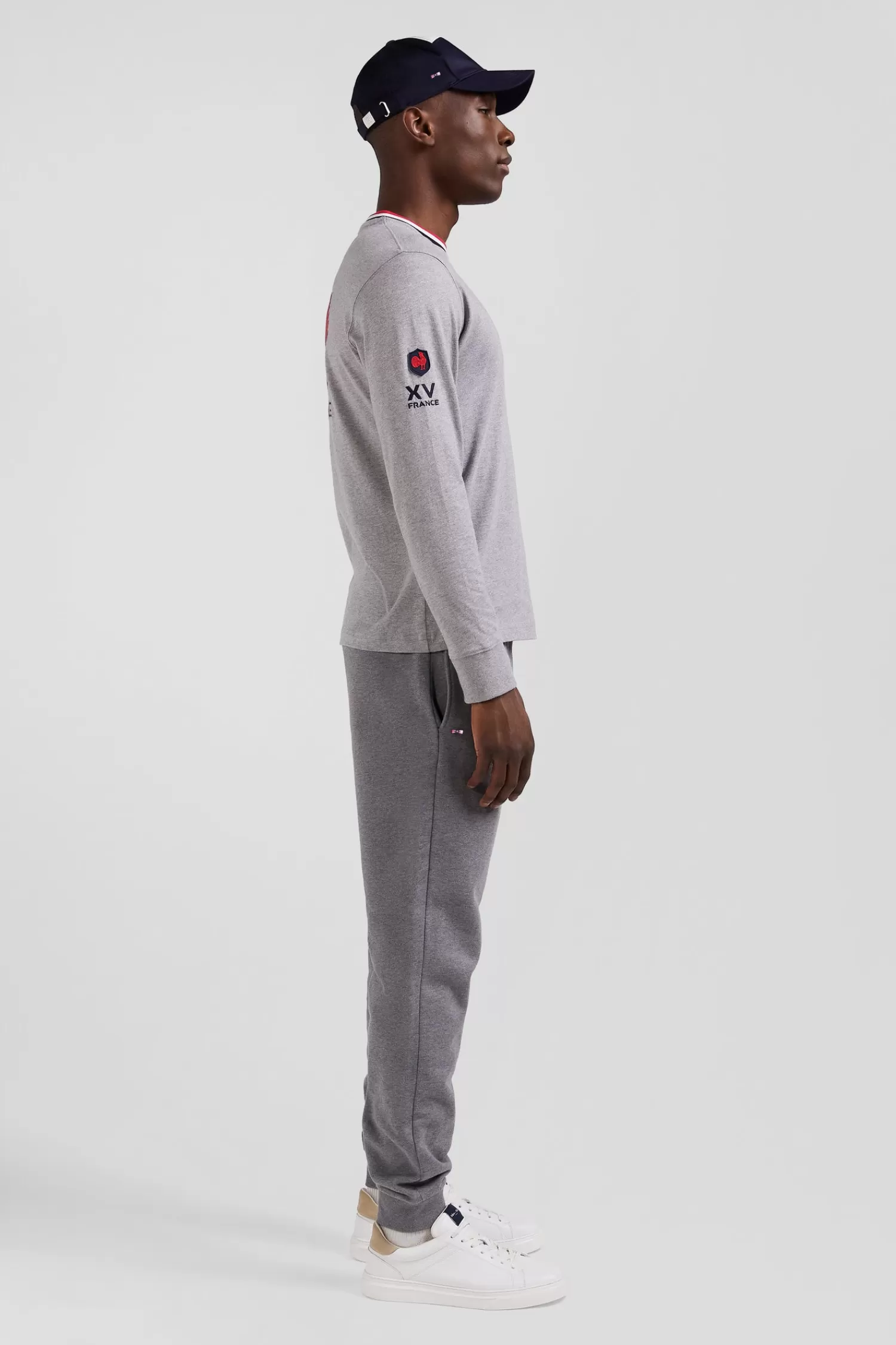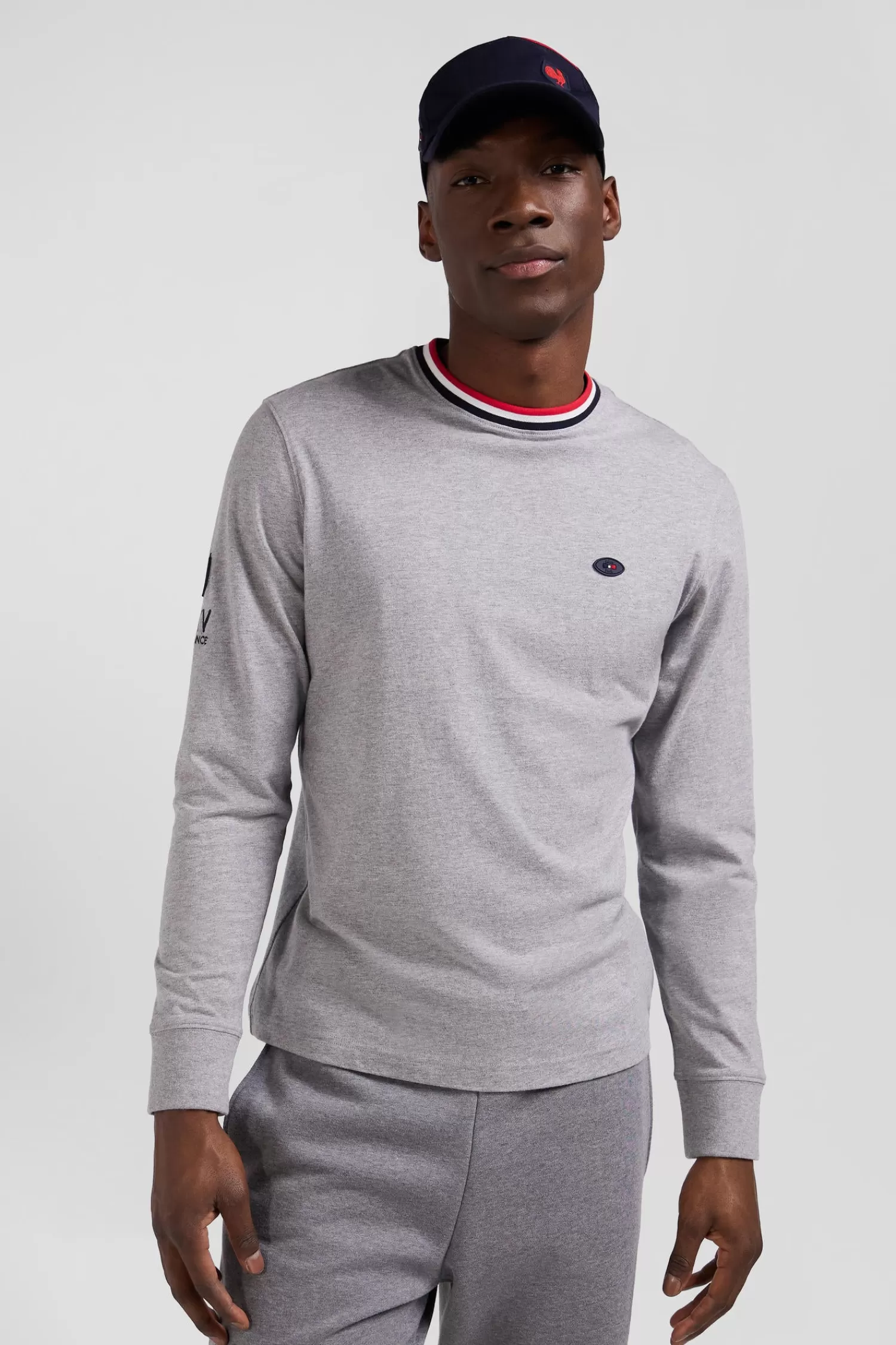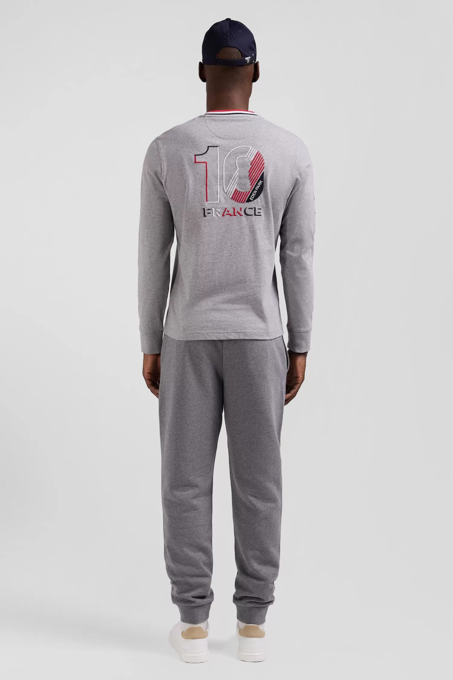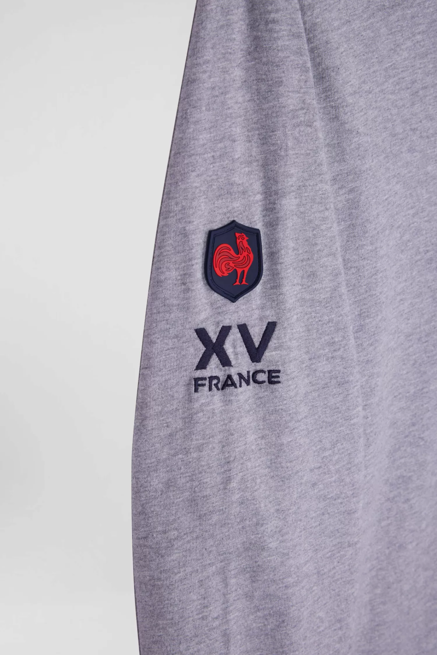 In symbiosis with the XV de France team, Eden Park creates clothing that reflects the spirit of rugby, combining elegance and functionality for everyday wear. This grey cotton jersey T-shirt with a collar highlighted with tricolour ribbing proudly features an embroidery featuring the French rooster on the back.