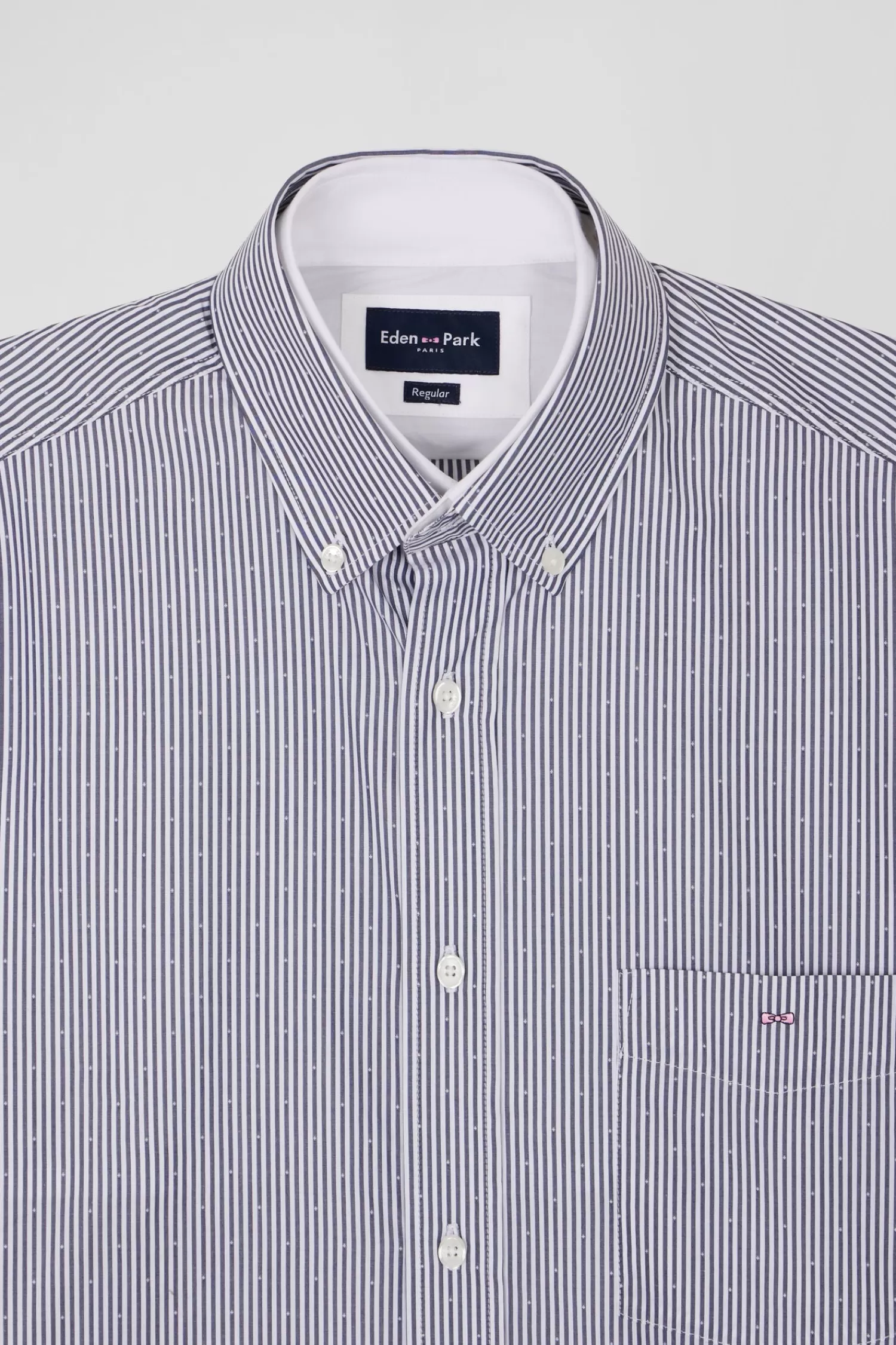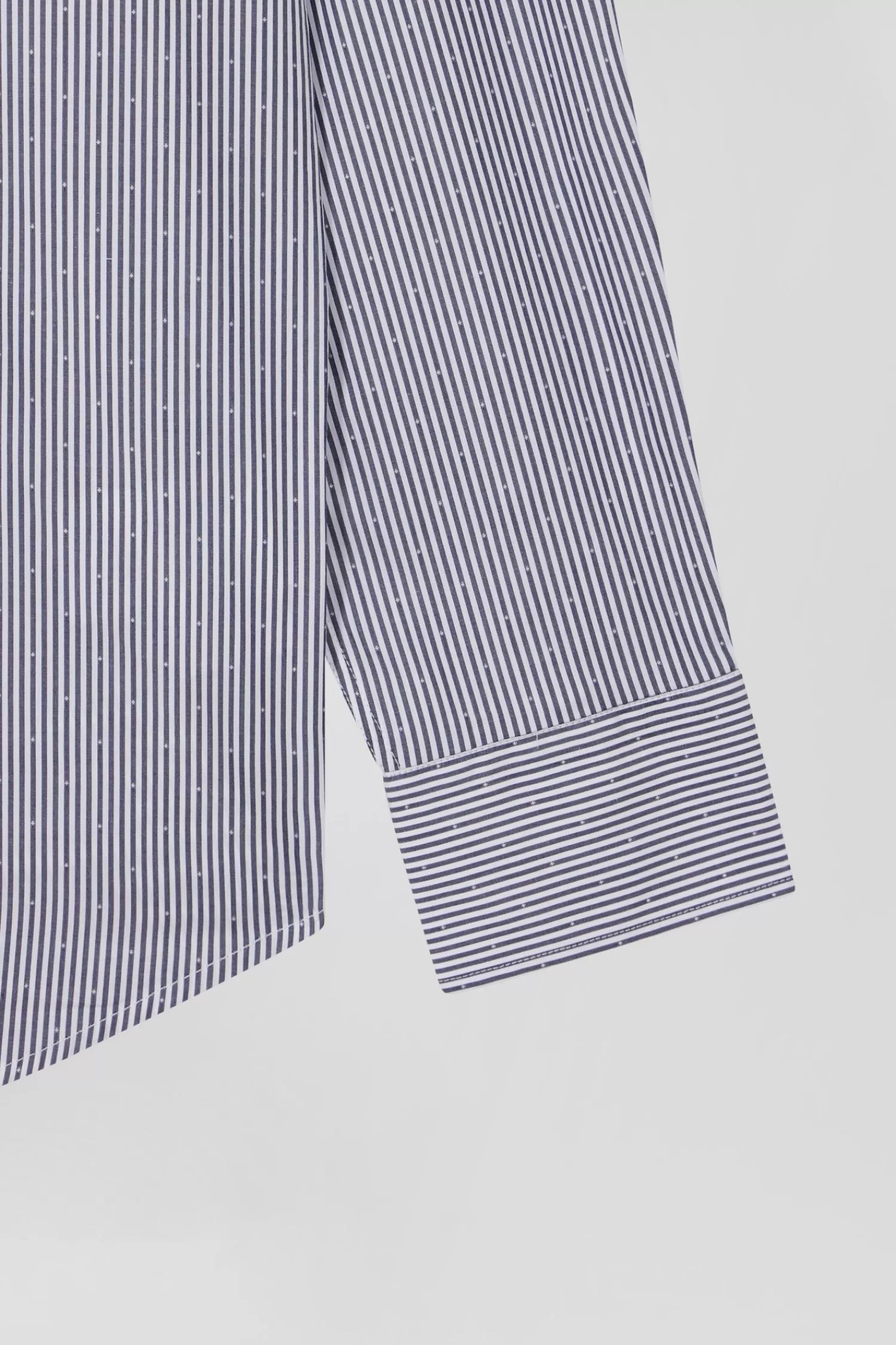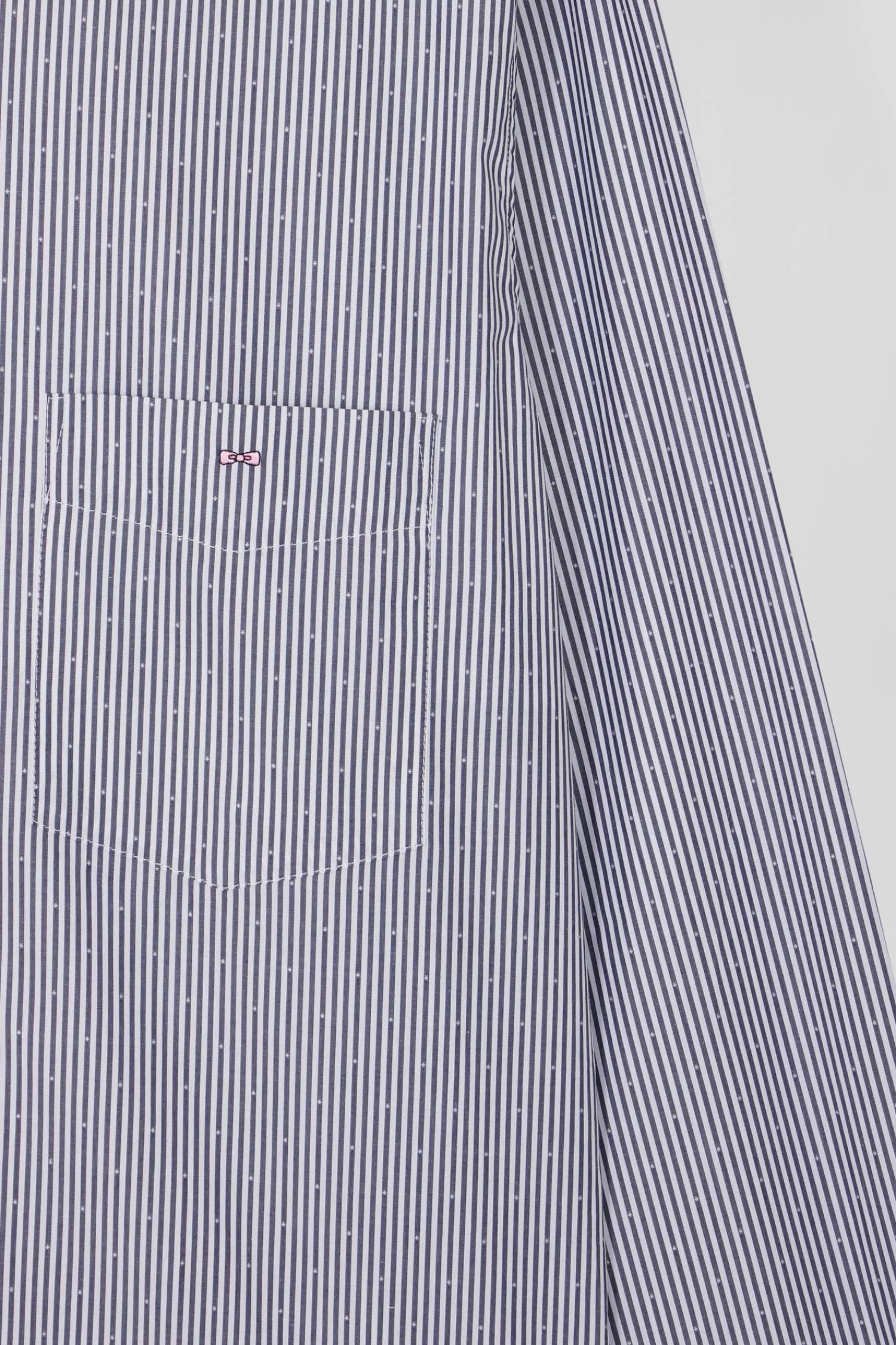 This elegant cotton jacquard shirt is available in two classic colours: navy and white or sky and white. Each version features thin baton stripes that add a touch of understated elegance to this timeless masculine garment. Cut in a straight Regular fit, this shirt features a double button-down collar and a pleat at the back for added comfort and mobility. Our delicately embroidered bow tie logo shows on the chest pocket.