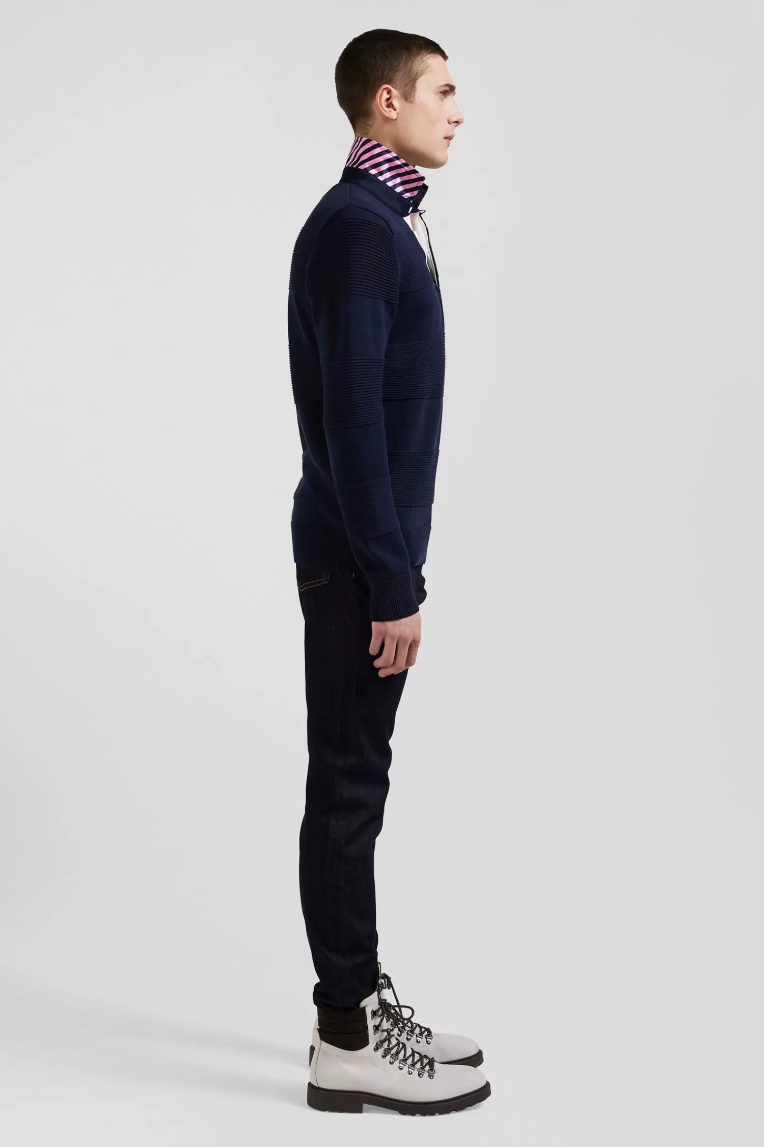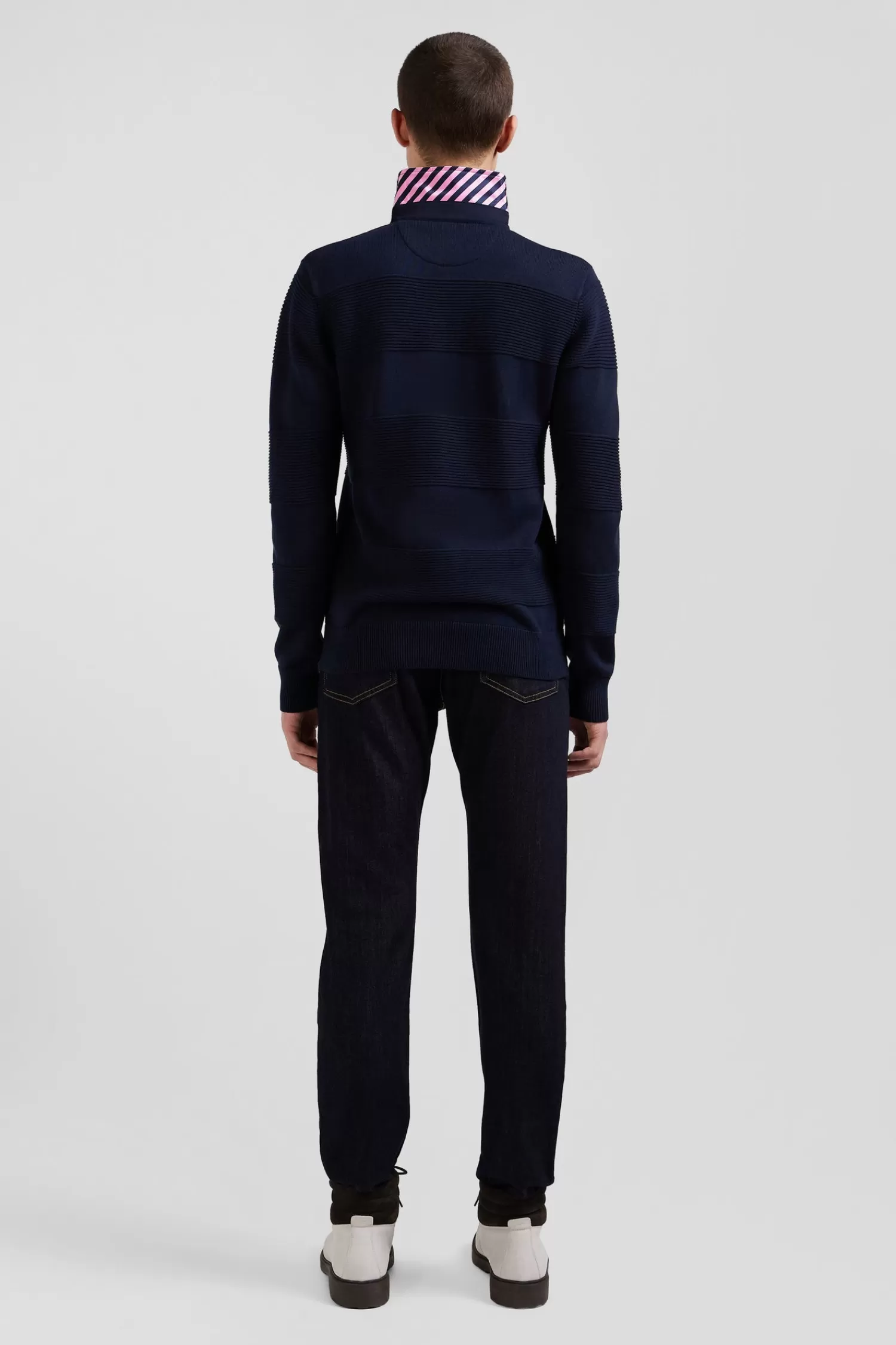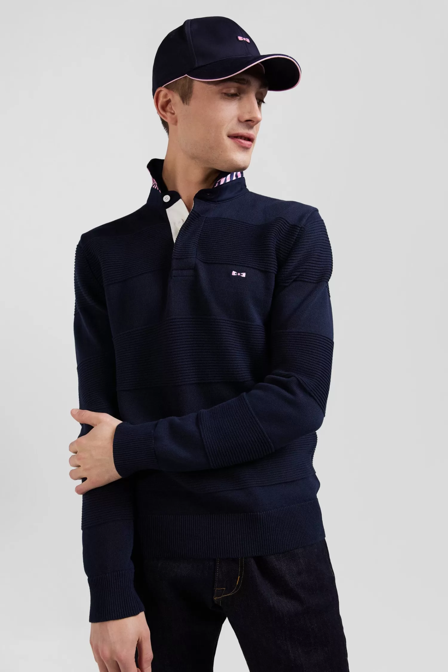 Face cool days in style in this cotton polo-neck jumper, featuring a white button placket underlay. Designed for comfort and style, this men’s sweater is crafted from quality cotton knitted in varied reliefs, inspired by the striping of rugby jerseys.