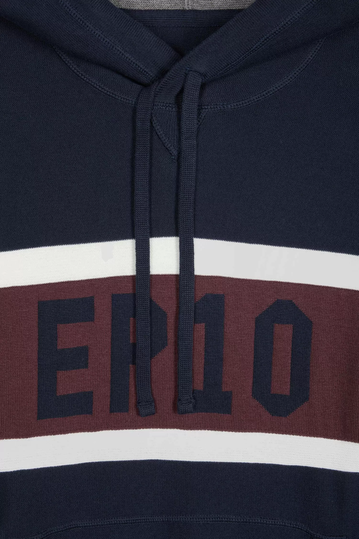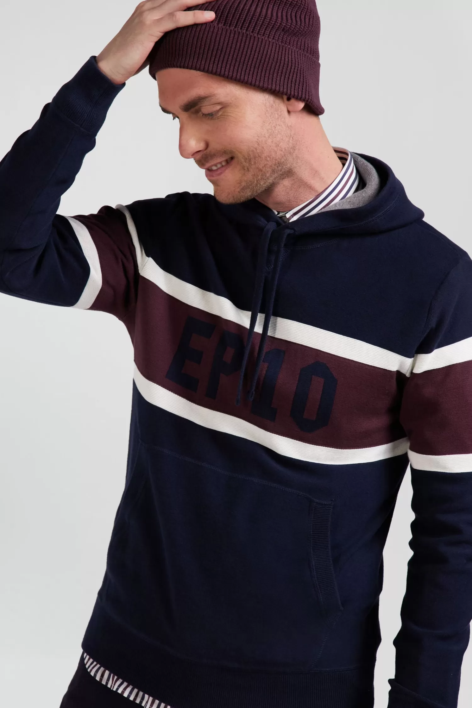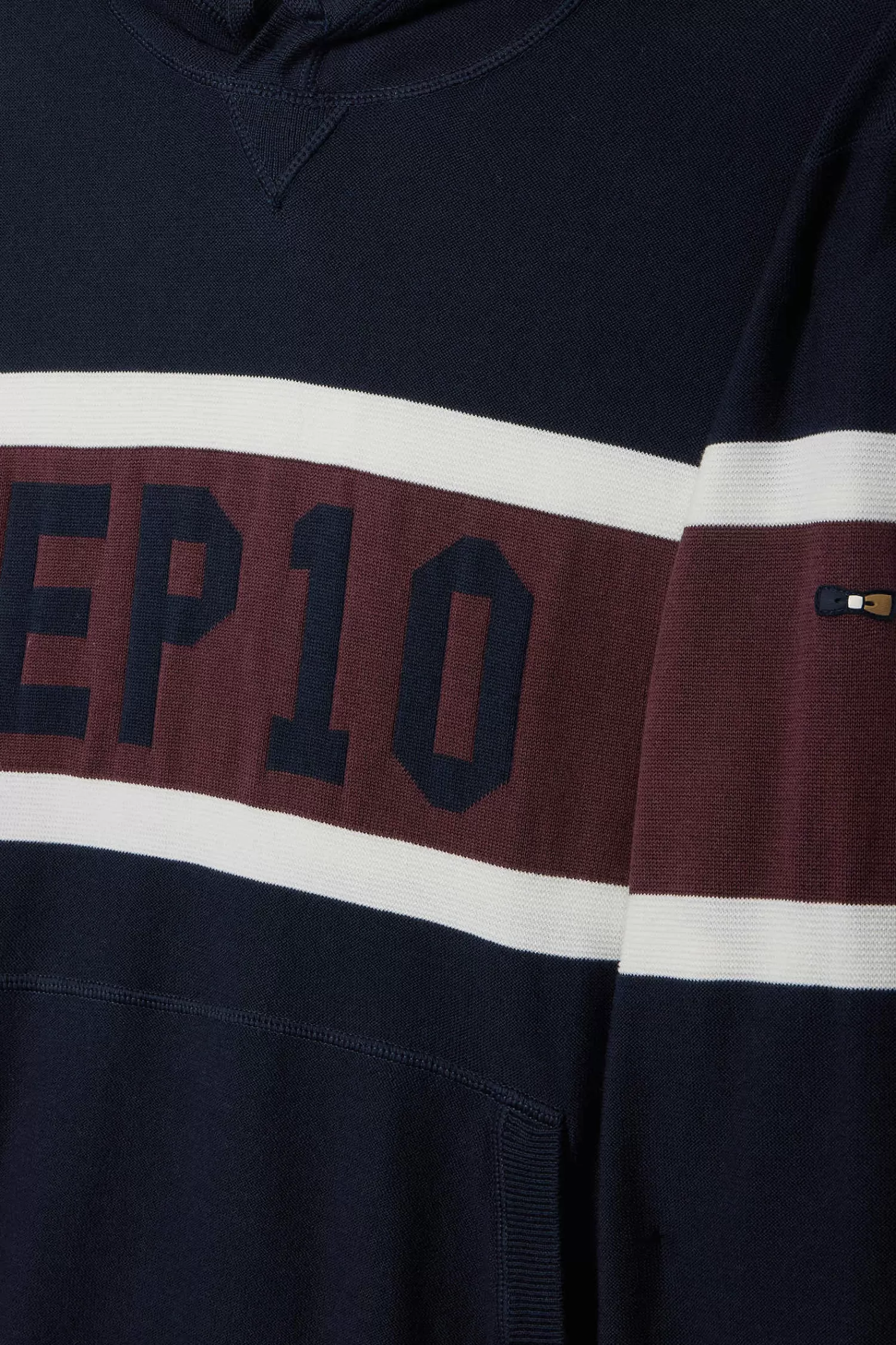 Elevate your casual outfits with this hooded jumper, which skillfully blends contrasting knit patterns for a dynamic visual effect. A jacquard band on the chest highlights the EP 10 logo. Inspired by sweatshirts, it features ribbed finishes, an integrated hood, jersey body, and reverse rugby shirt half-moon, merging style and comfort perfectly.