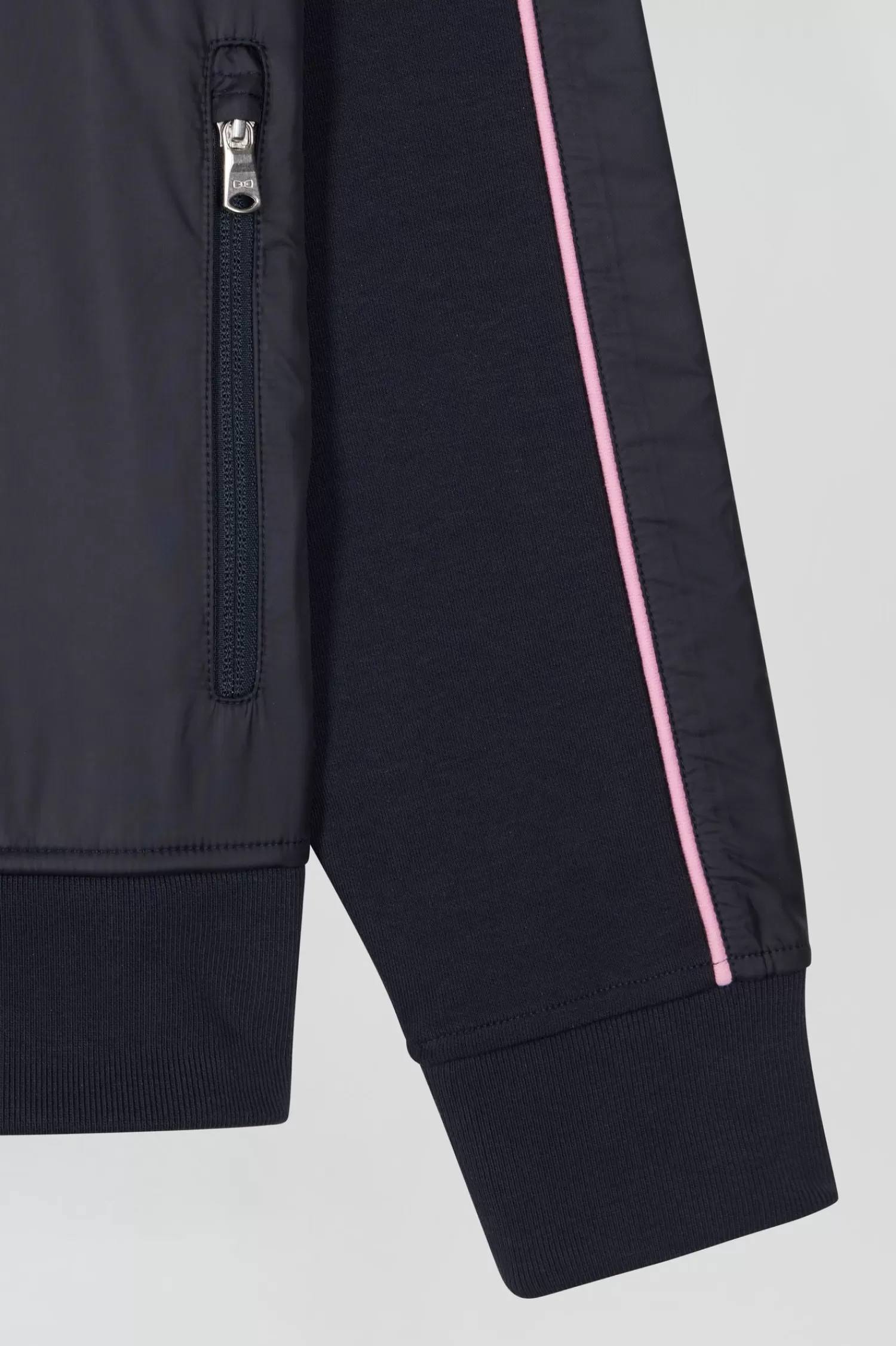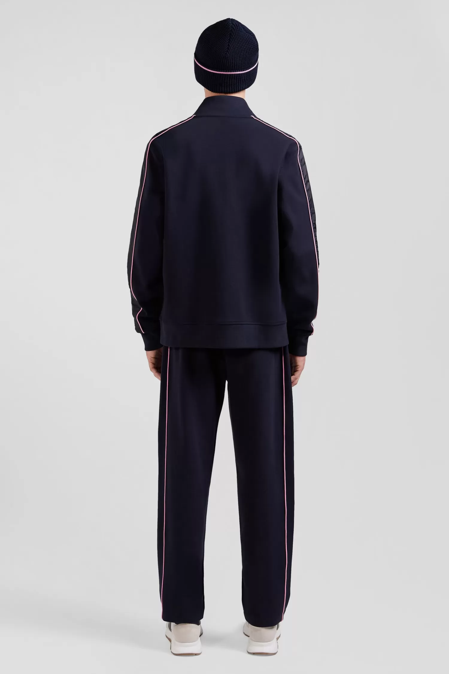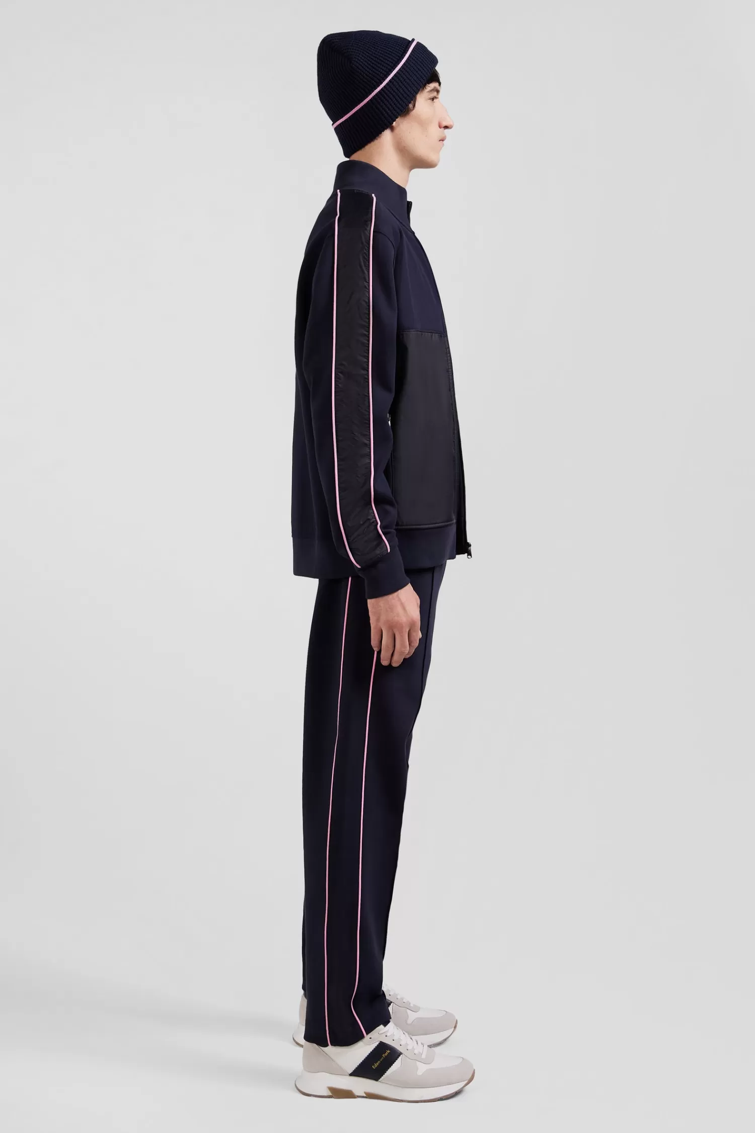 This zip-up sweatshirt with a high collar in interlock is distinguished by nylon inserts on the sleeves and front, accented with elegant pink piping. Its zipped stand-up collar and silver metallic finishes with the name of our Maison add a touch of refinement to this modern and functional garment.