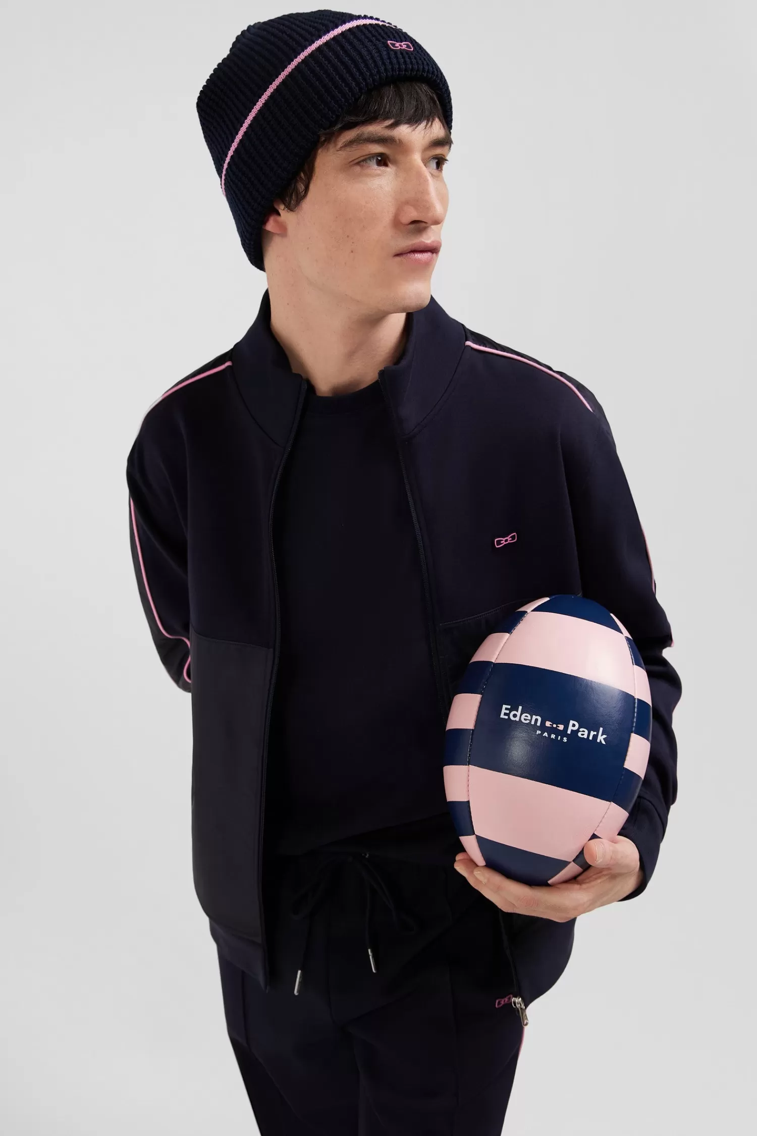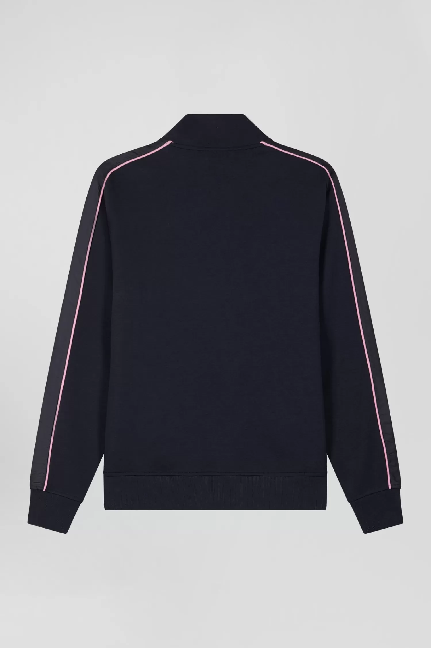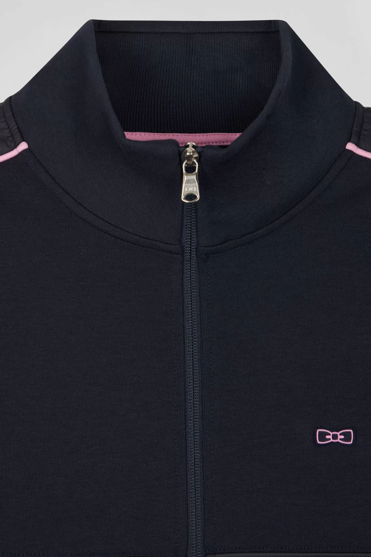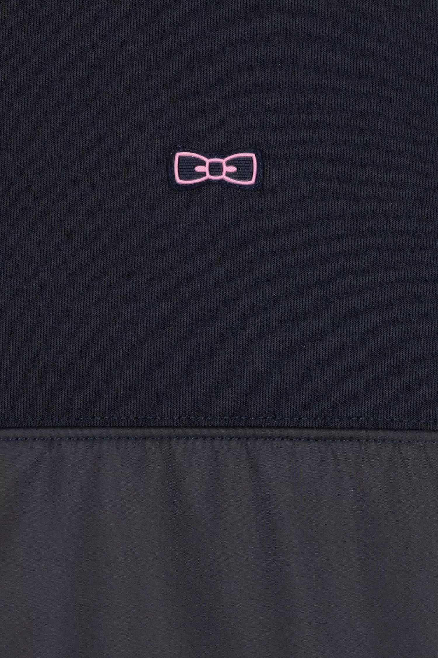 This zip-up sweatshirt with a high collar in interlock is distinguished by nylon inserts on the sleeves and front, accented with elegant pink piping. Its zipped stand-up collar and silver metallic finishes with the name of our Maison add a touch of refinement to this modern and functional garment.