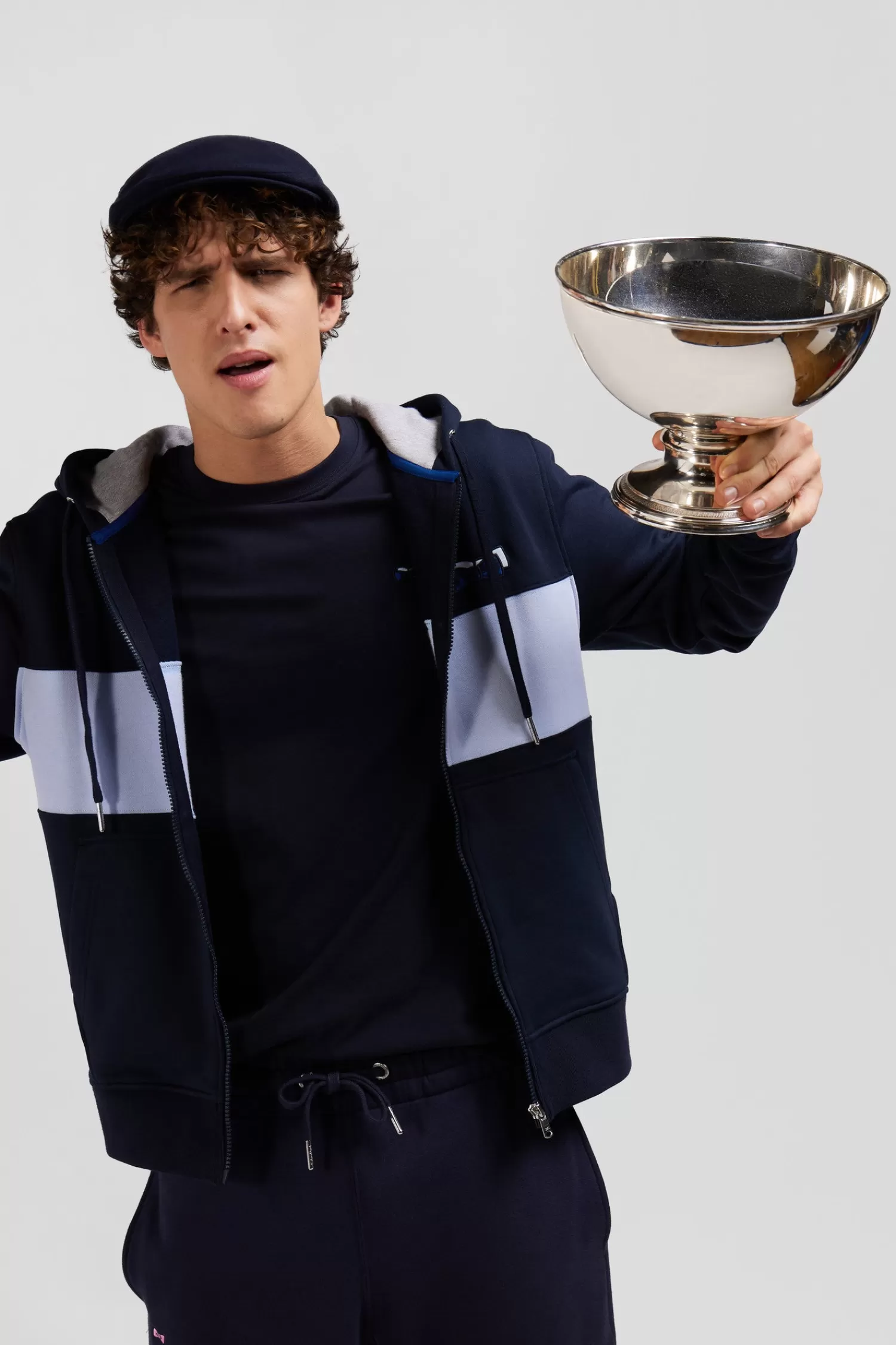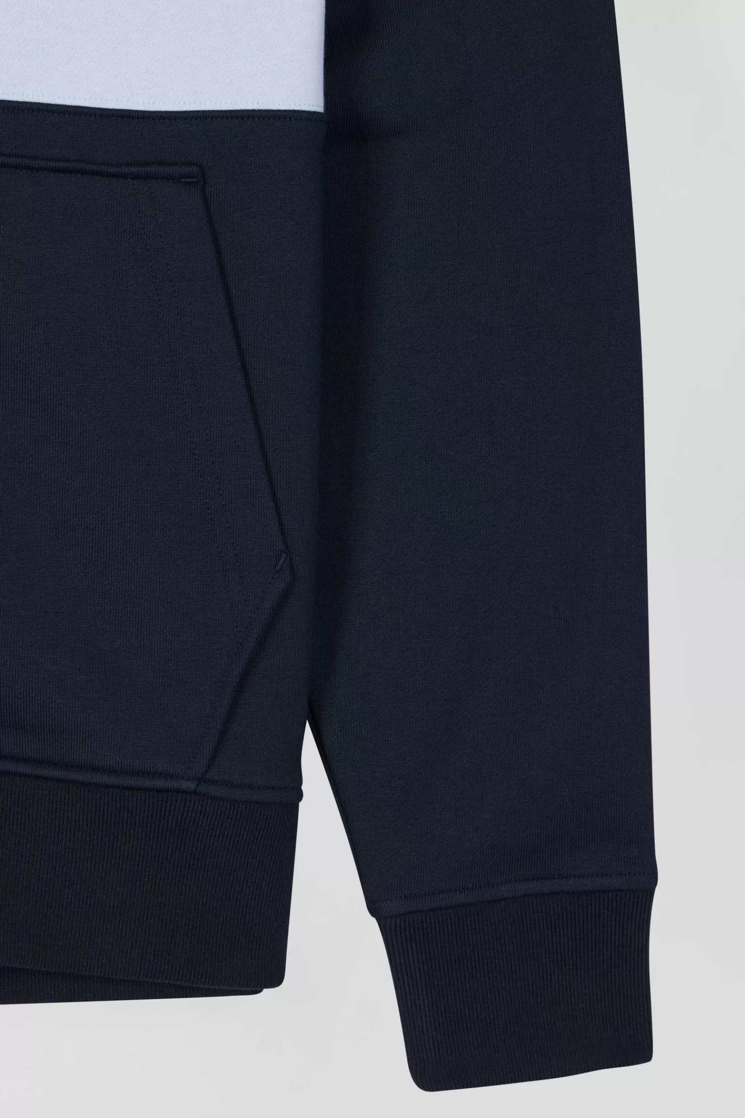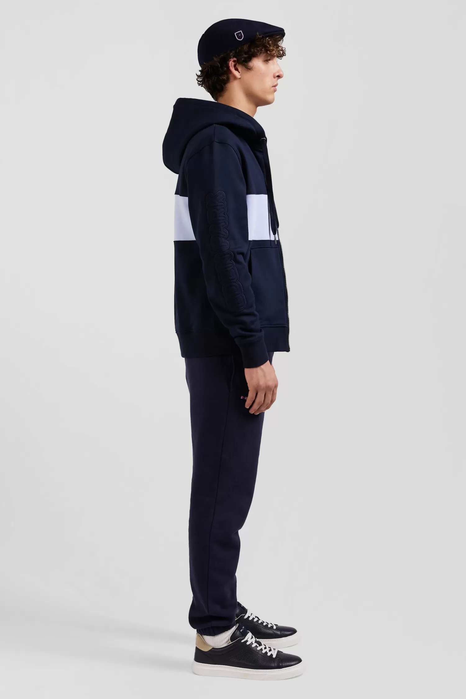 This zip-up hooded sweatshirt in brushed fleece combines comfort and style with an original chest band and quilted embroidery on the sleeve. The hood’s grey marled interior adds a contrasting touch, enhanced by metallic finishes on the adjustment cords and a colored jersey taping for a contemporary look.